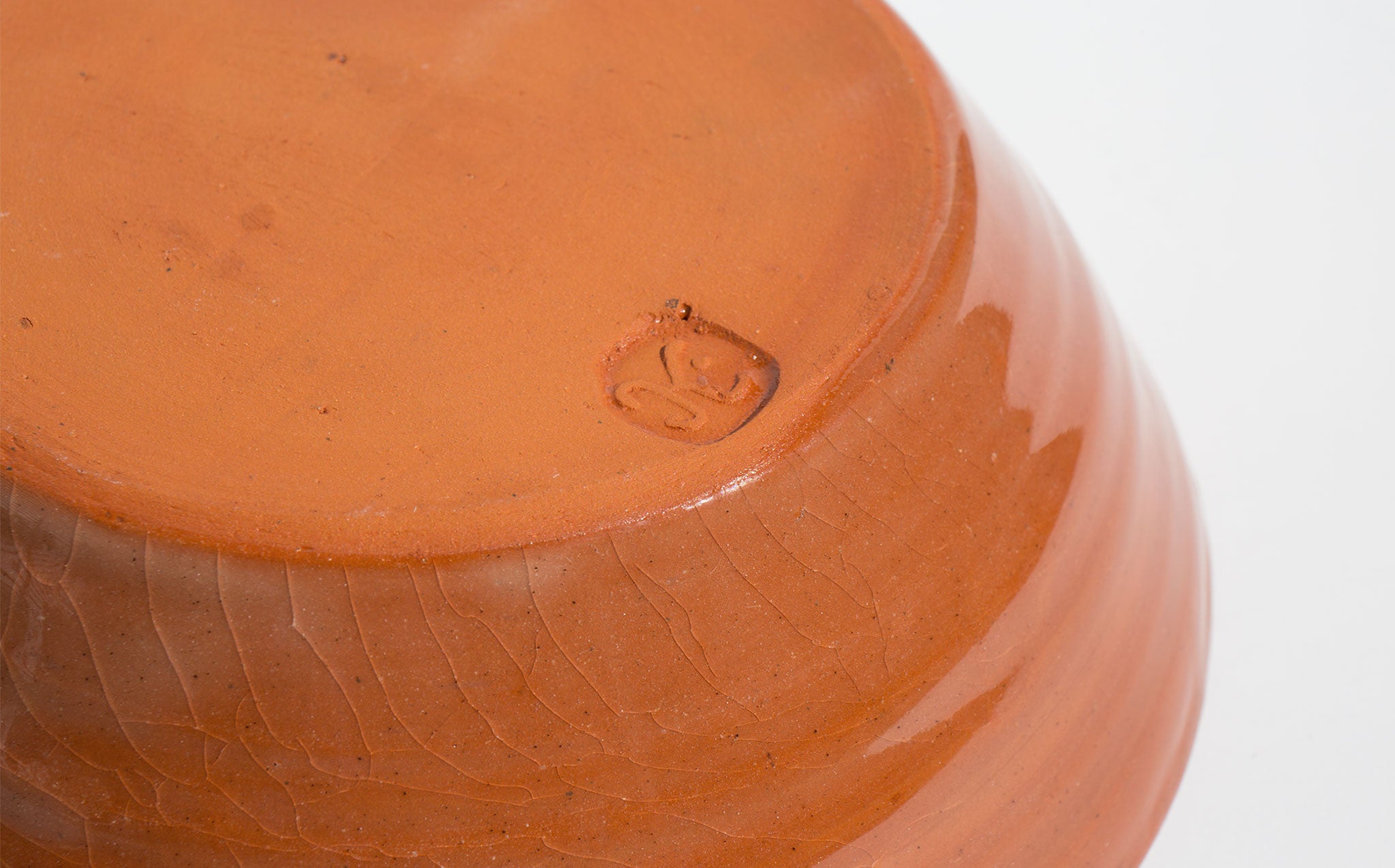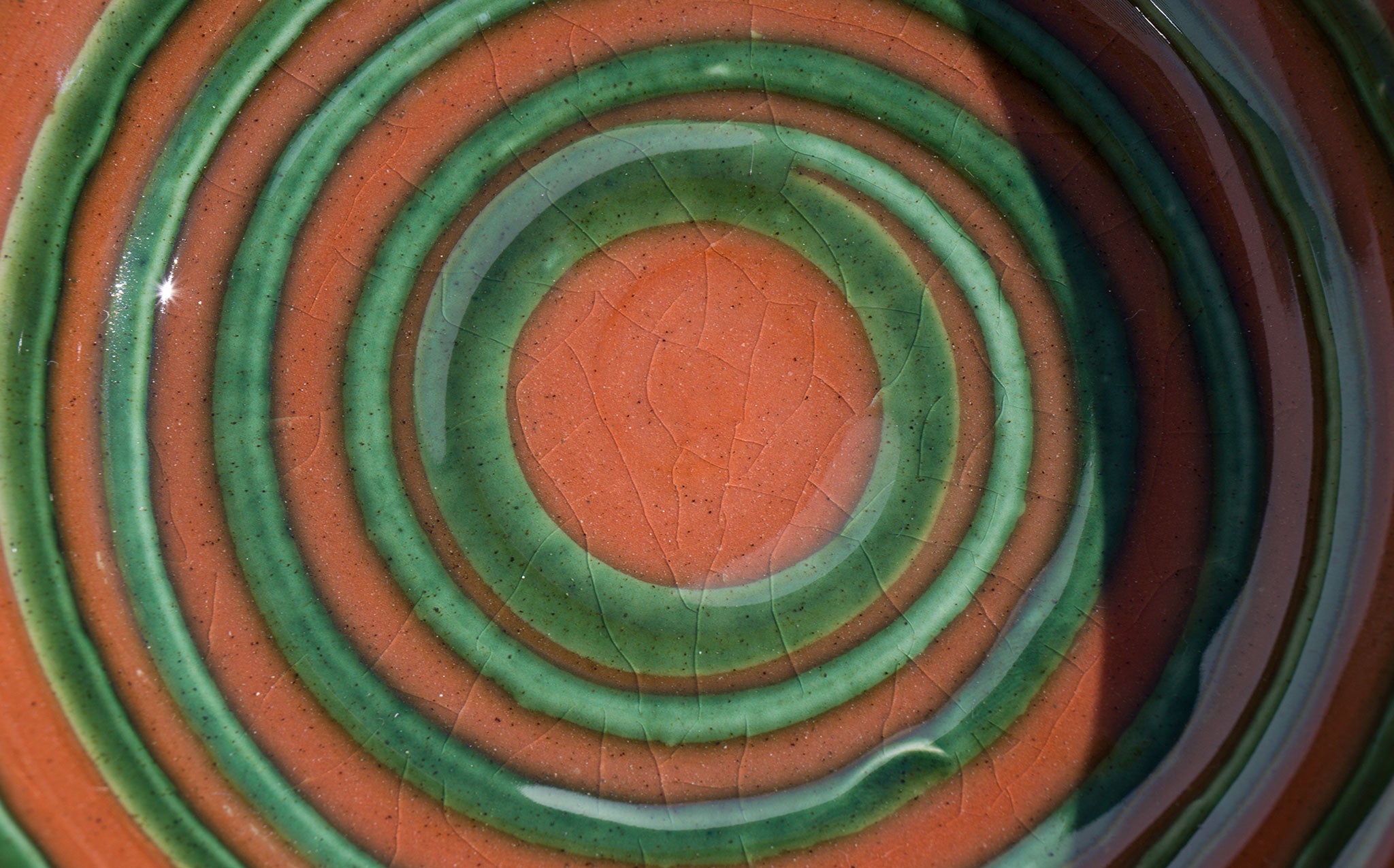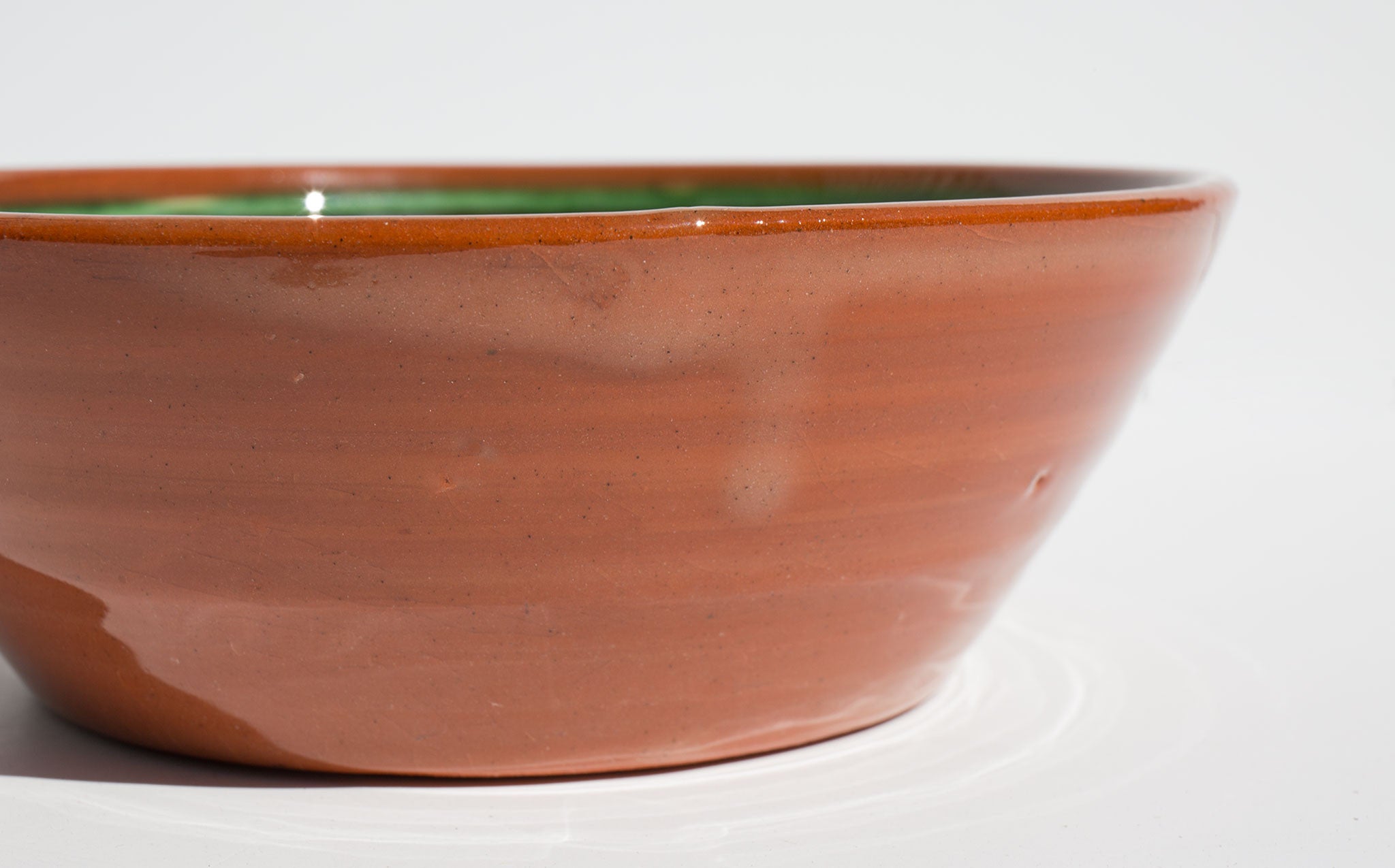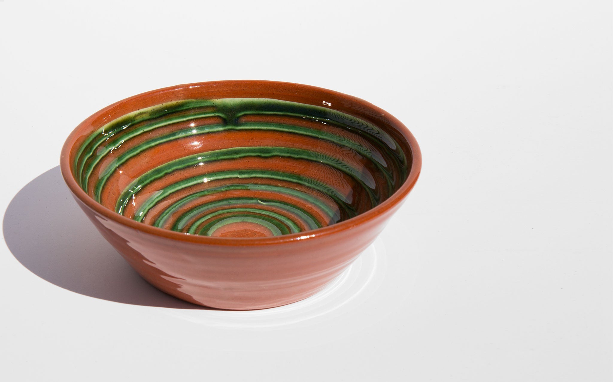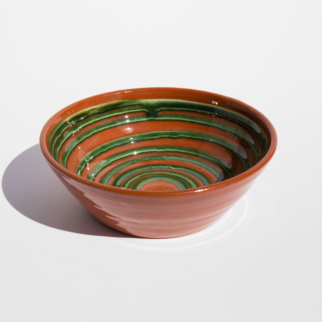 Hand glazed red clay bowl with grass green swirl accent. Made in Finland.