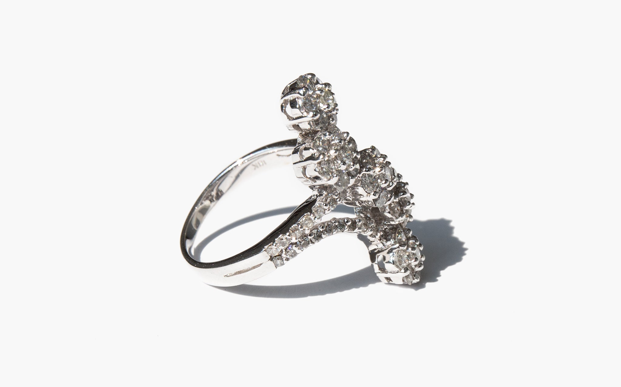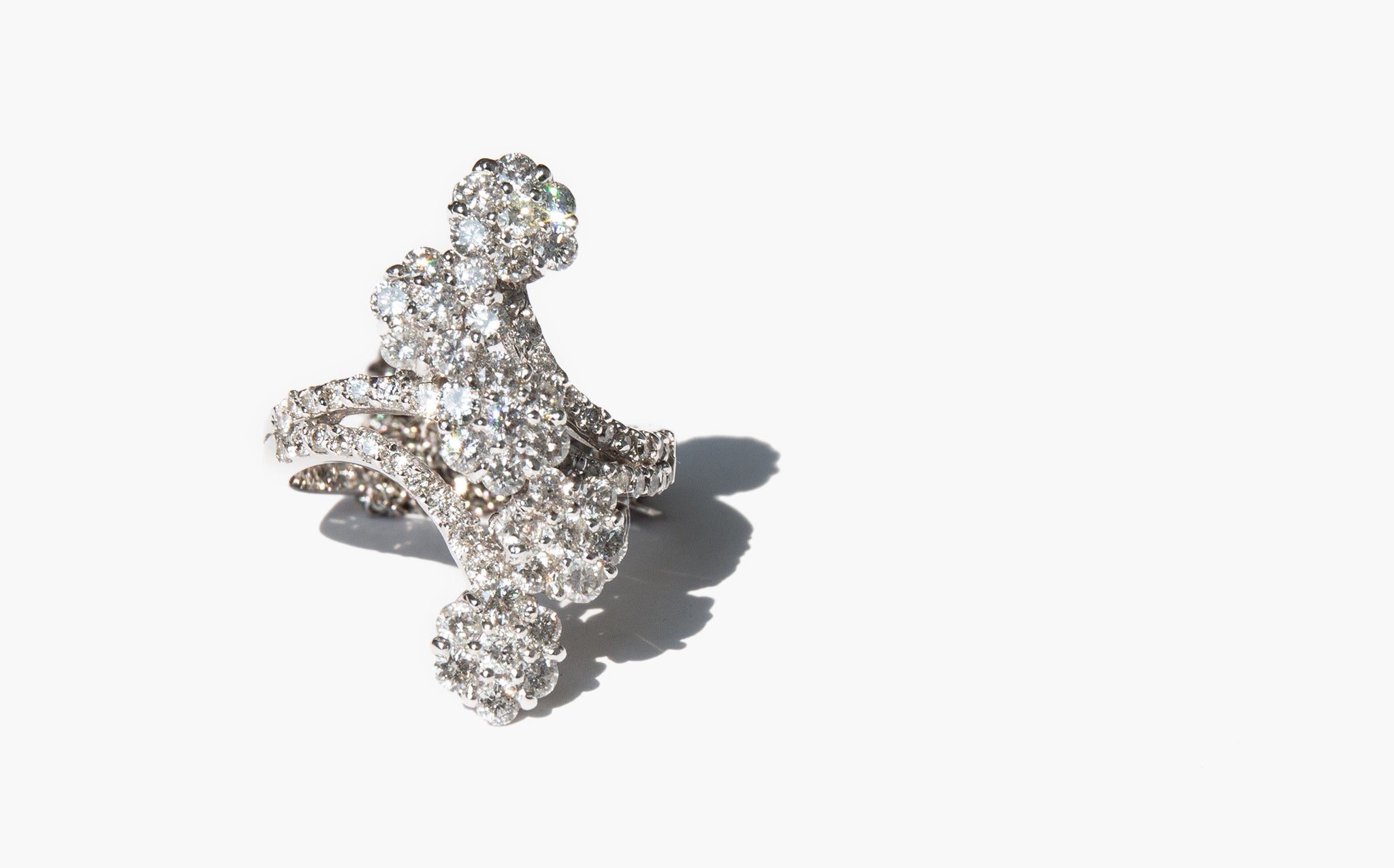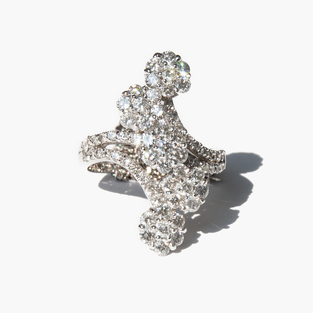 Radiant and scintillating 18k gold floral ring studded with 1.5 carats of shimmering diamonds.