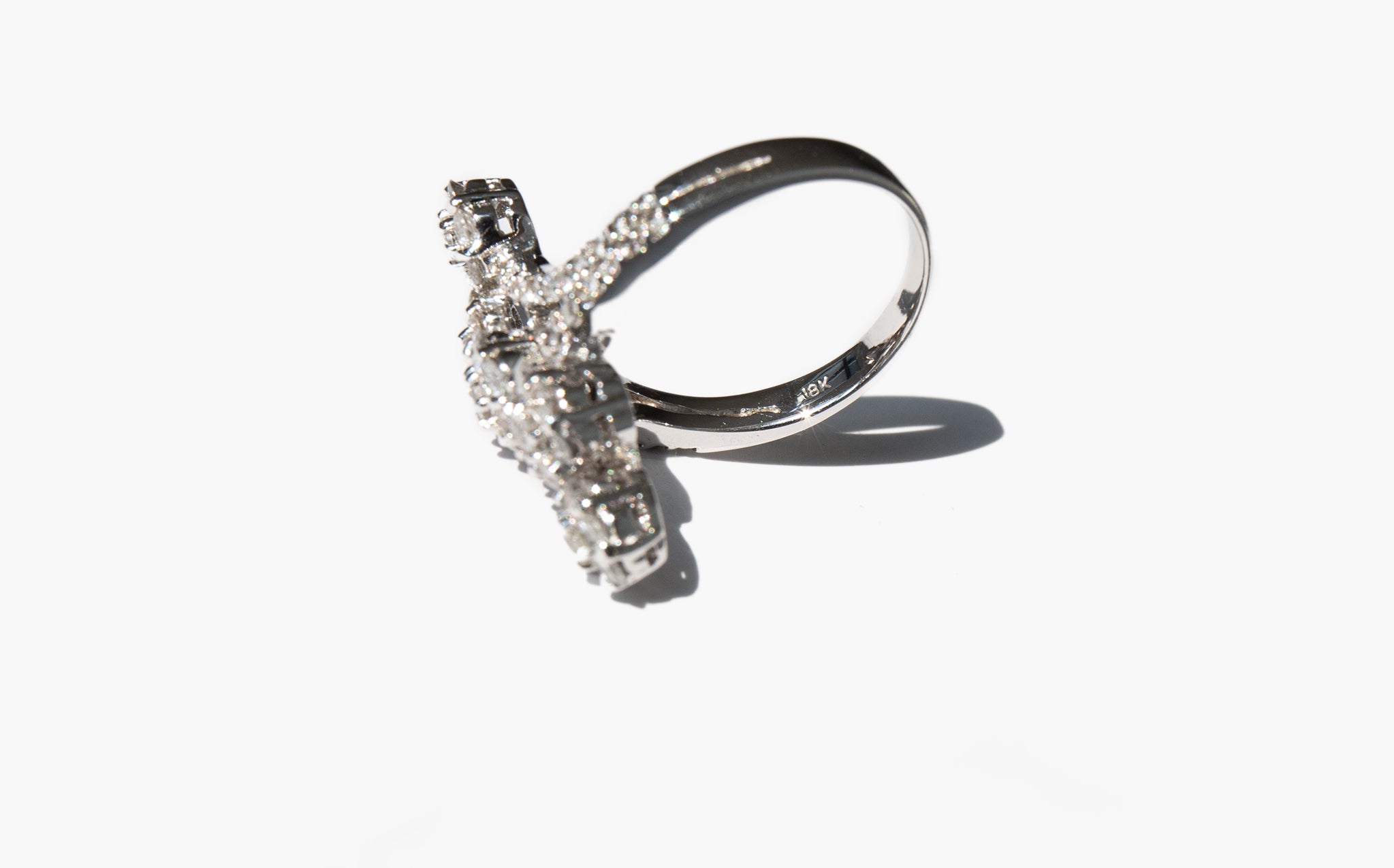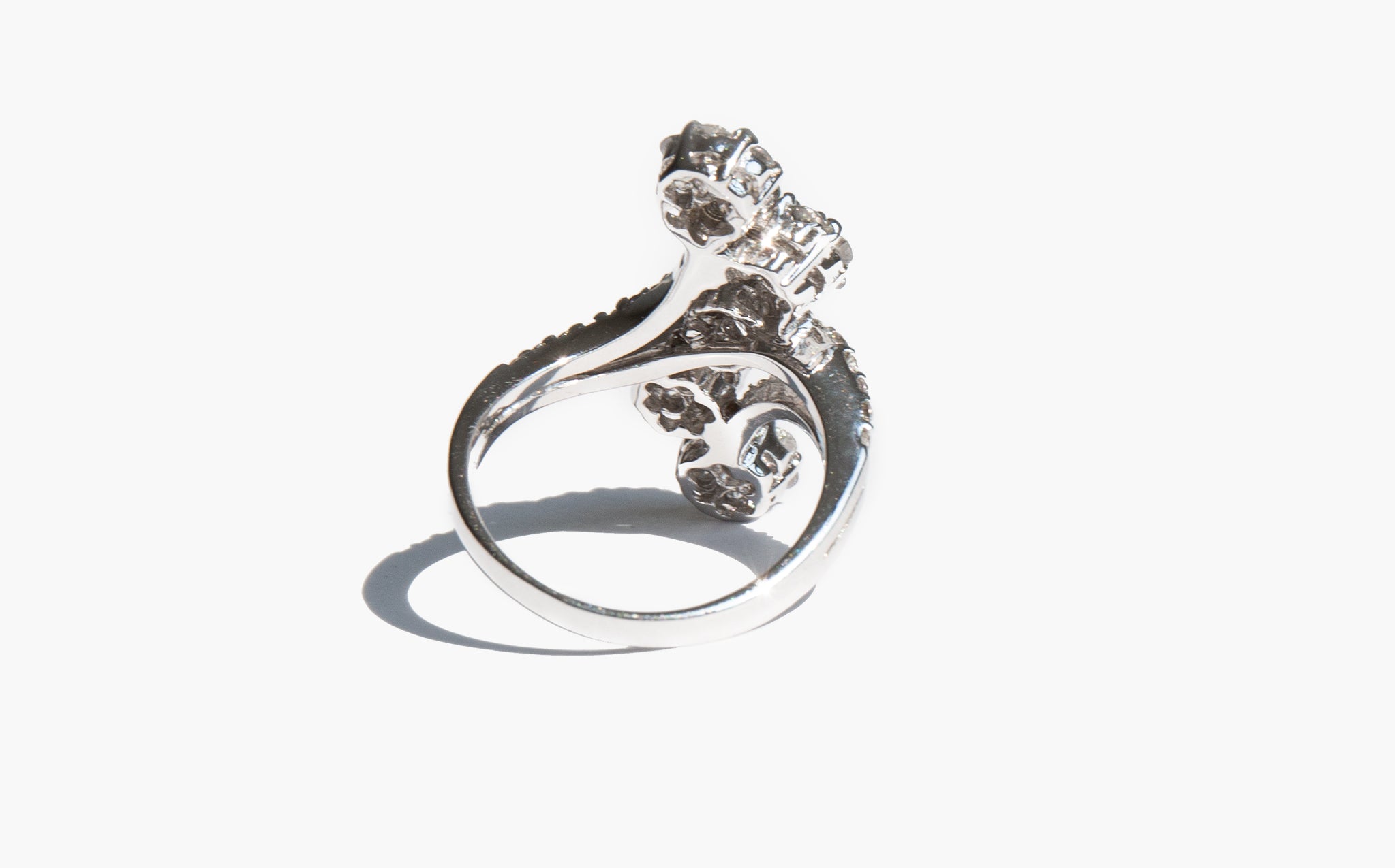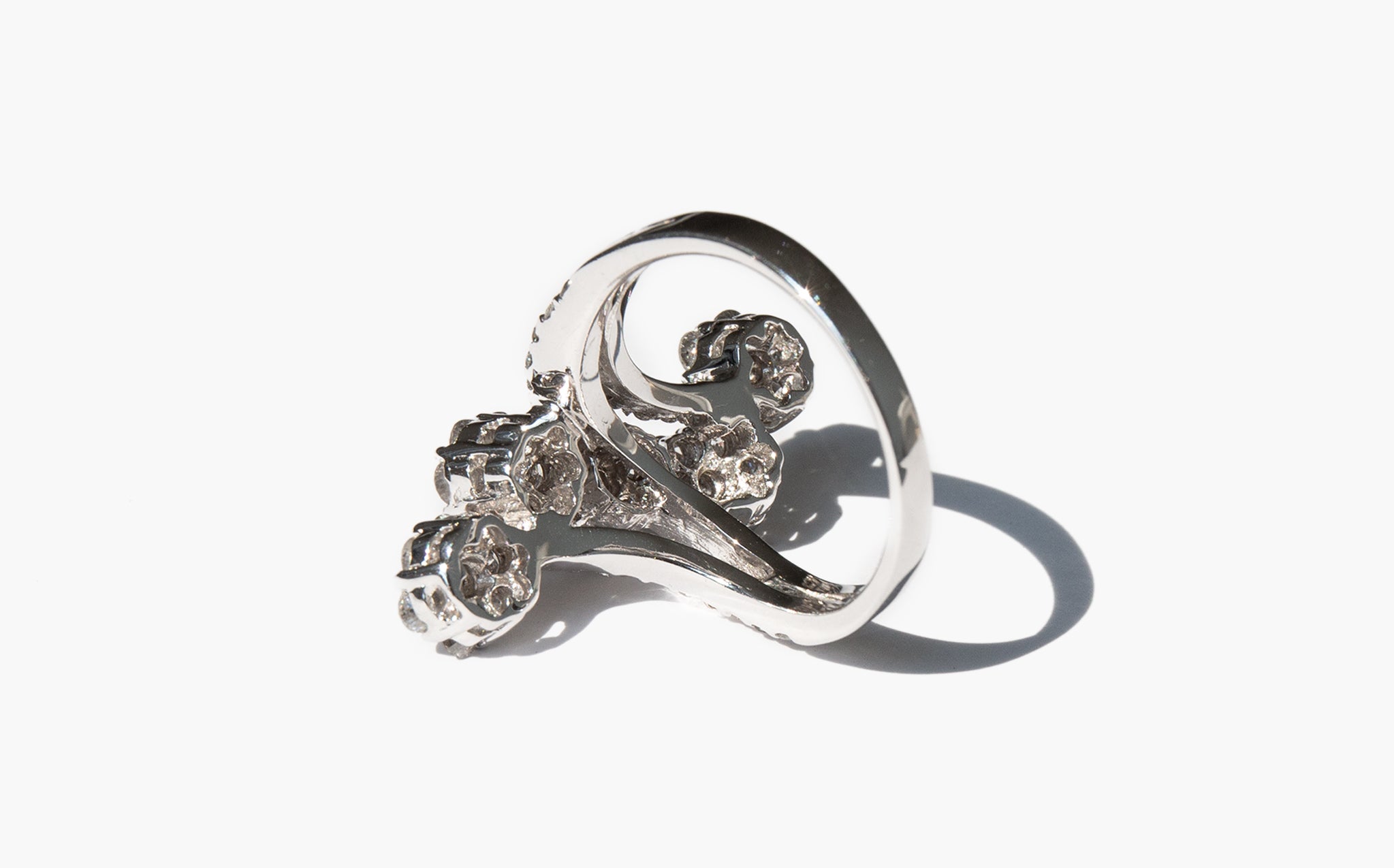 Radiant and scintillating 18k gold floral ring studded with 1.5 carats of shimmering diamonds.
