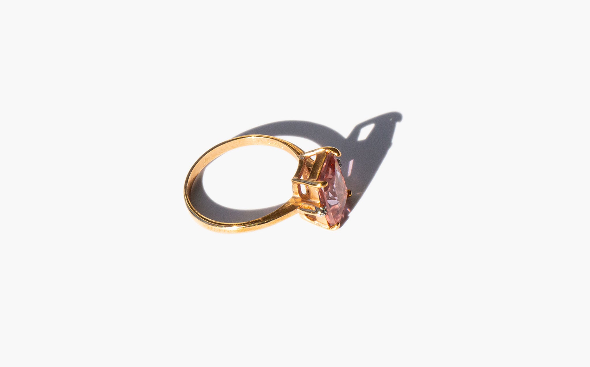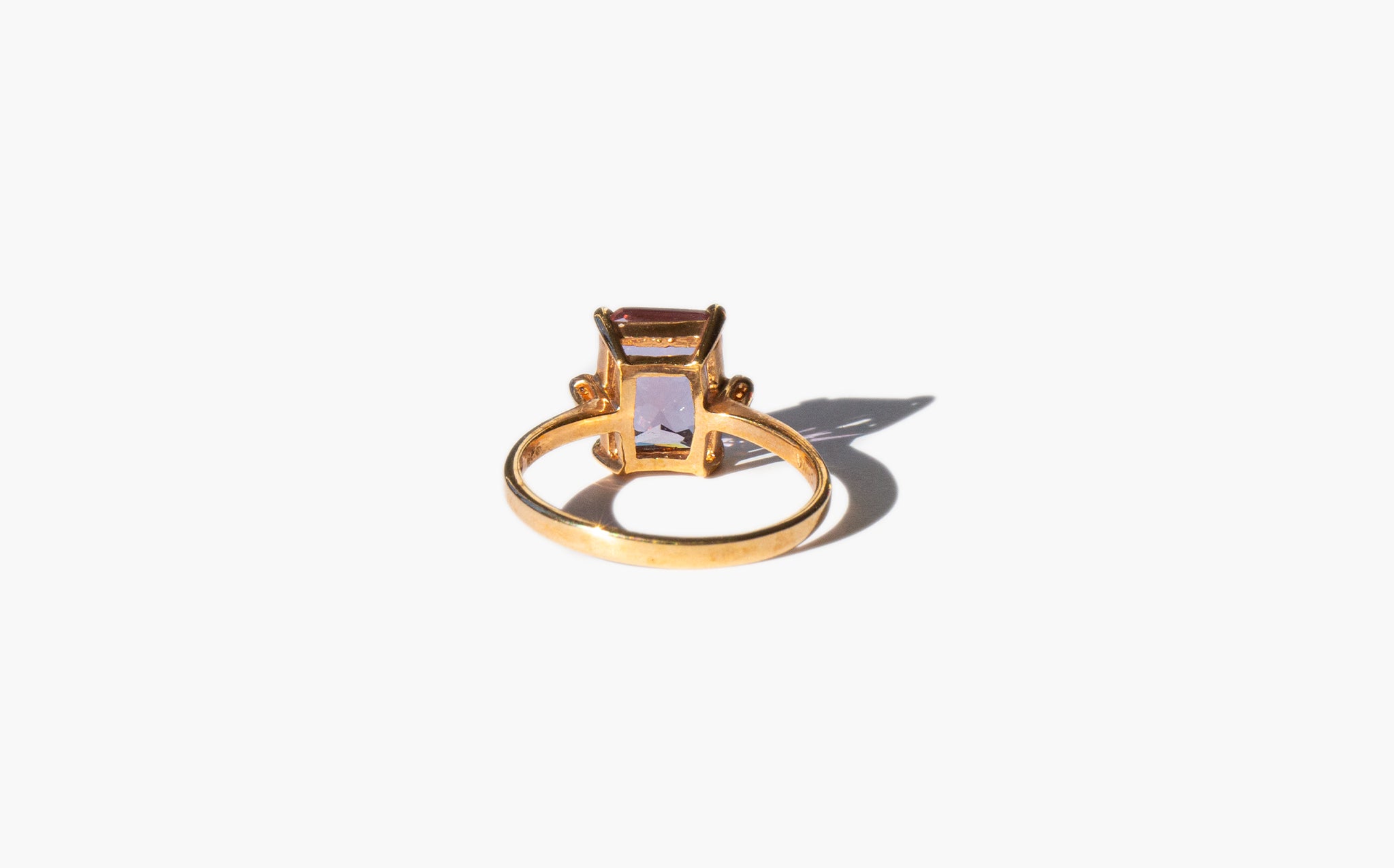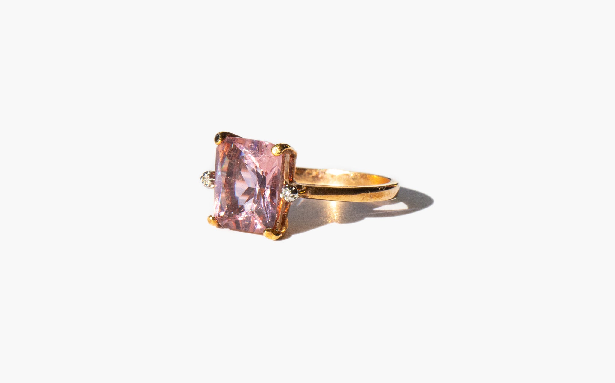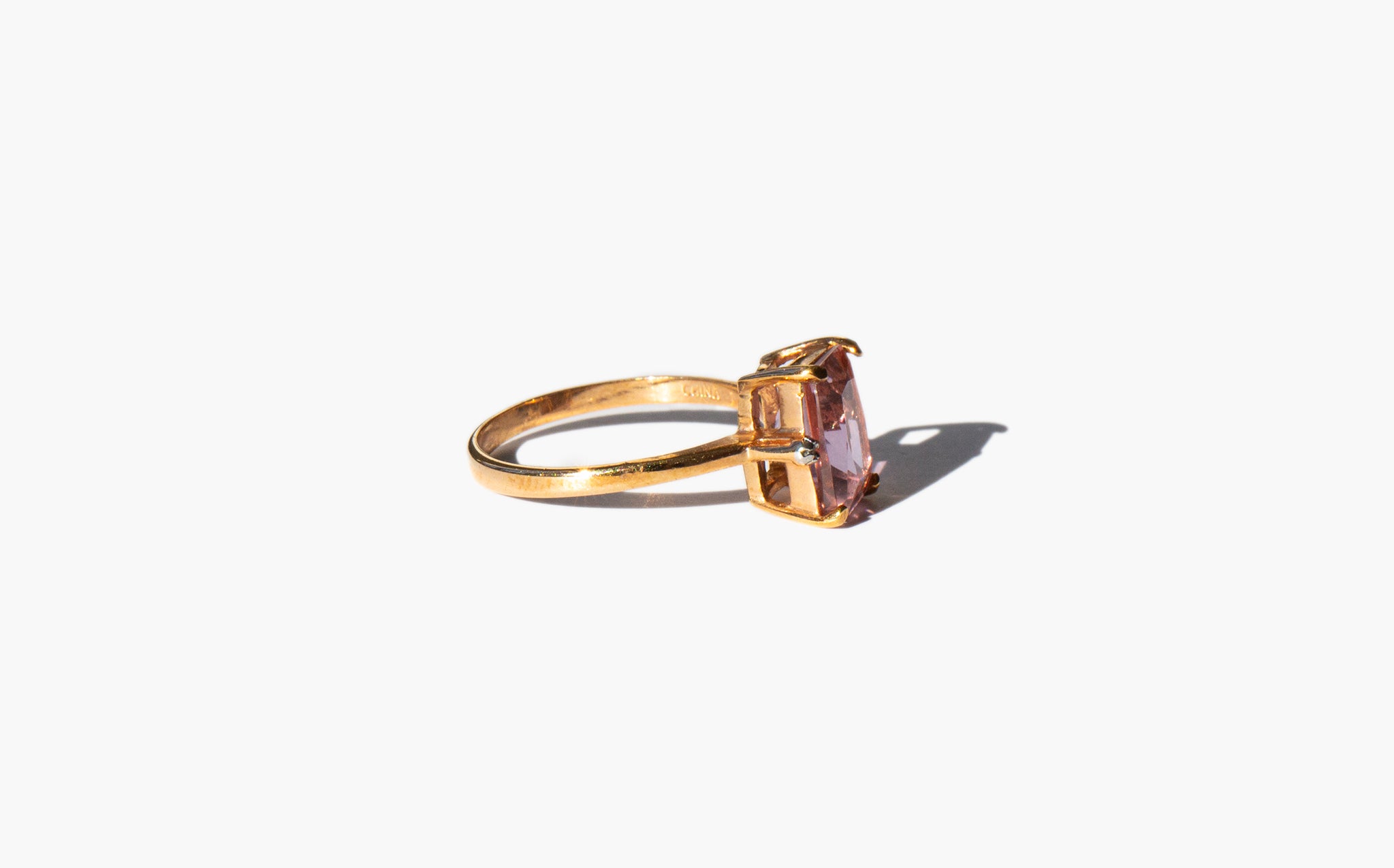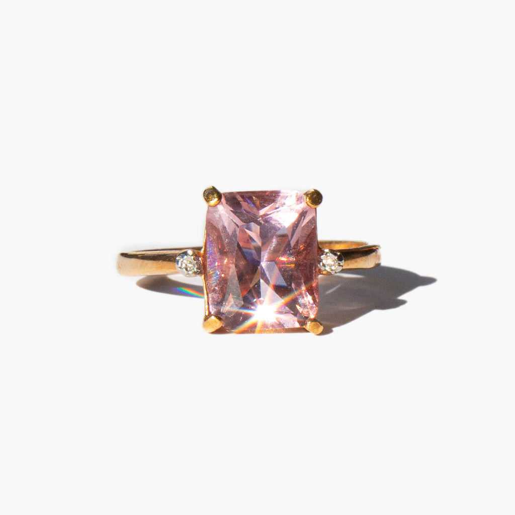 Simple gold wash sterling silver ring with a large sparkling pink crystal flanked by two tiny clear crystals.