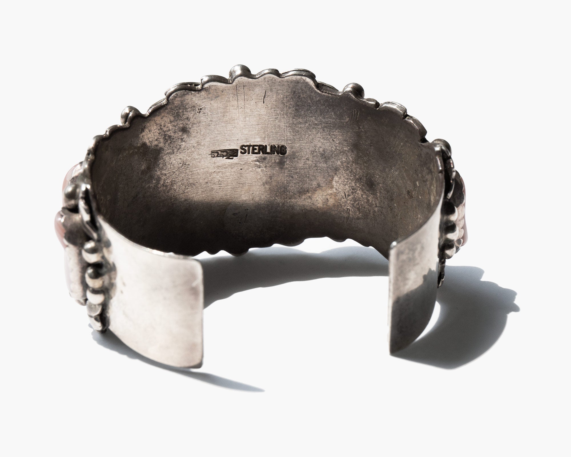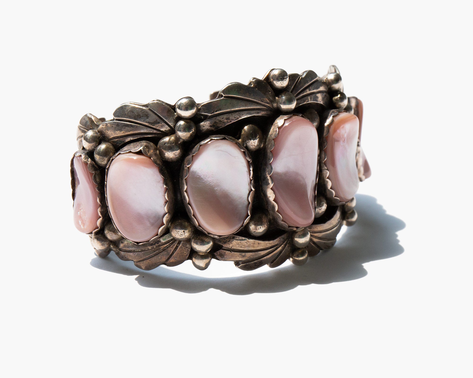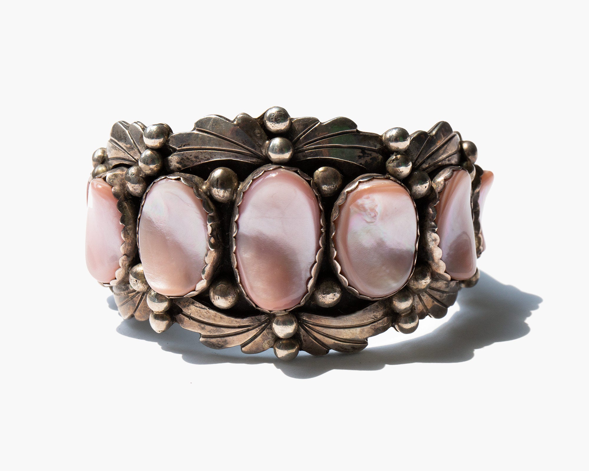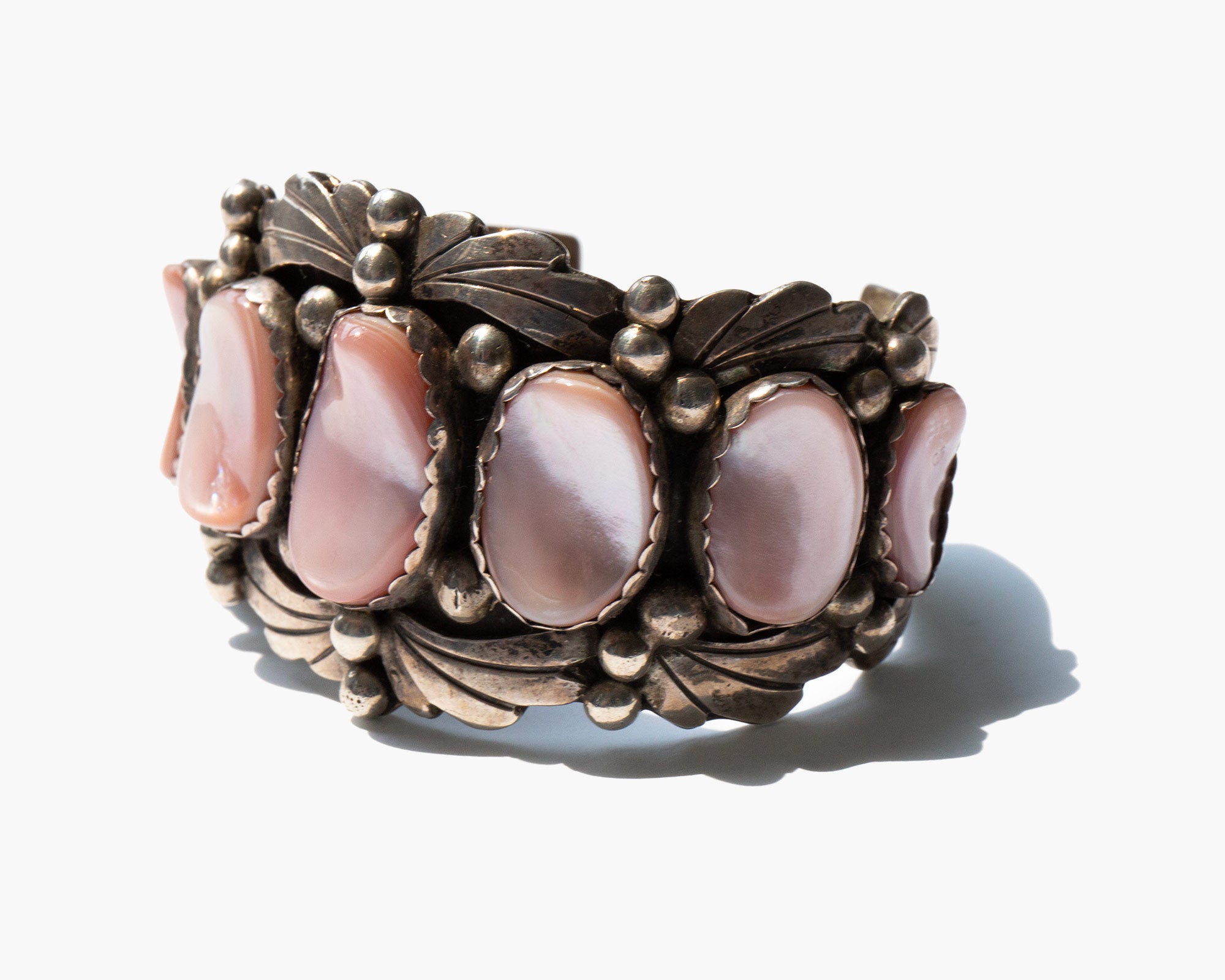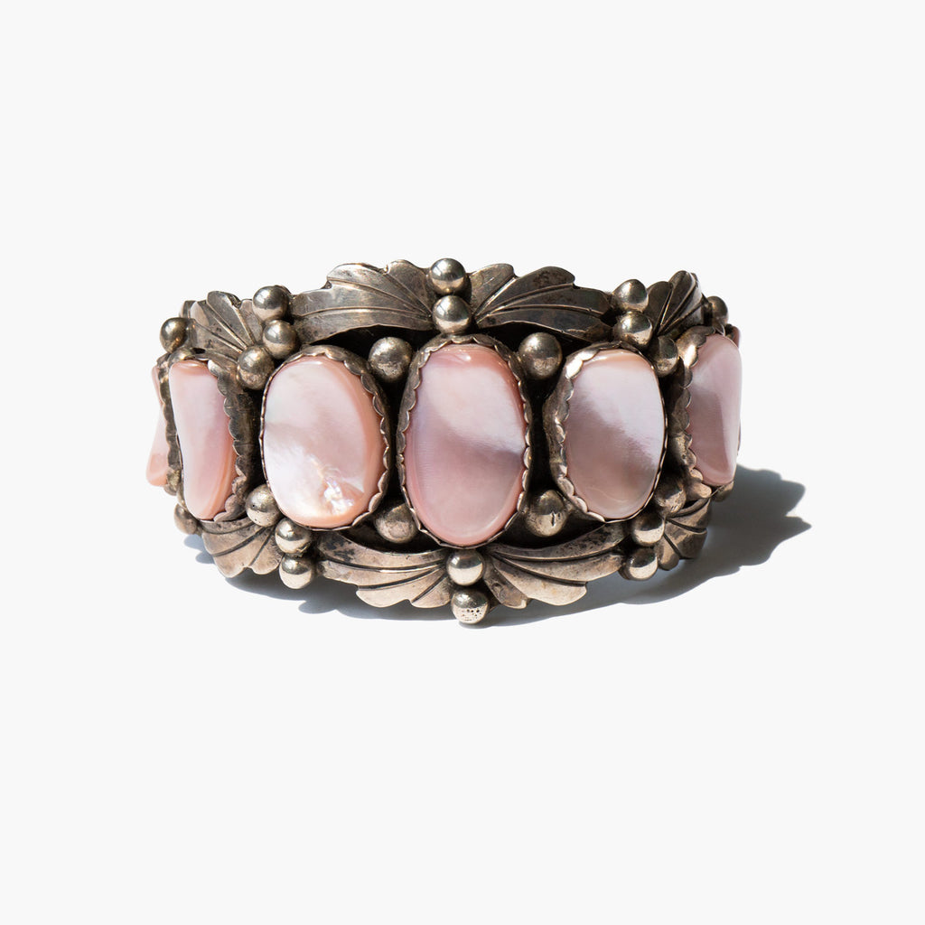 Weighty 1970's Navajo sterling silver and pale pink mother of pearl bracelet.