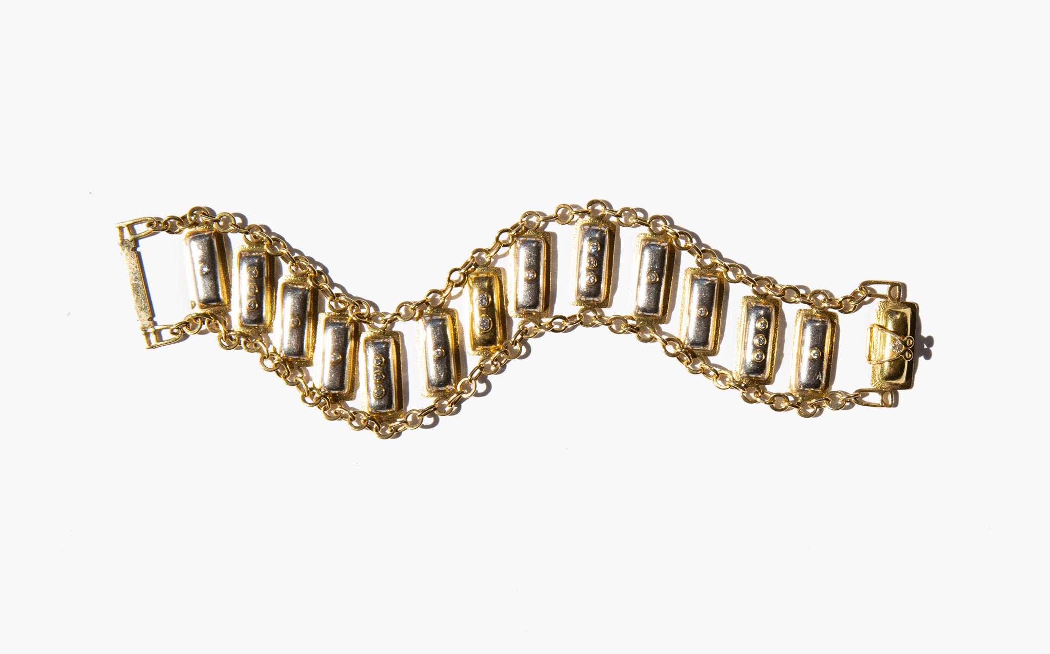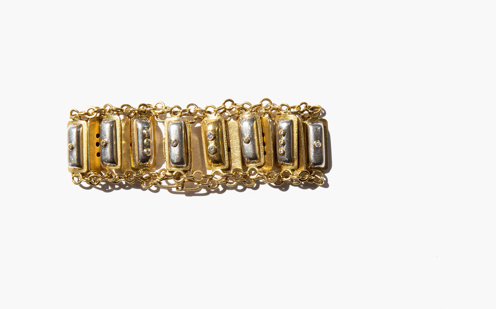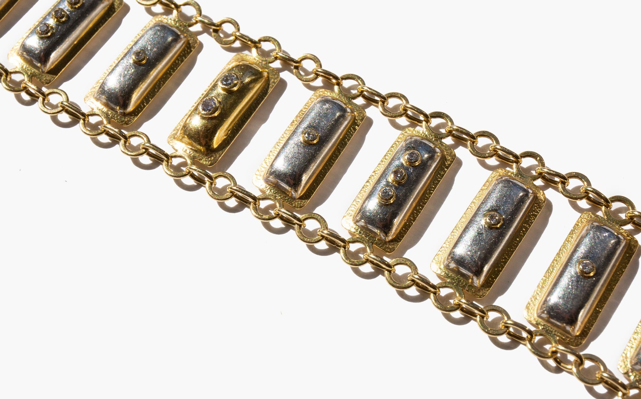 Weighty and stunning artisan handmade 18k gold and platinum bracelet with diamond accents.