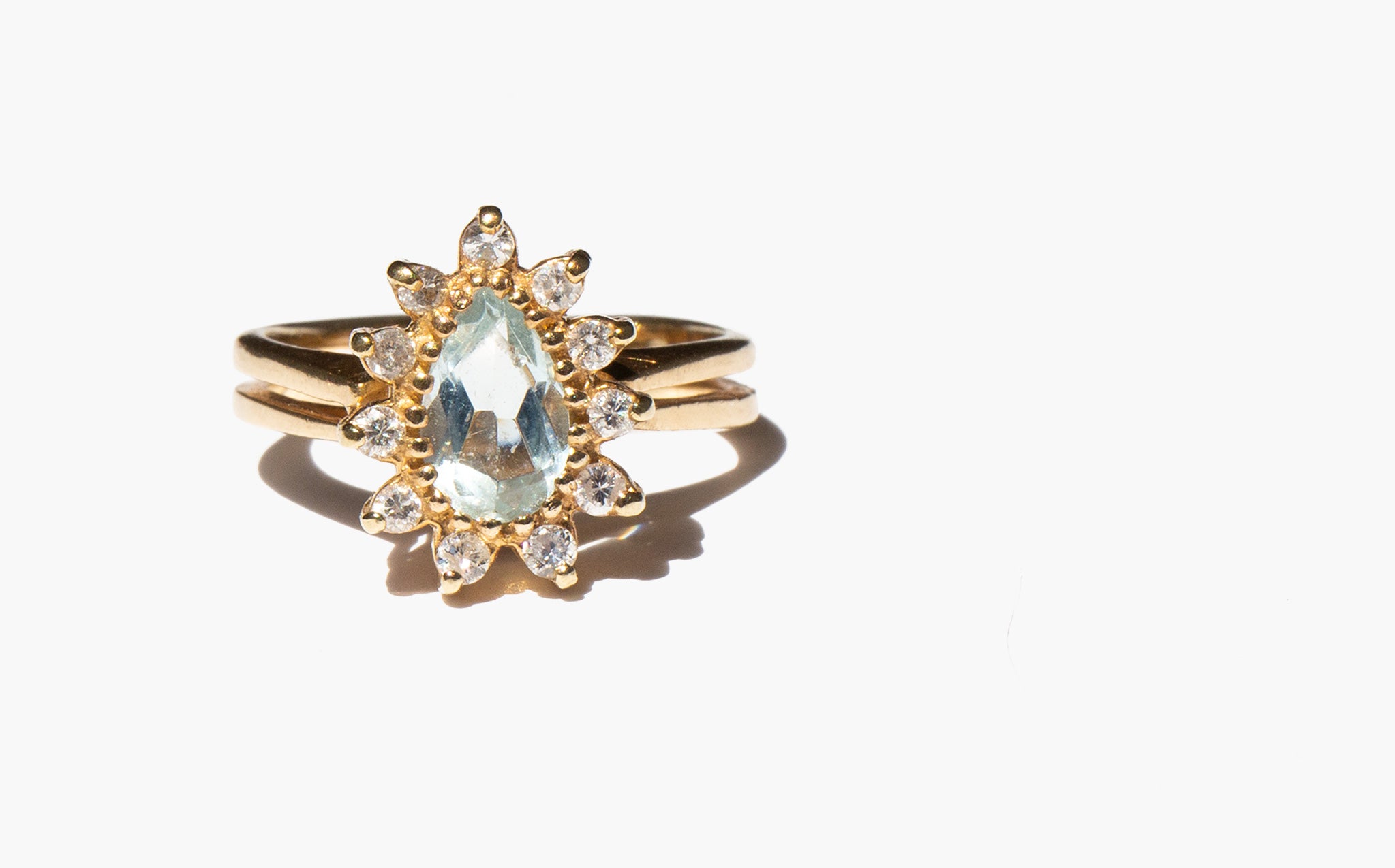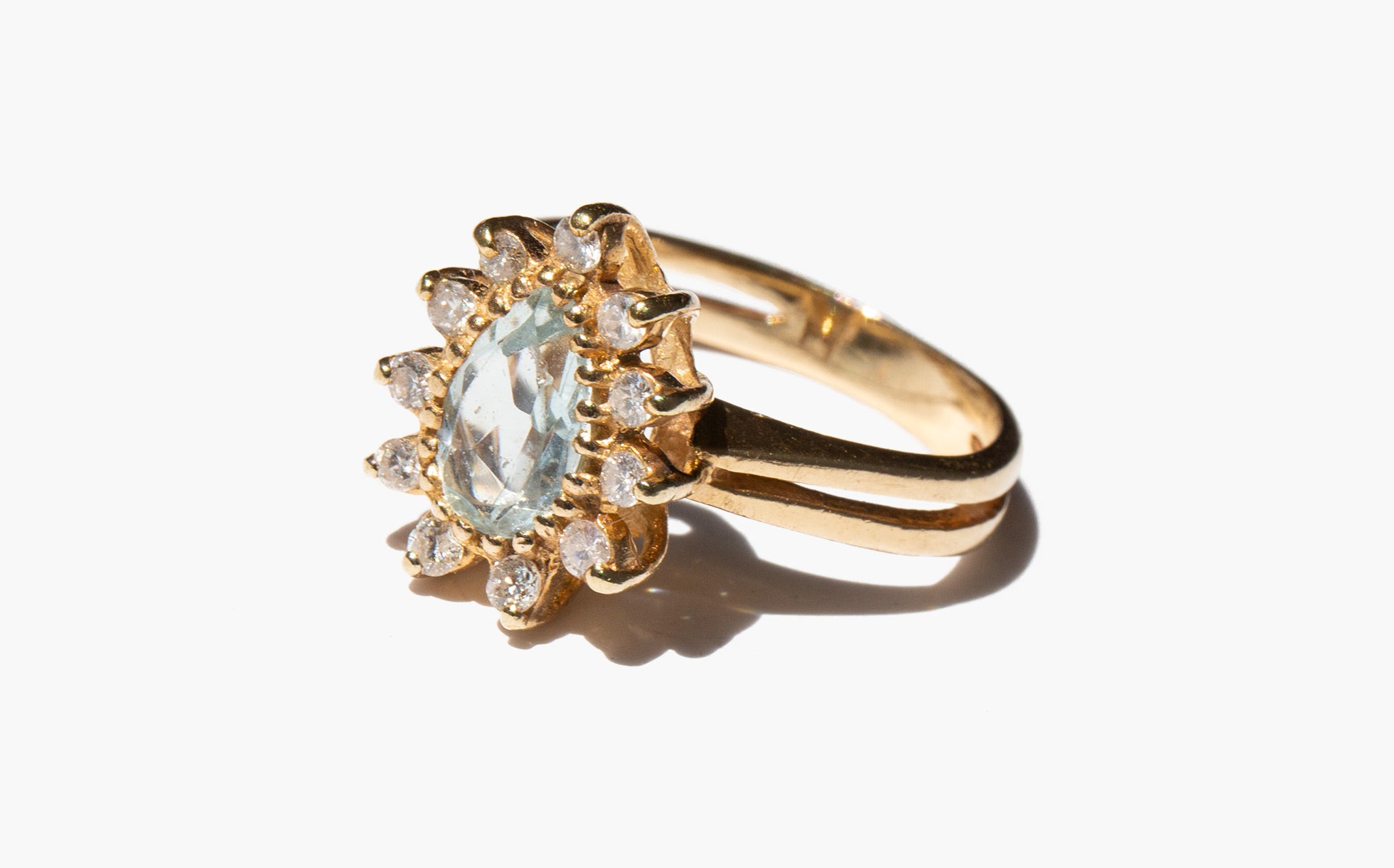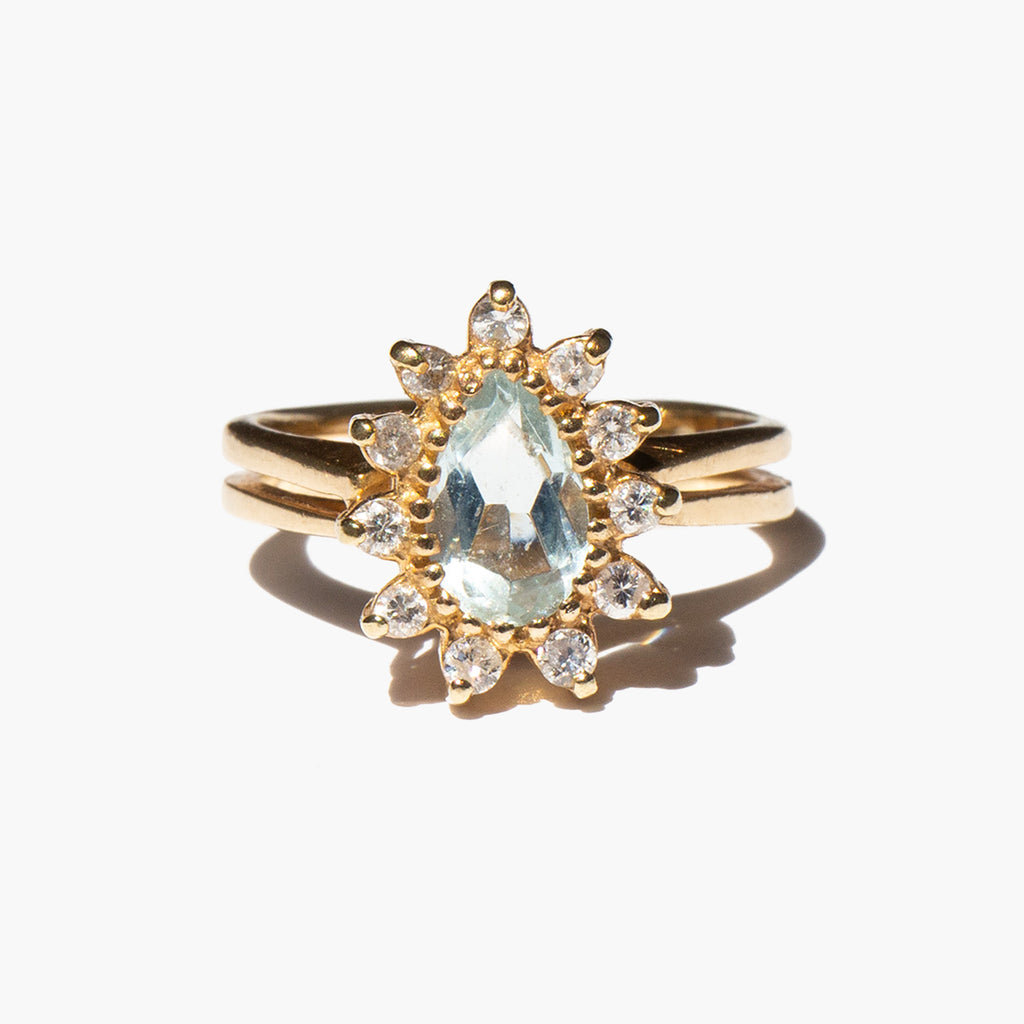 Delightful and sparkly 14k gold ring with a center aquamarine surrounded by diamonds.