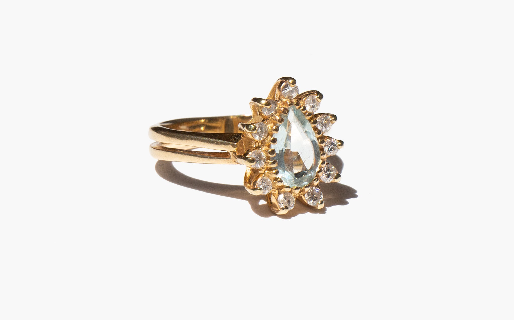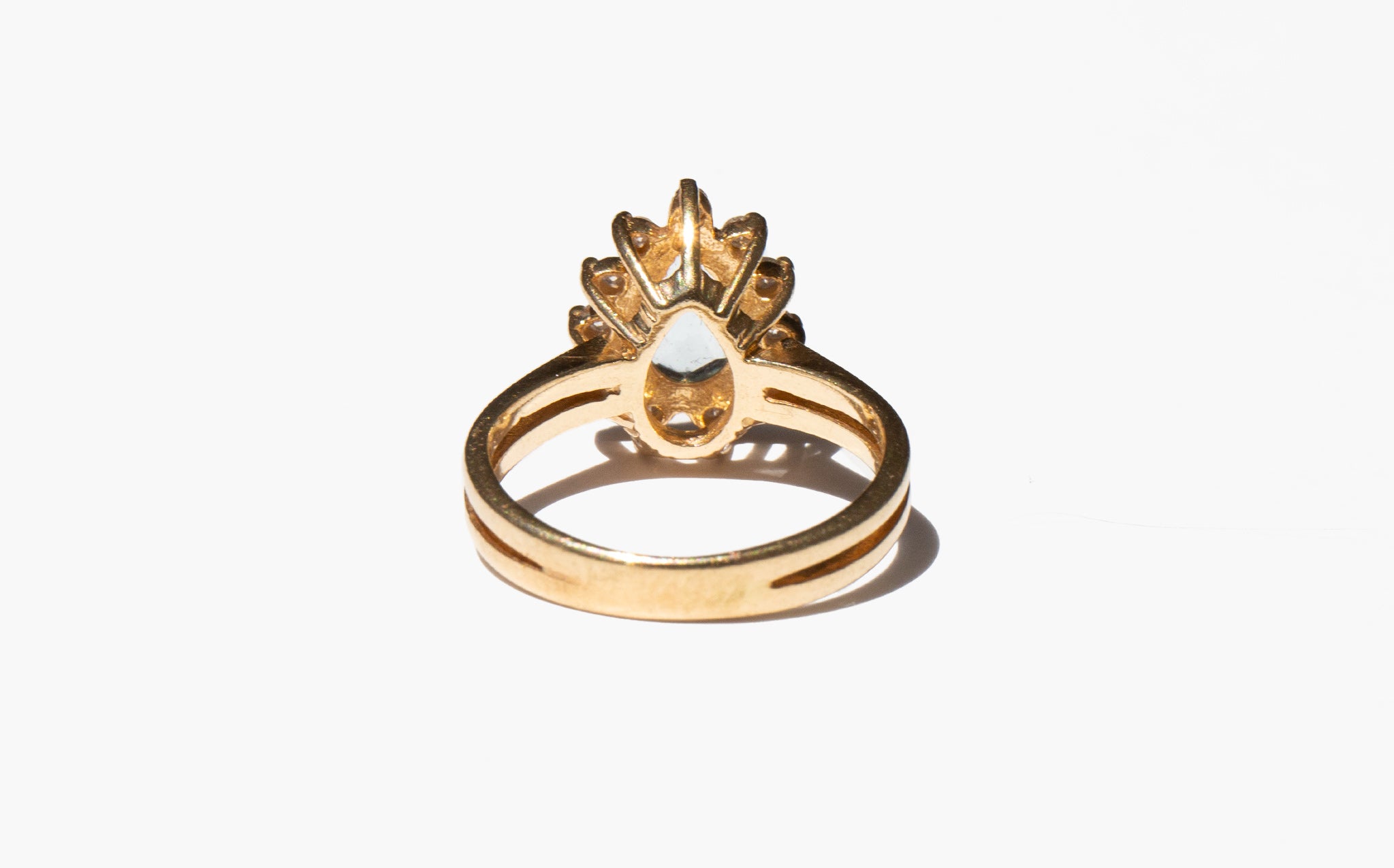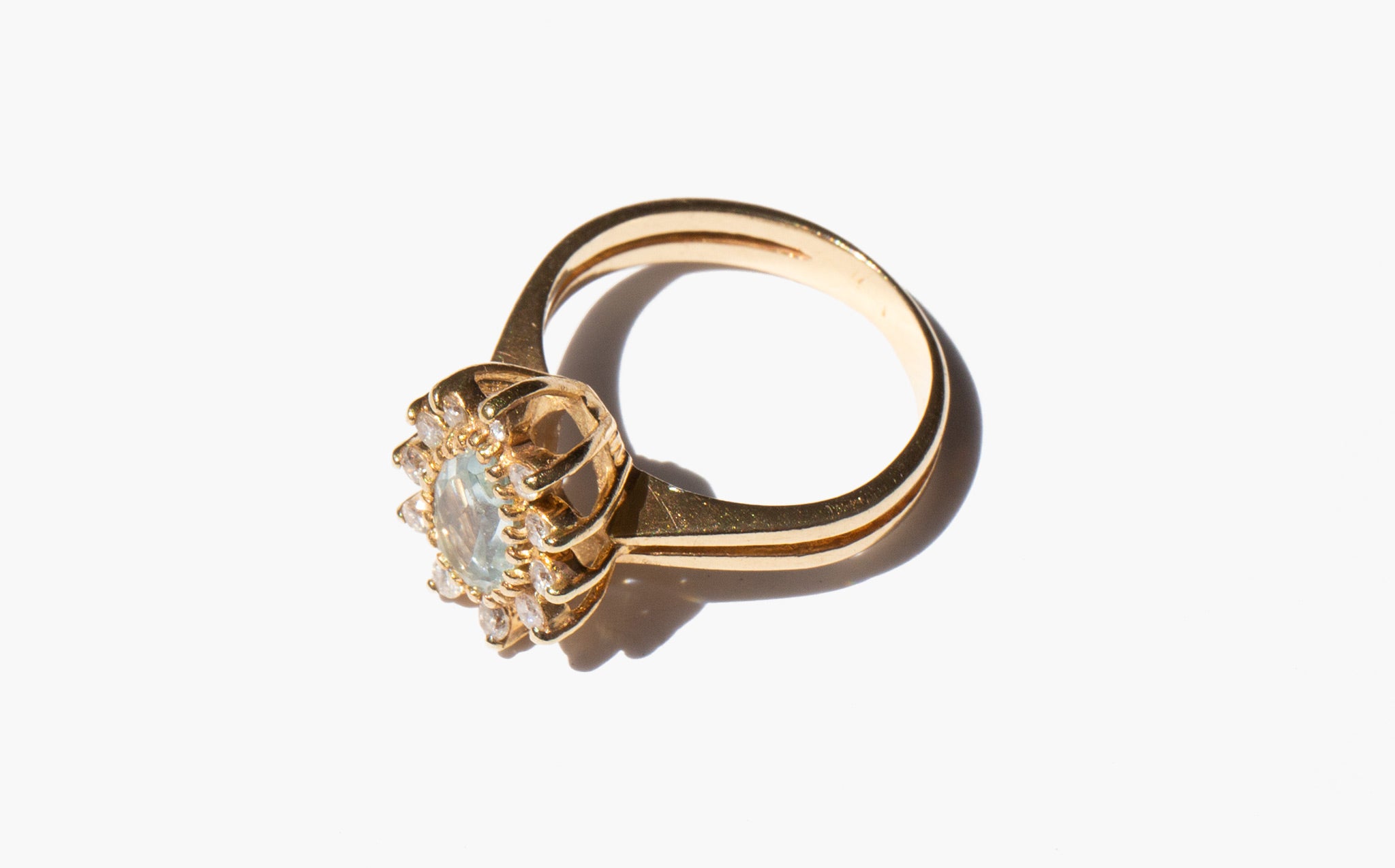 Delightful and sparkly 14k gold ring with a center aquamarine surrounded by diamonds.