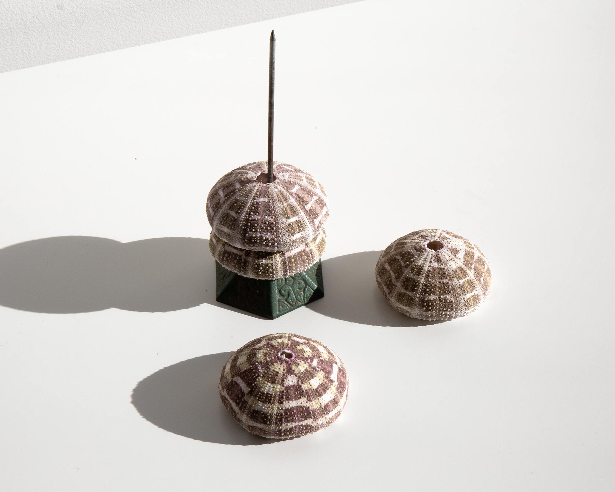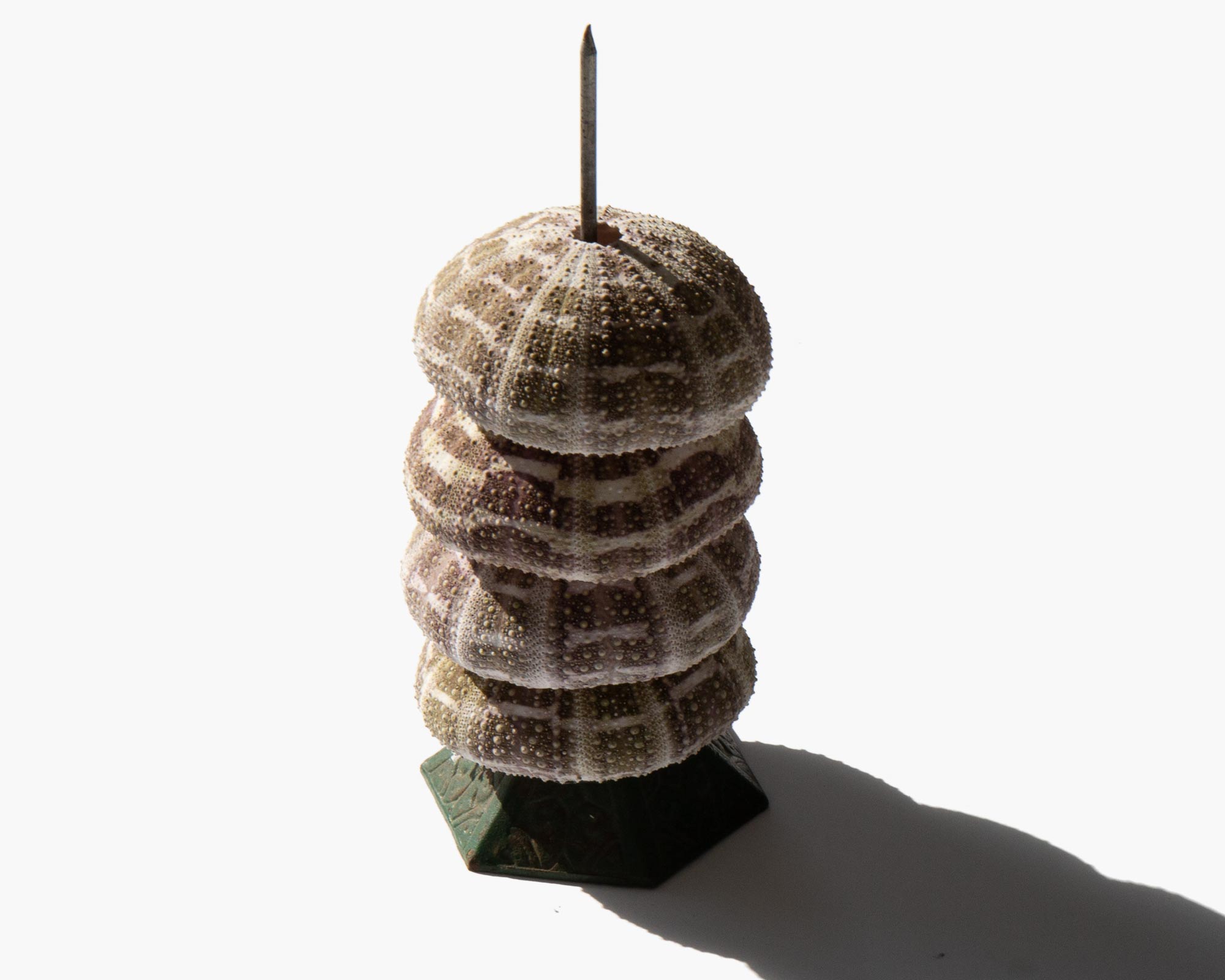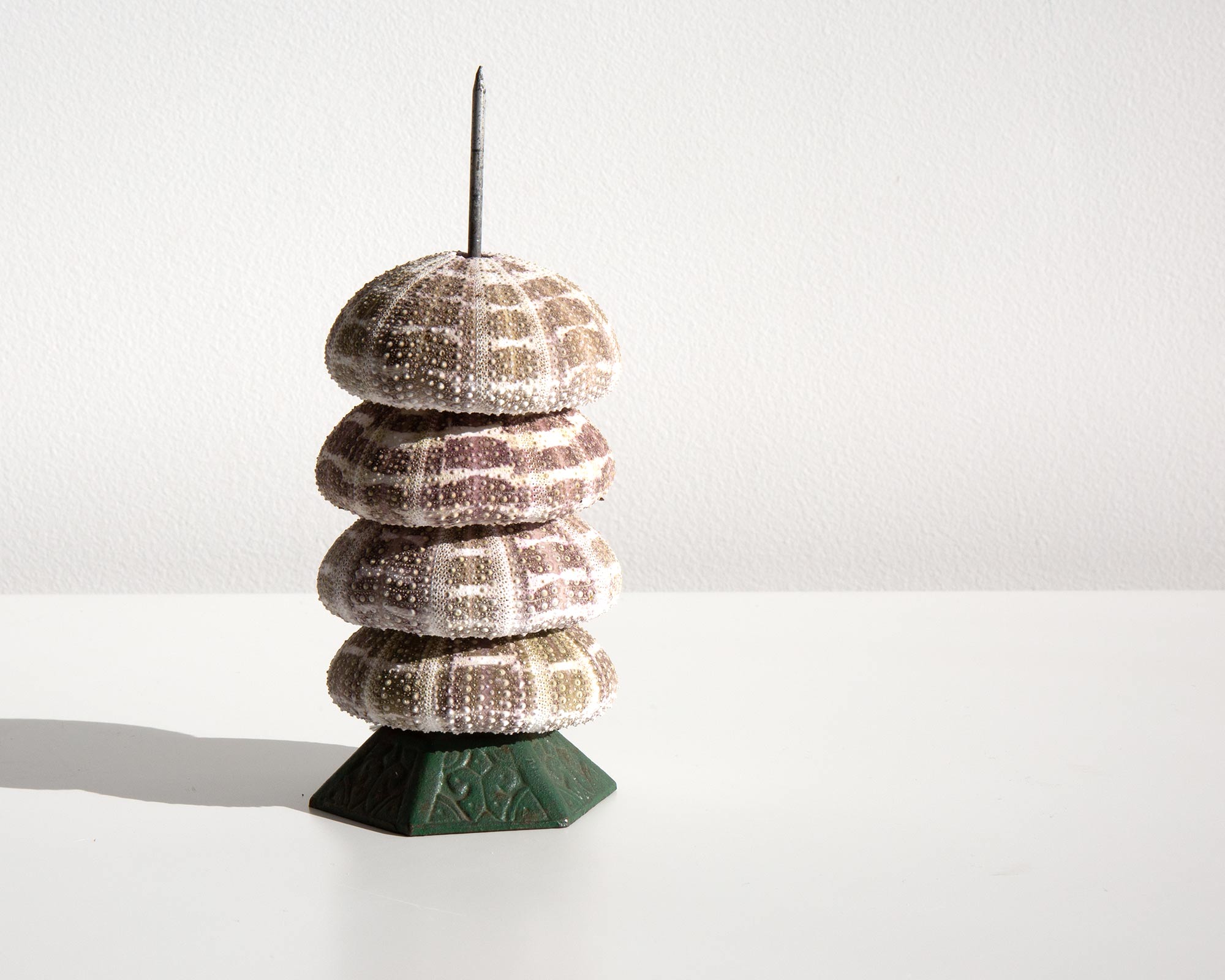 Sea urchin skeletons on an antique Victorian stand.