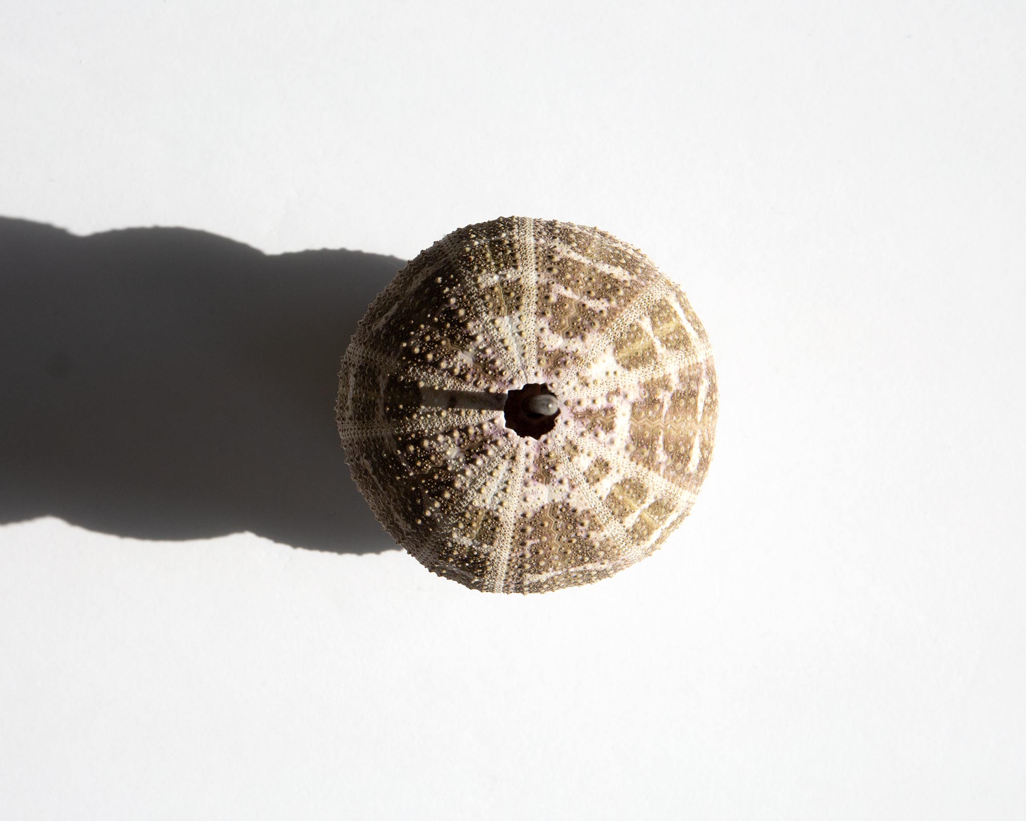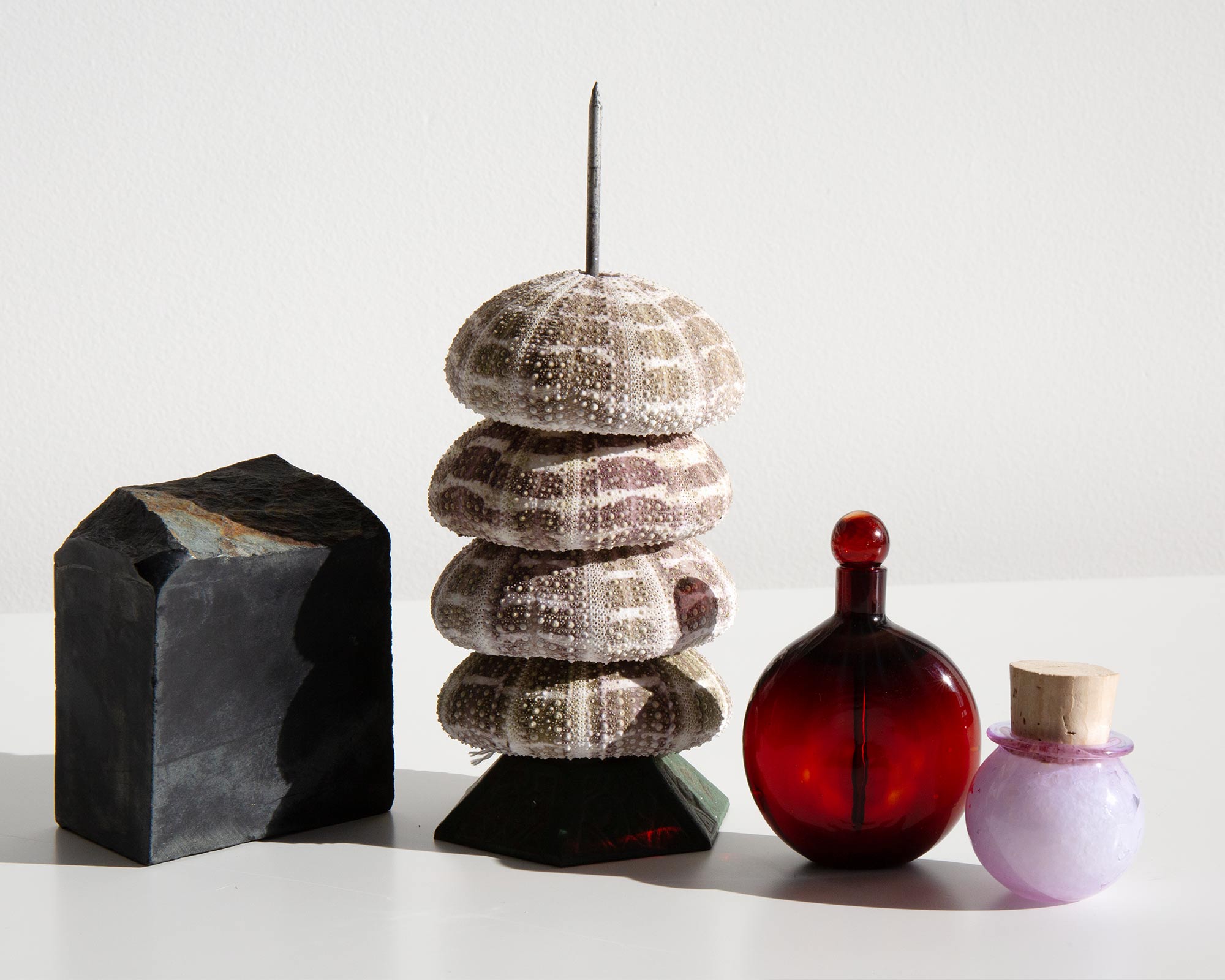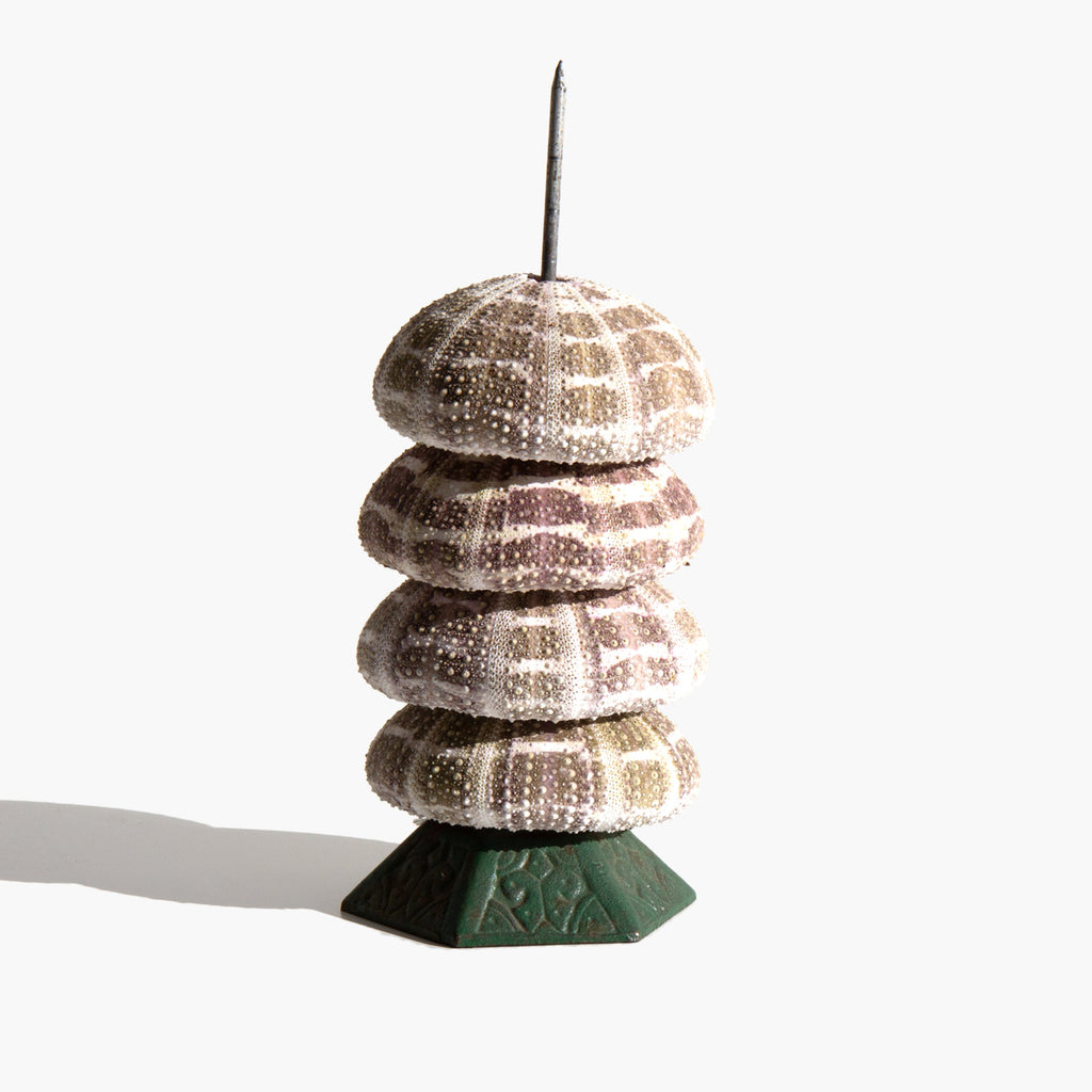 Sea urchin skeletons on an antique Victorian stand.