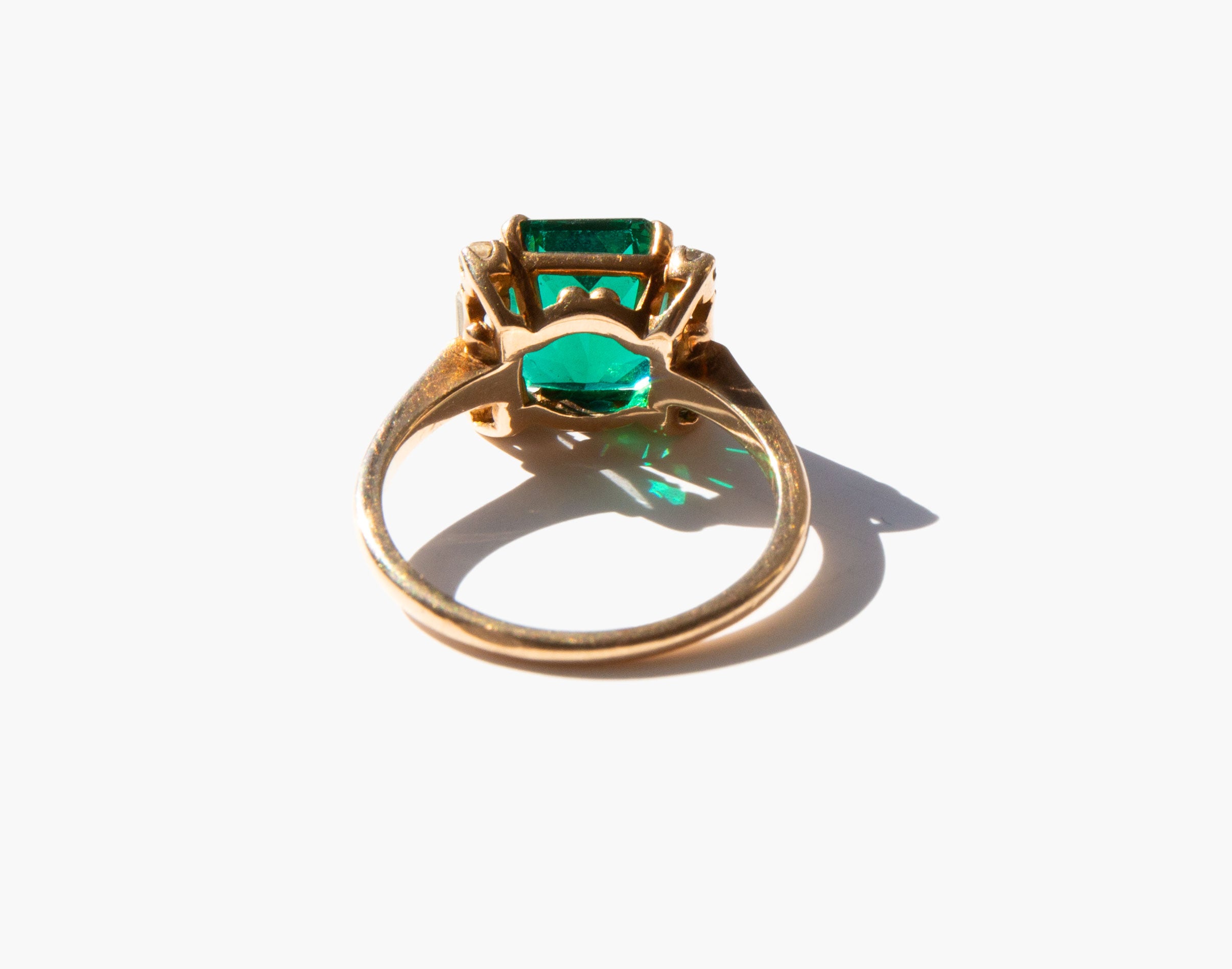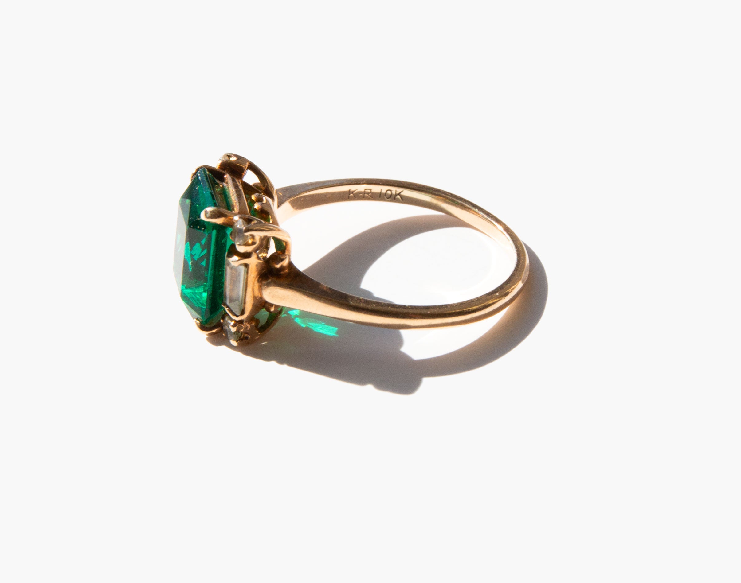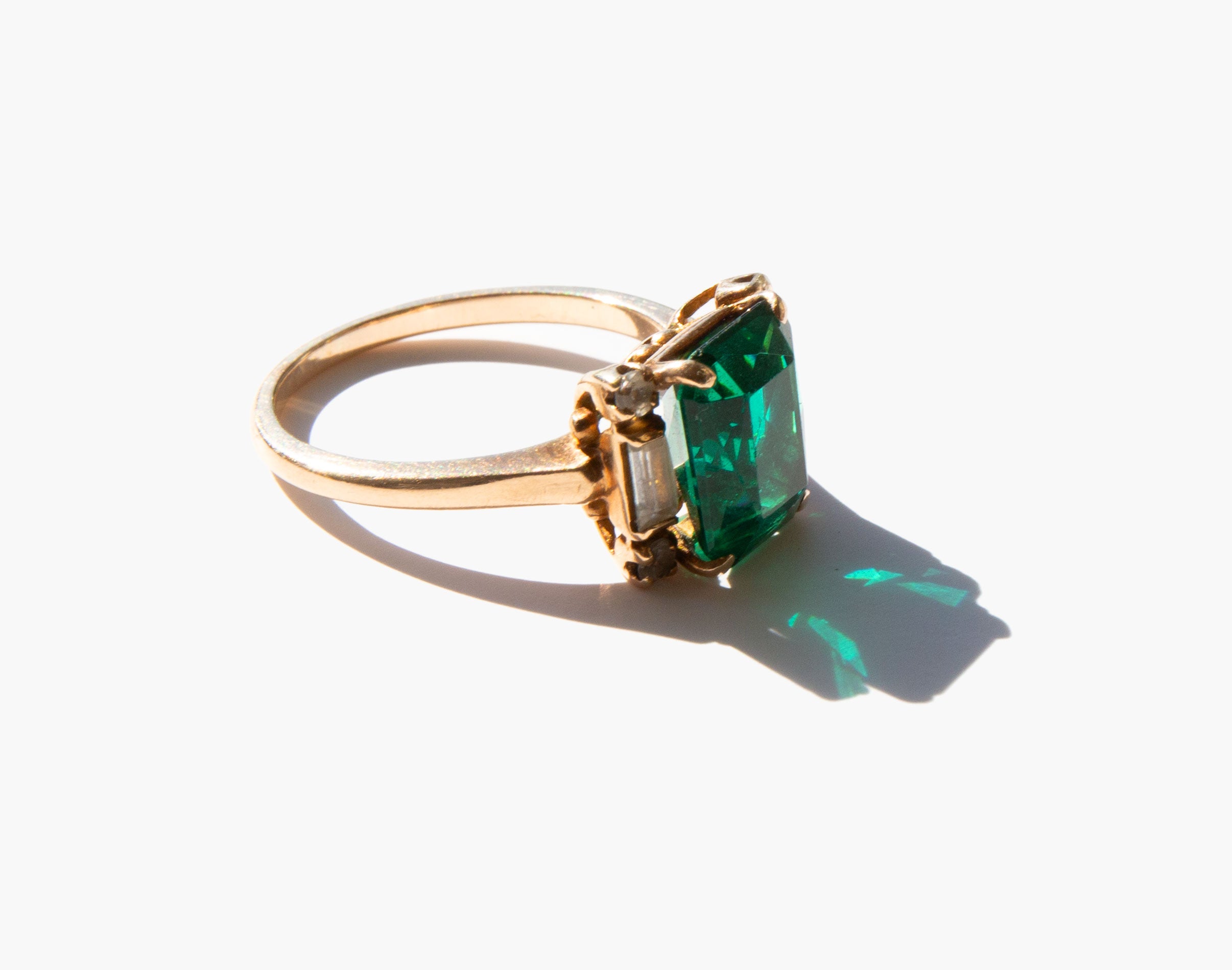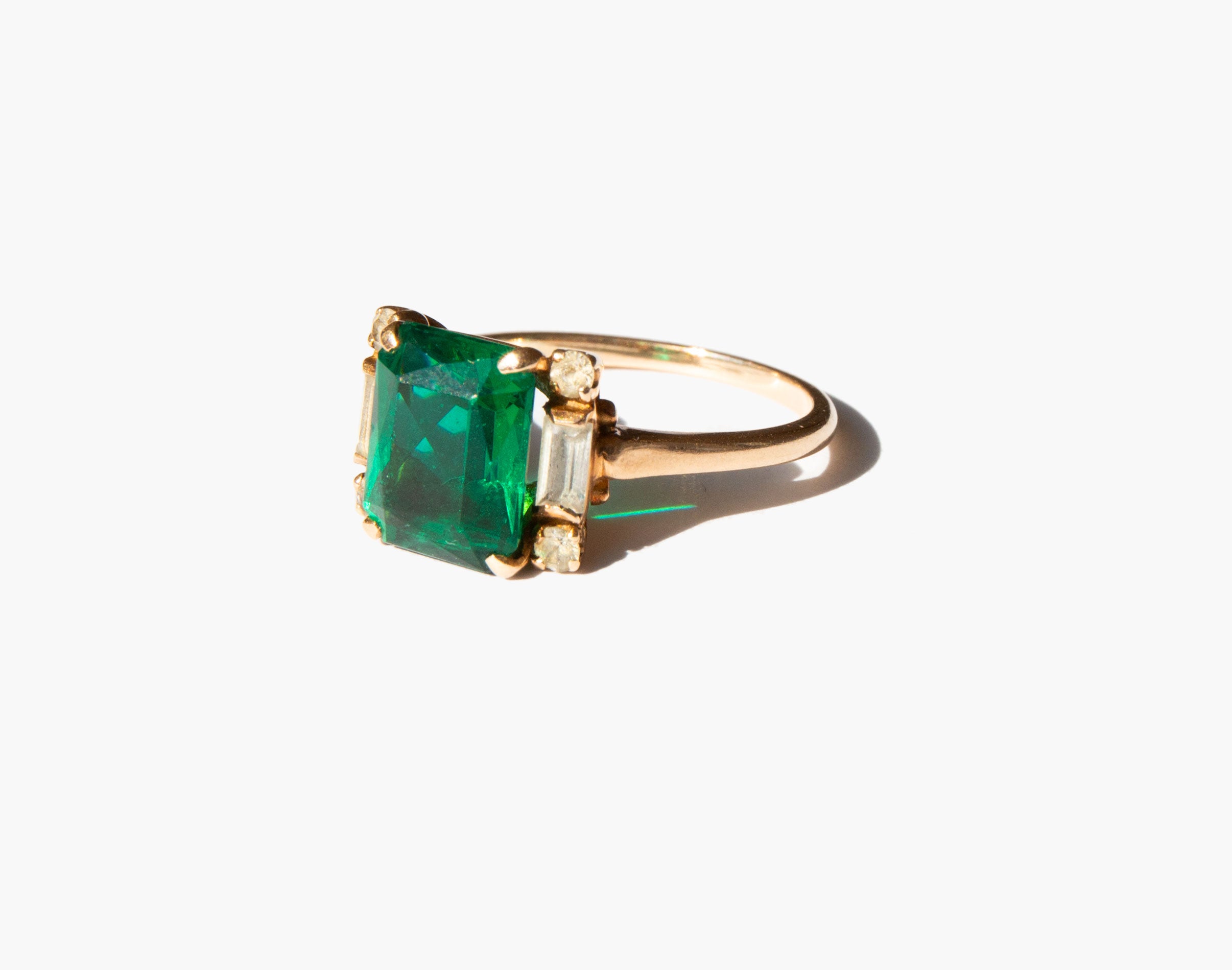 Ravishing 10k gold ring with emerald colored glass center stone flanked by clear quartz and white topaz stones.