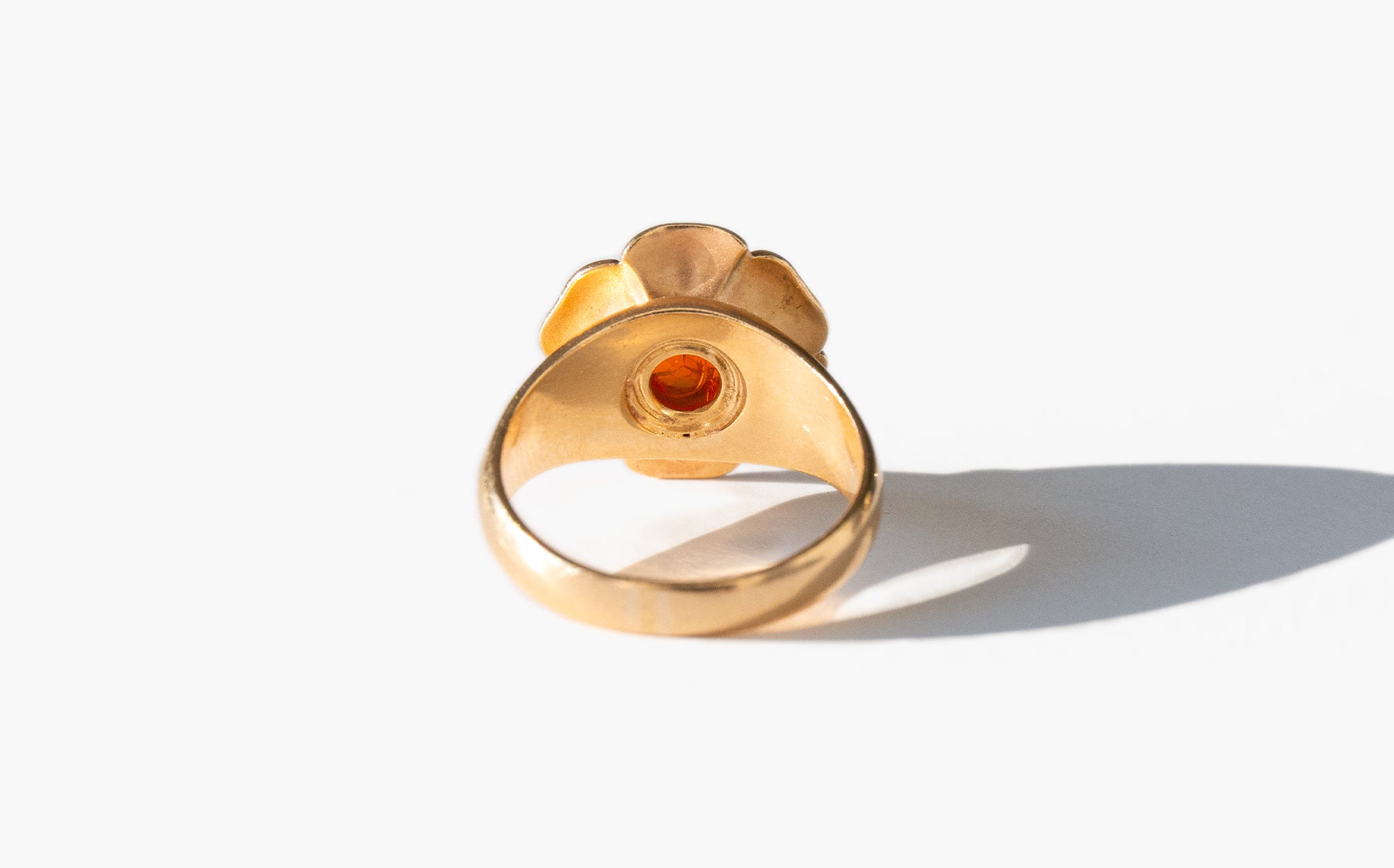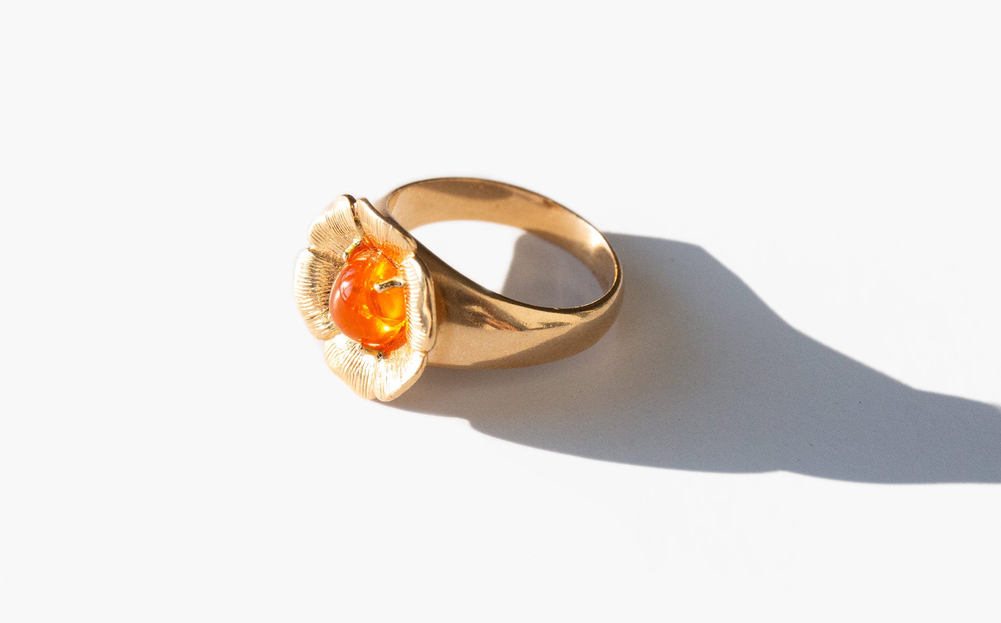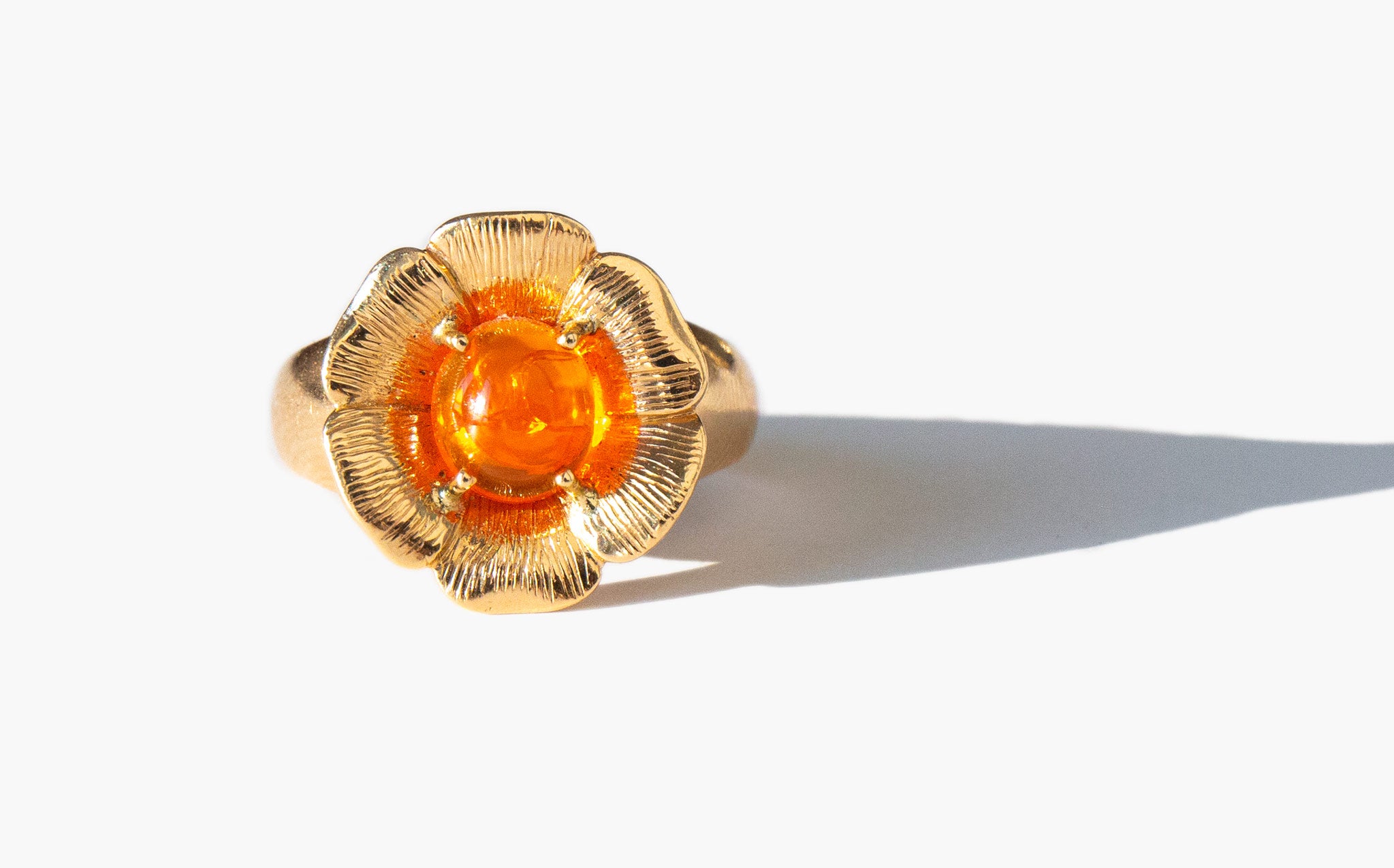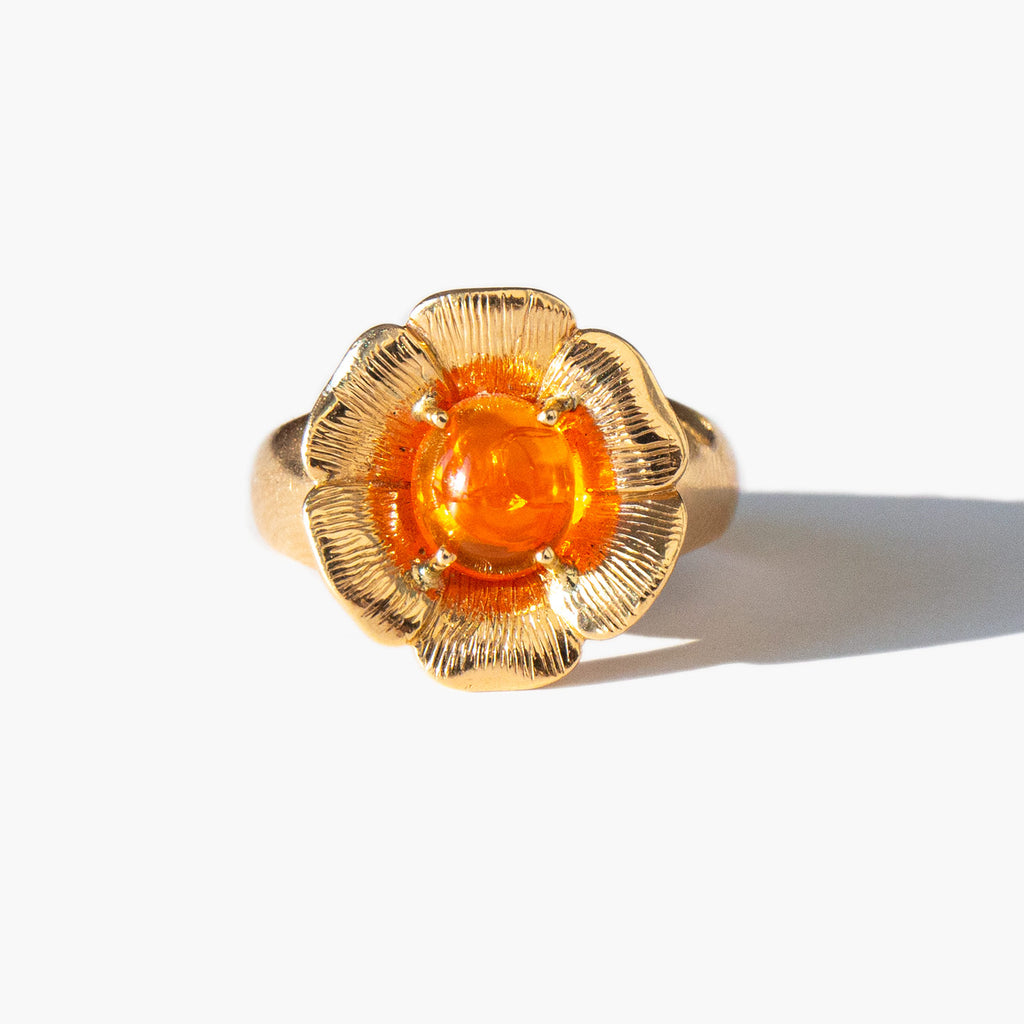 Charming 14k gold flower ring with a blazing center fire opal. Throughout most of history, the opal has been regarded as the luckiest and most magical of all the gems. In ancient Rome, the gem symbolized love and hope. Arabic legends say it falls from the heavens in flashes of lightning. The ancient Greeks believed opals were the tears of Zeus and would impart them with the gift of prophecy and protect them from disease. And in Europe, the monarchs wore opals in crowns and necklaces as symbols of hope, purity, and truth.