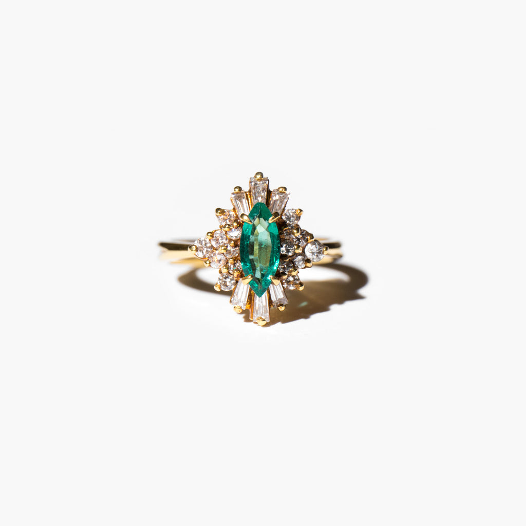 A stunning jewel - 14k gold setting with a richly colored marquise emerald flanked with sparkling round and rectangular baguette diamonds.