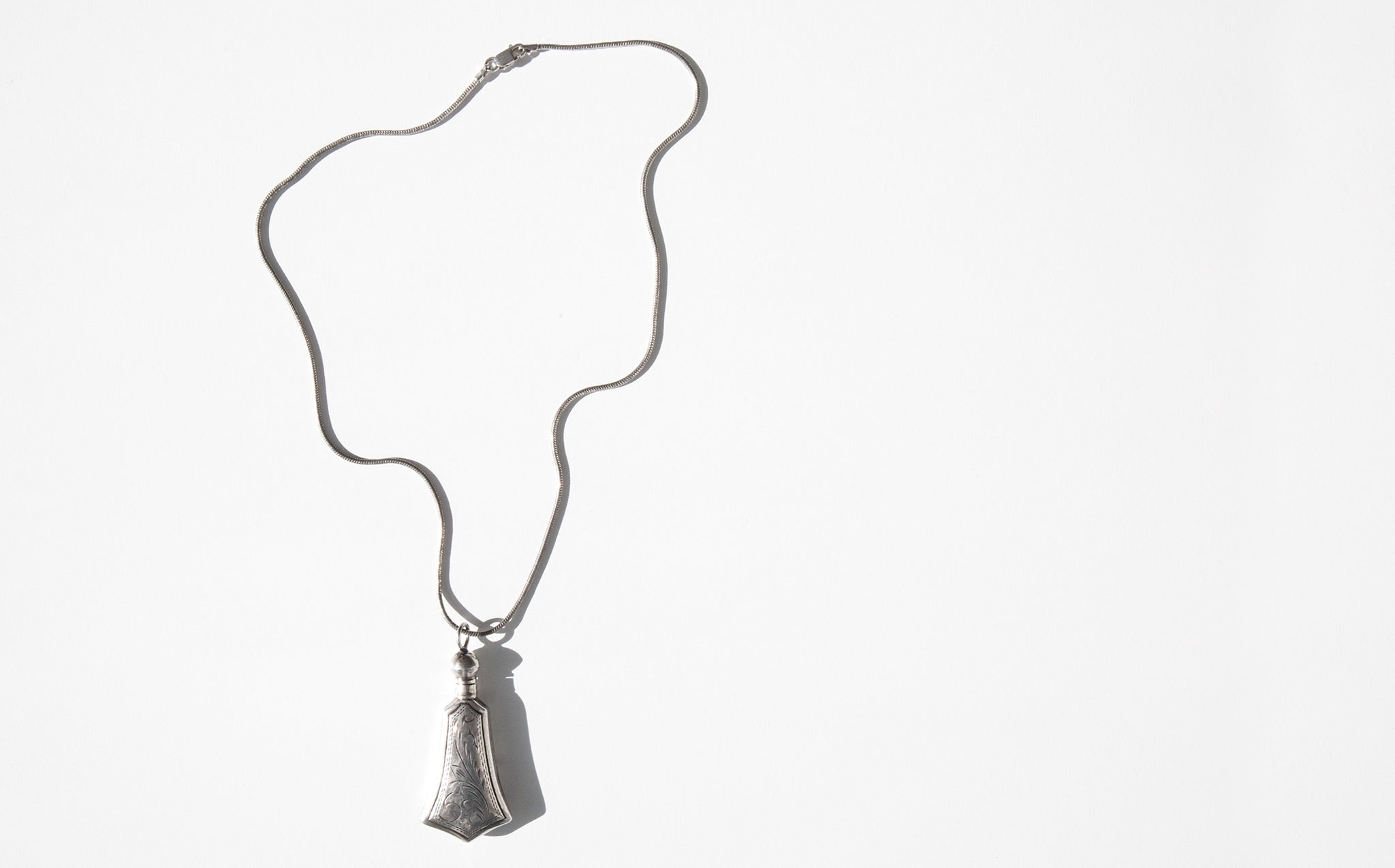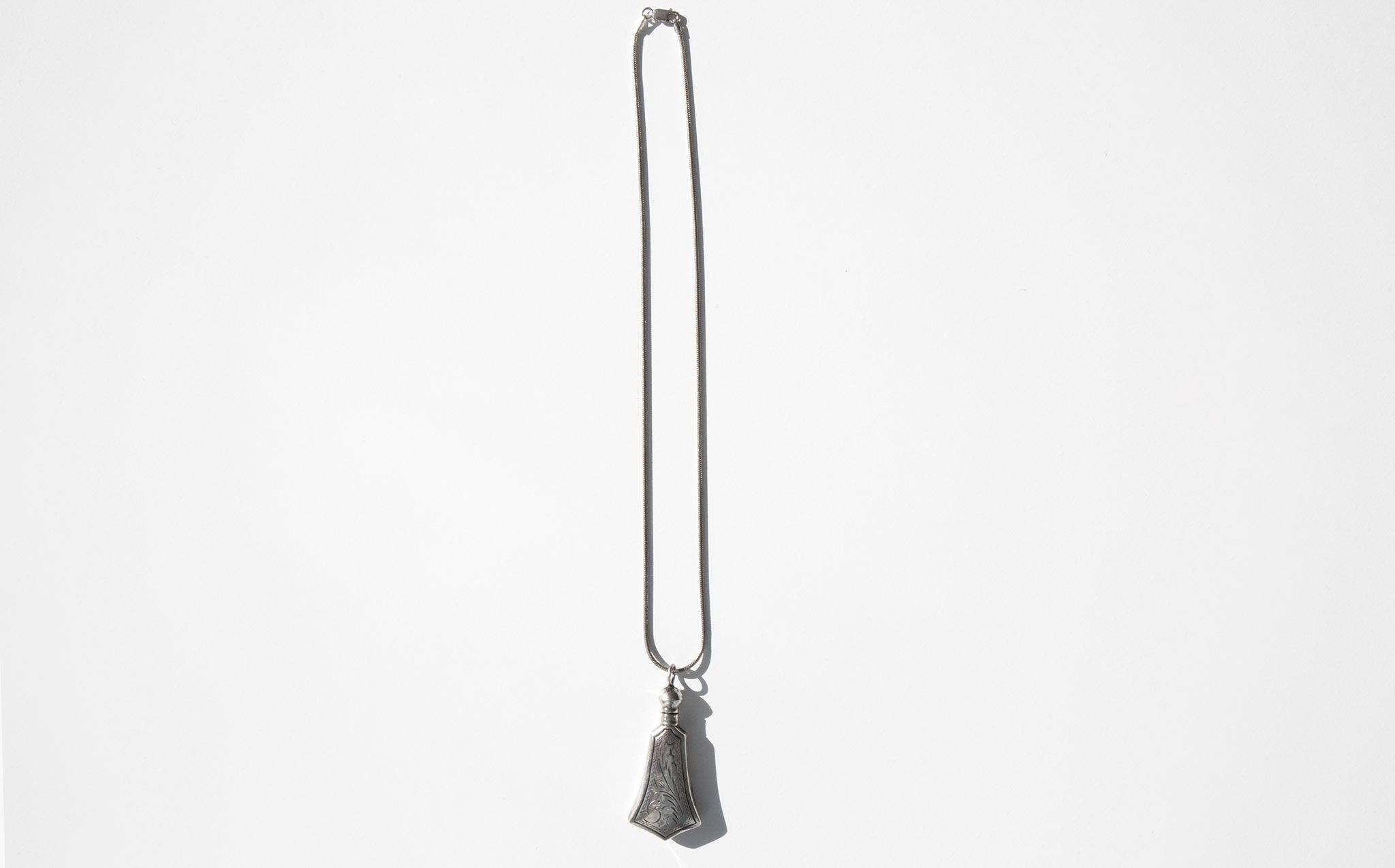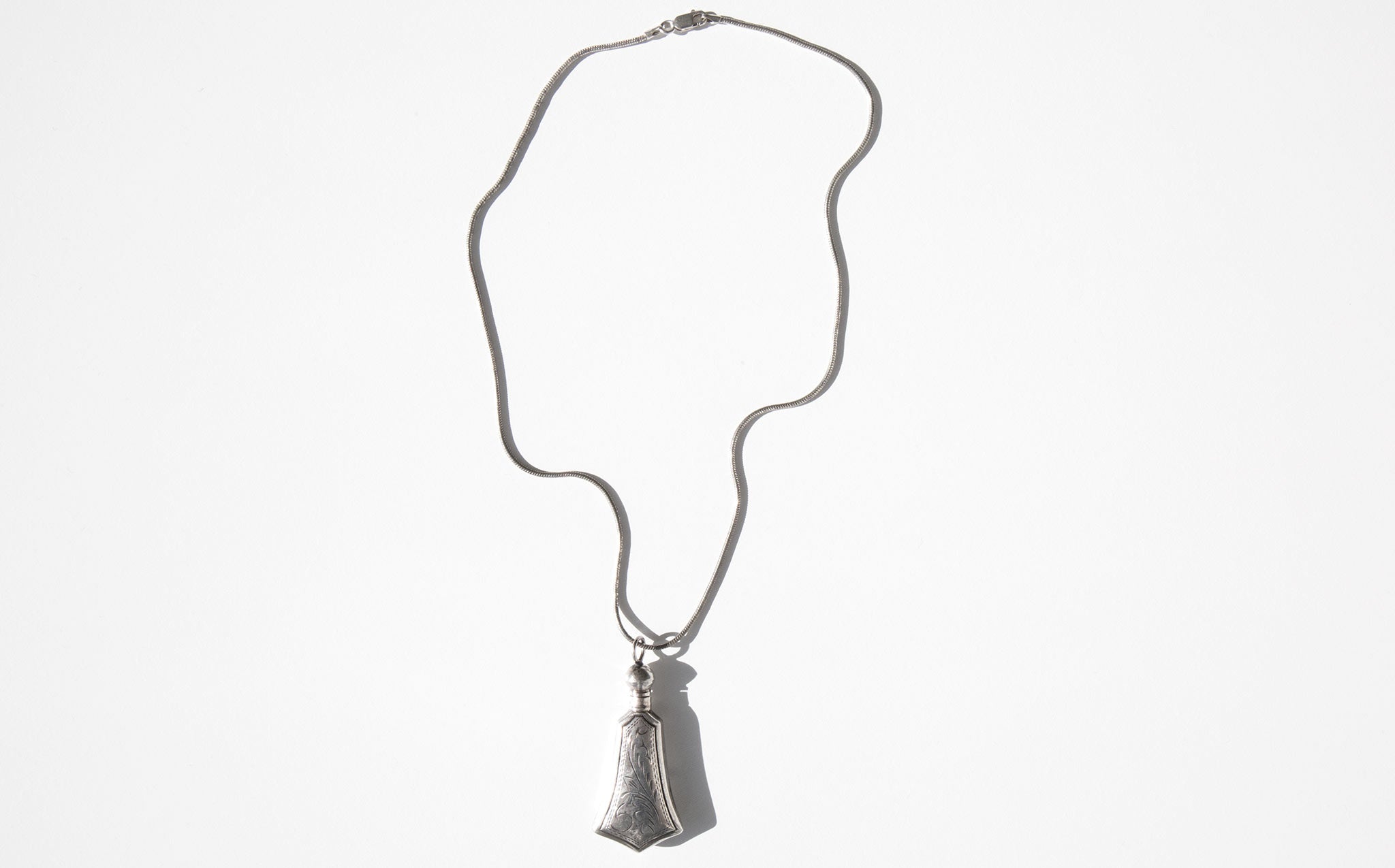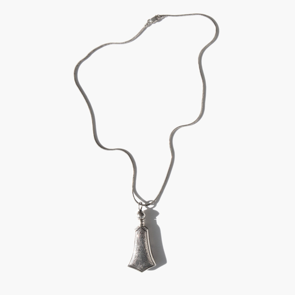 Pretty etched vintage sterling silver perfume on a sterling silver snake chain.