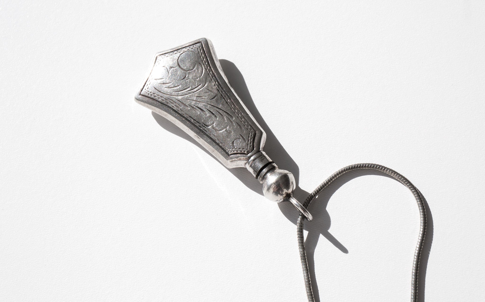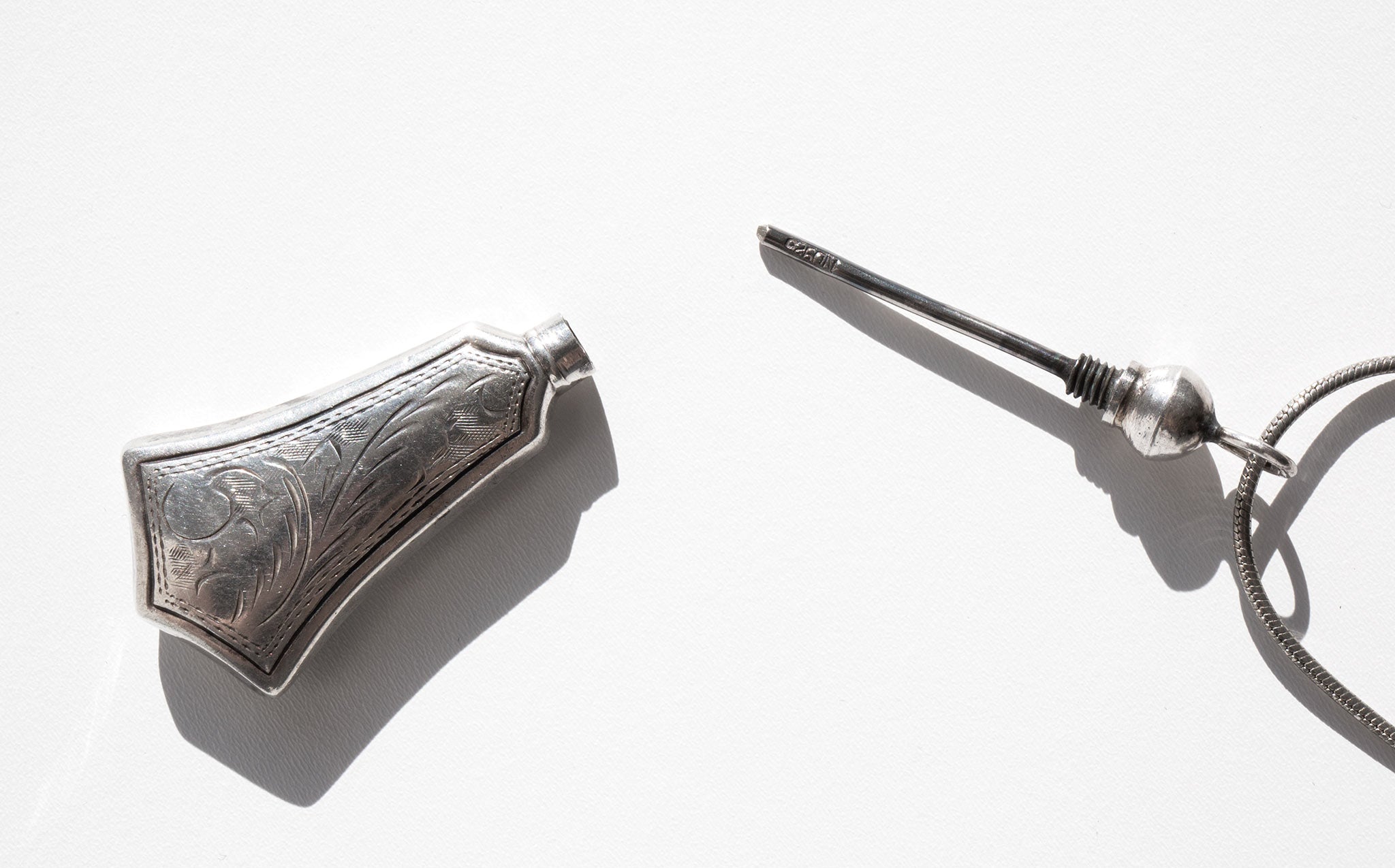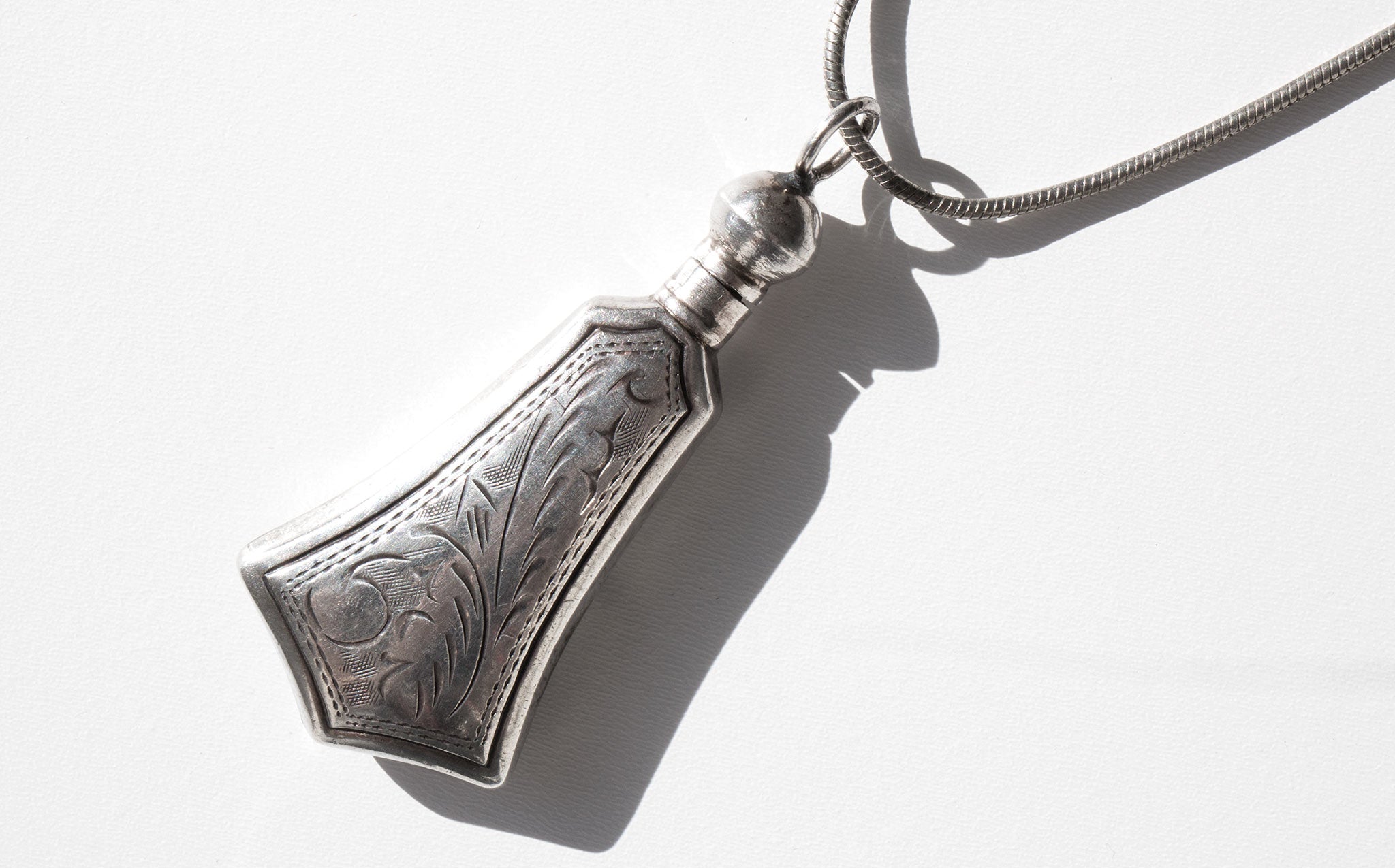 Pretty etched vintage sterling silver perfume on a sterling silver snake chain.