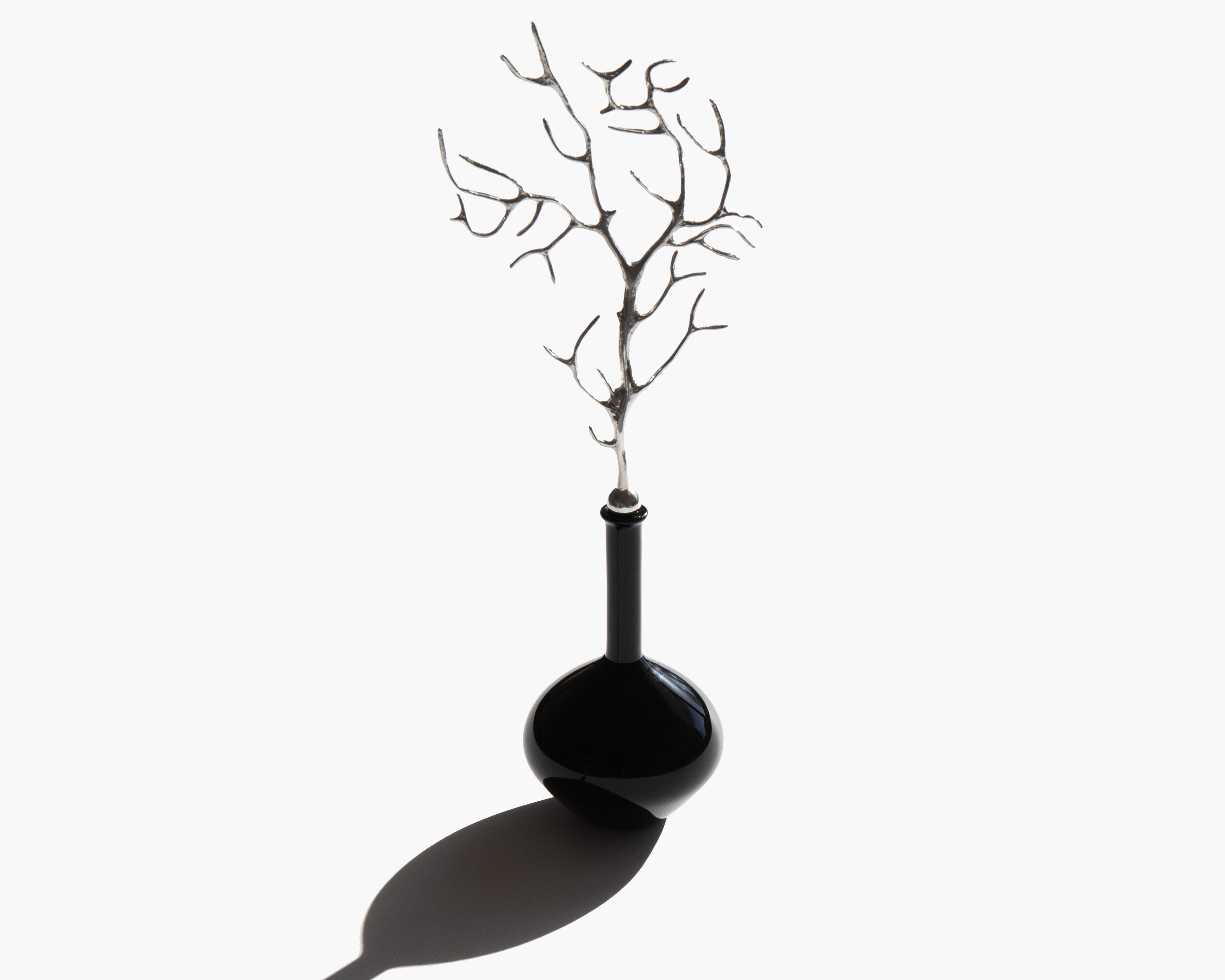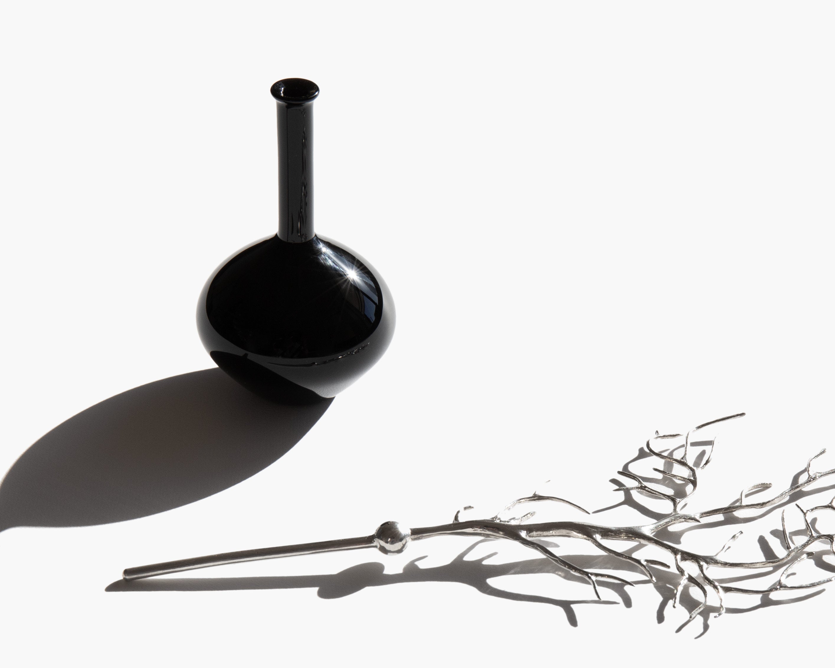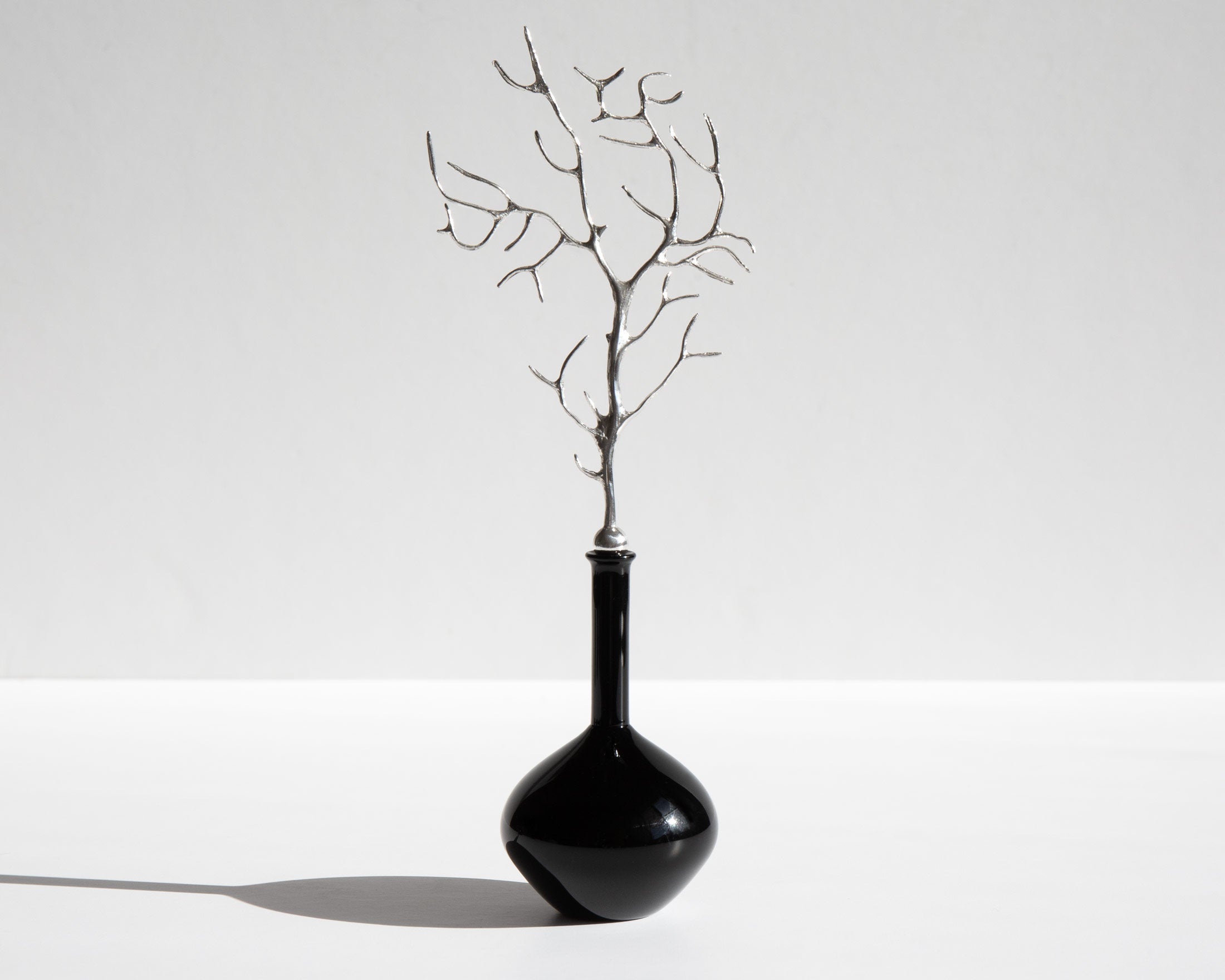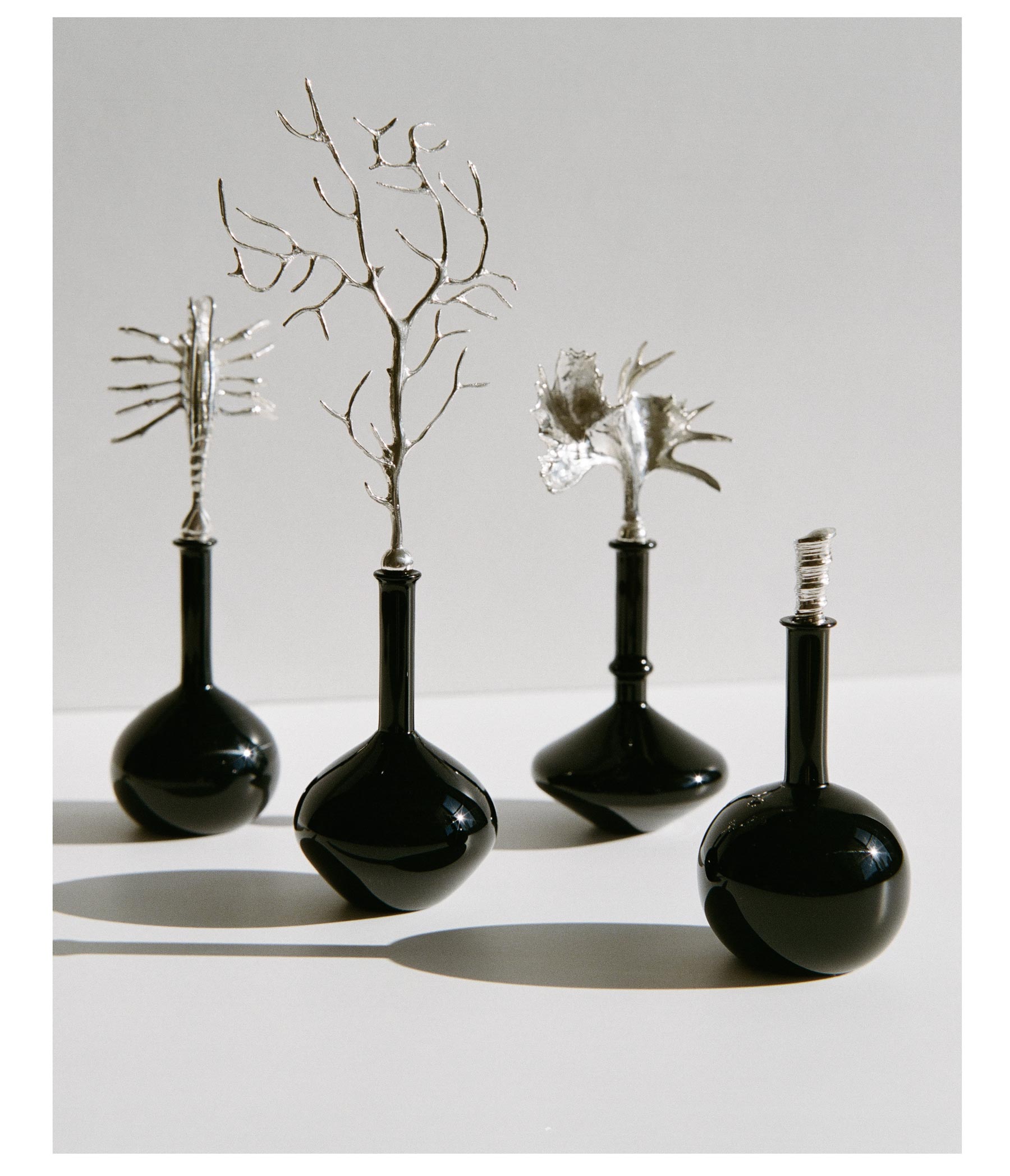The sculptural black glass bottle is hand blown in Illinois by a master glass artisan and each one is topped with a hand worked recycled sterling silver perfume dabber. The dabbers are a series of interrelated talismans from the natural world, based on relics from our own curio collection – the vulnerable lobster, a large sea fan coral, the transformative antler, and a graceful spiral shell.