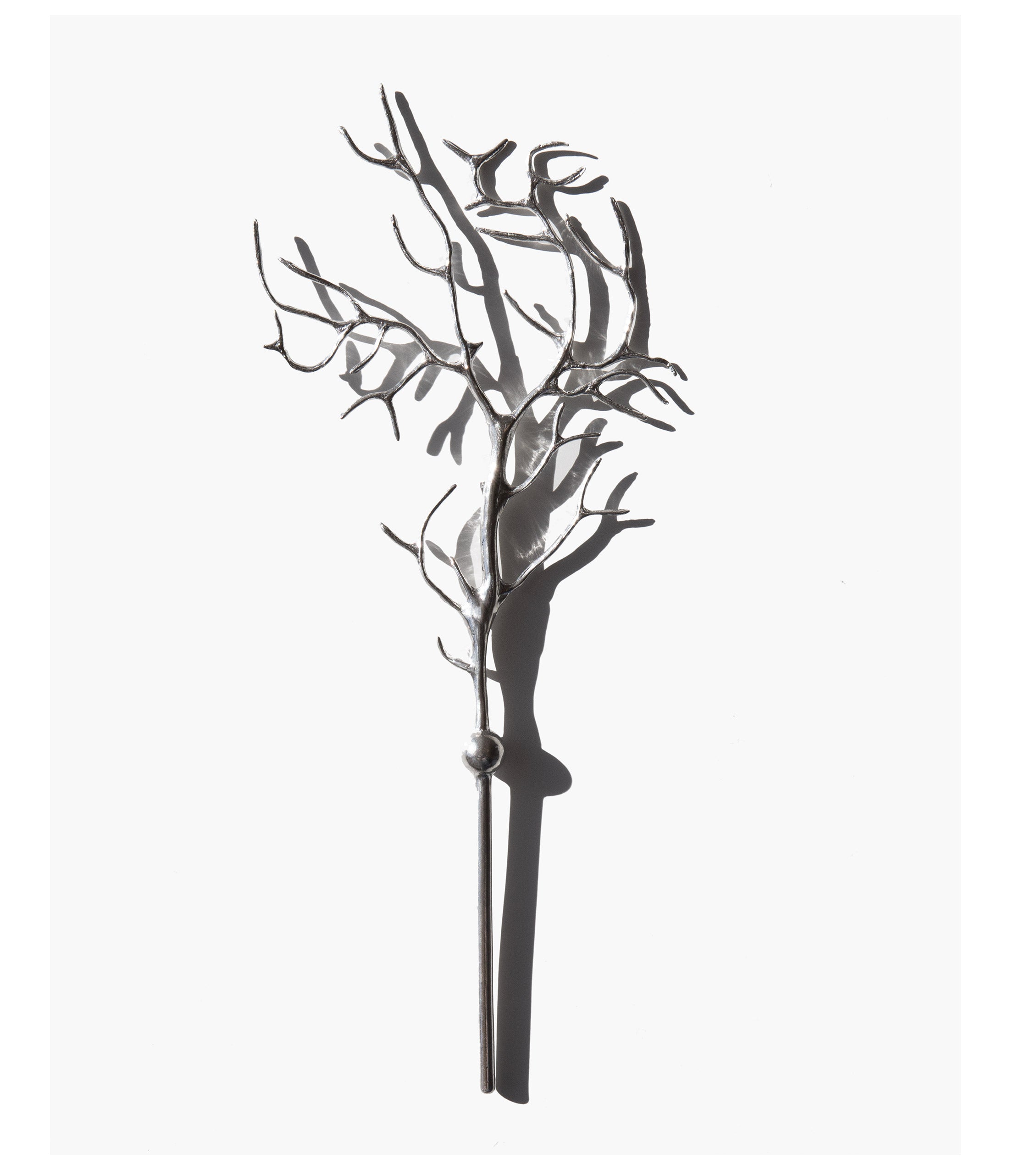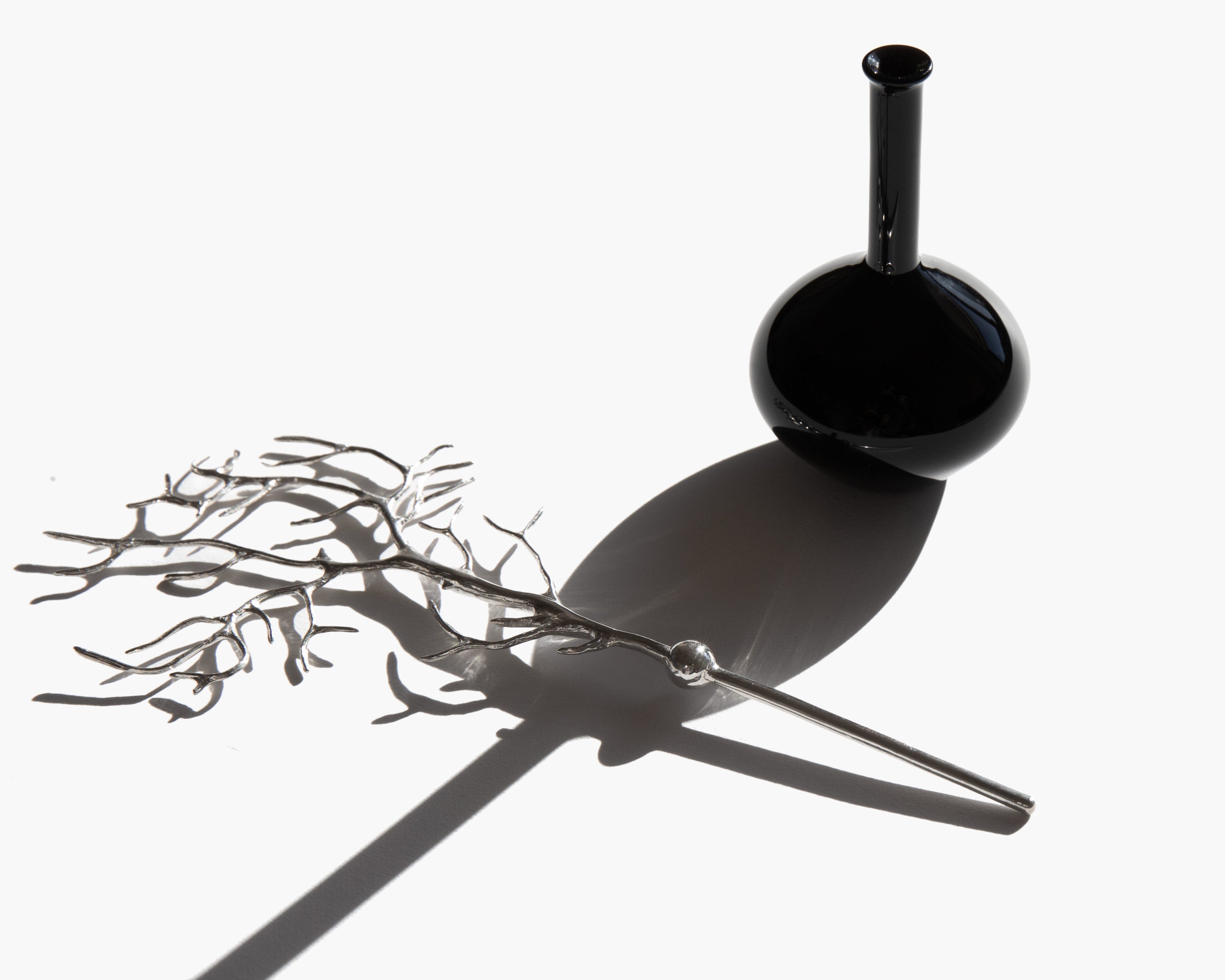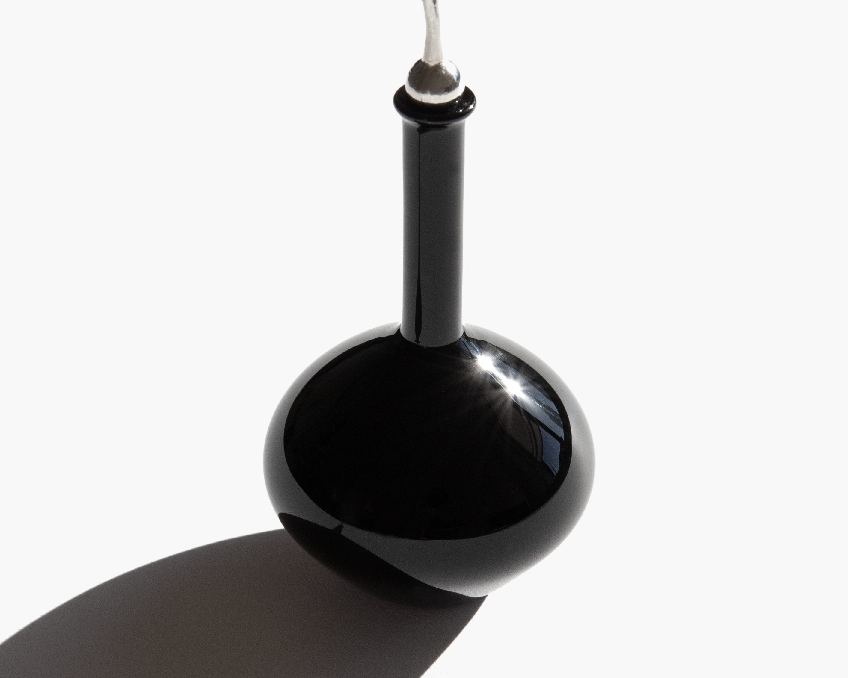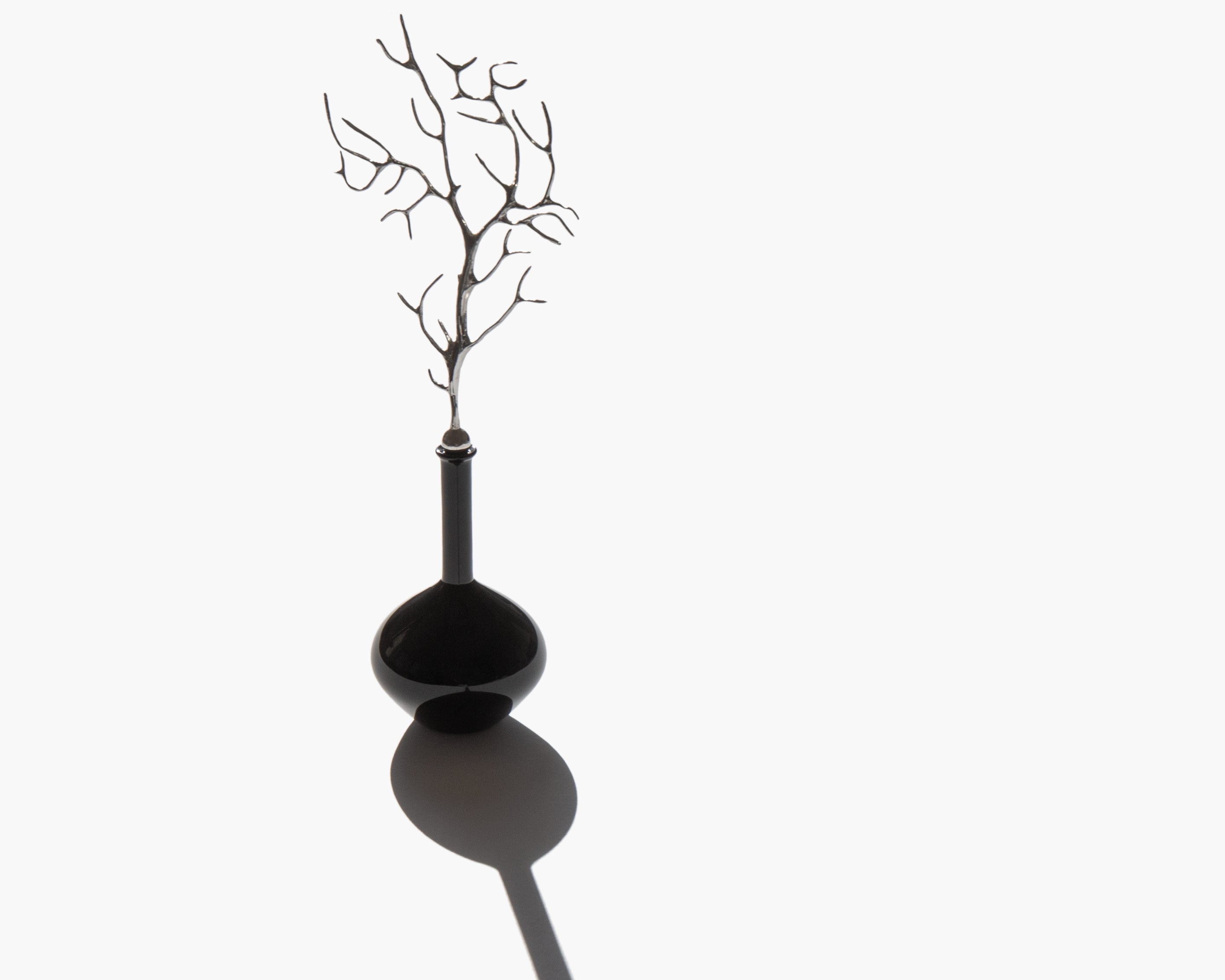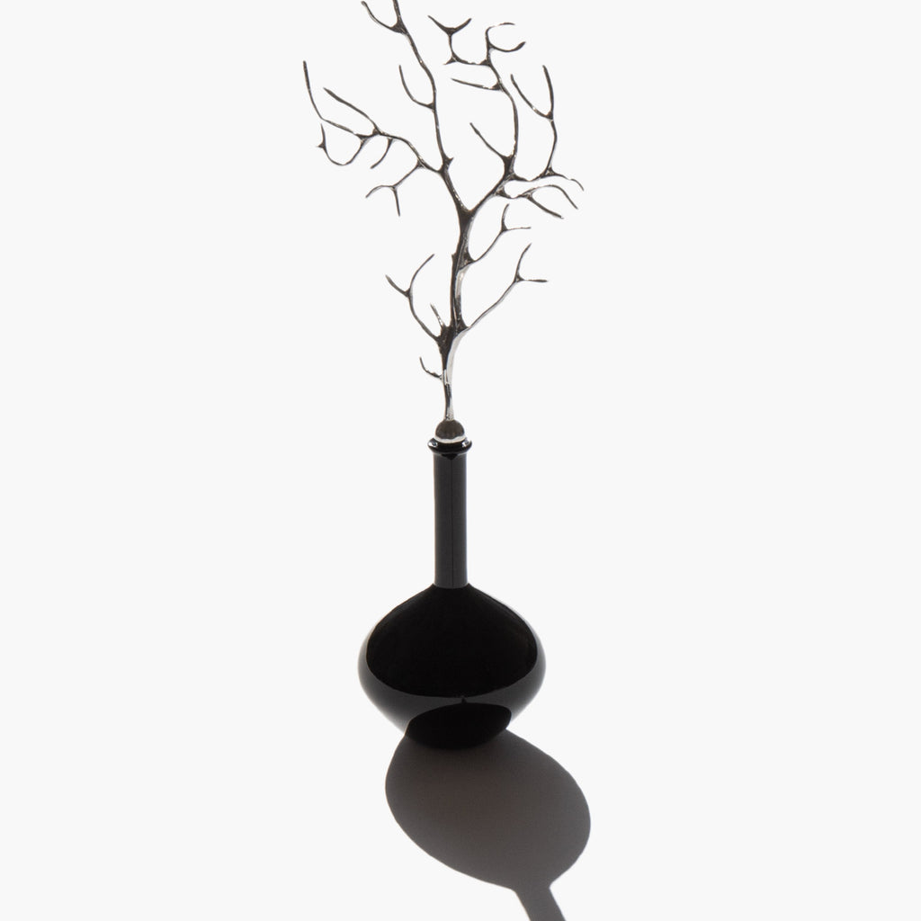 The sculptural black glass bottle is hand blown in Illinois by a master glass artisan and each one is topped with a hand worked recycled sterling silver perfume dabber. The dabbers are a series of interrelated talismans from the natural world, based on relics from our own curio collection – the vulnerable lobster, a large sea fan coral, the transformative antler, and a graceful spiral shell.