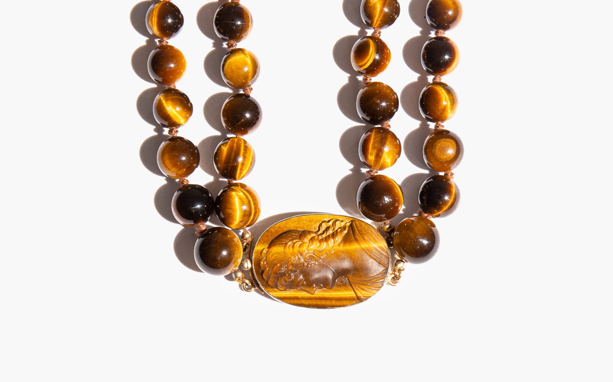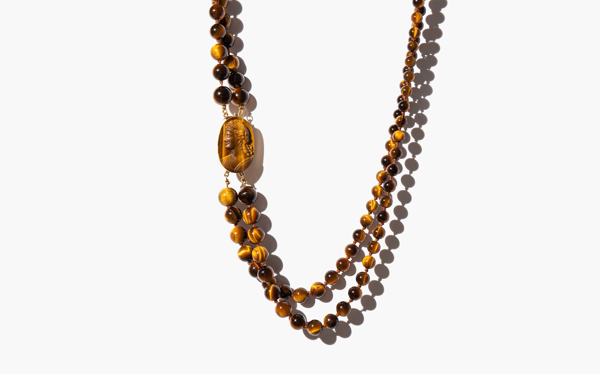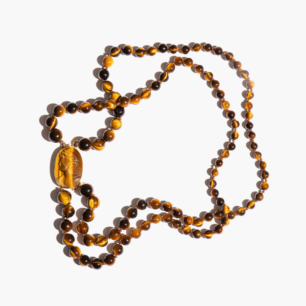 A 1970's stunner - 14k gold and carved tiger's eye cameo with a double strand of swirling, earth toned tiger's eye beads. Thought for centuries to possess supernatural qualities, tiger's eye is said to protect its wearer from the evil eye, bolster courage, and to ward off harmful spirit intrusions.