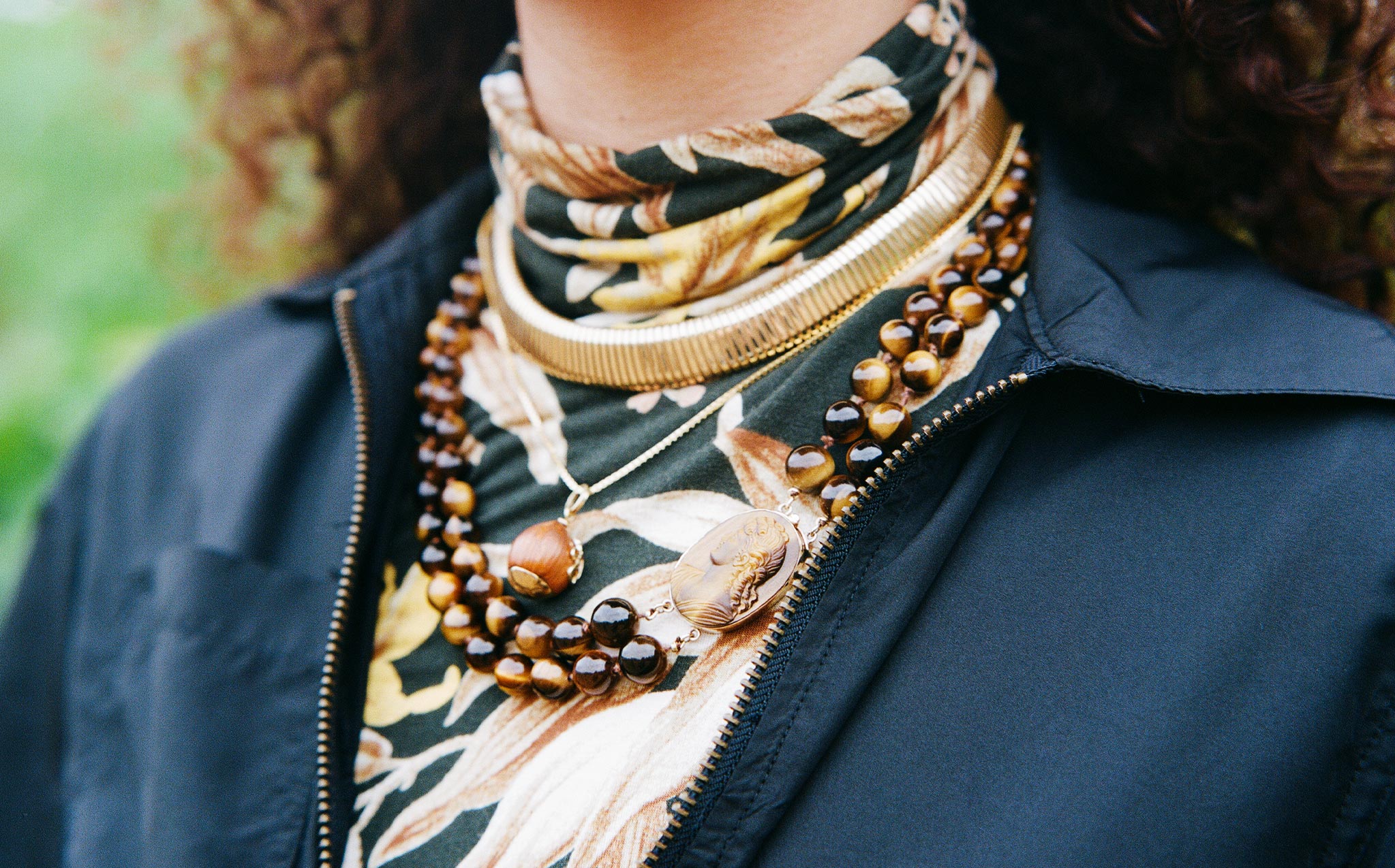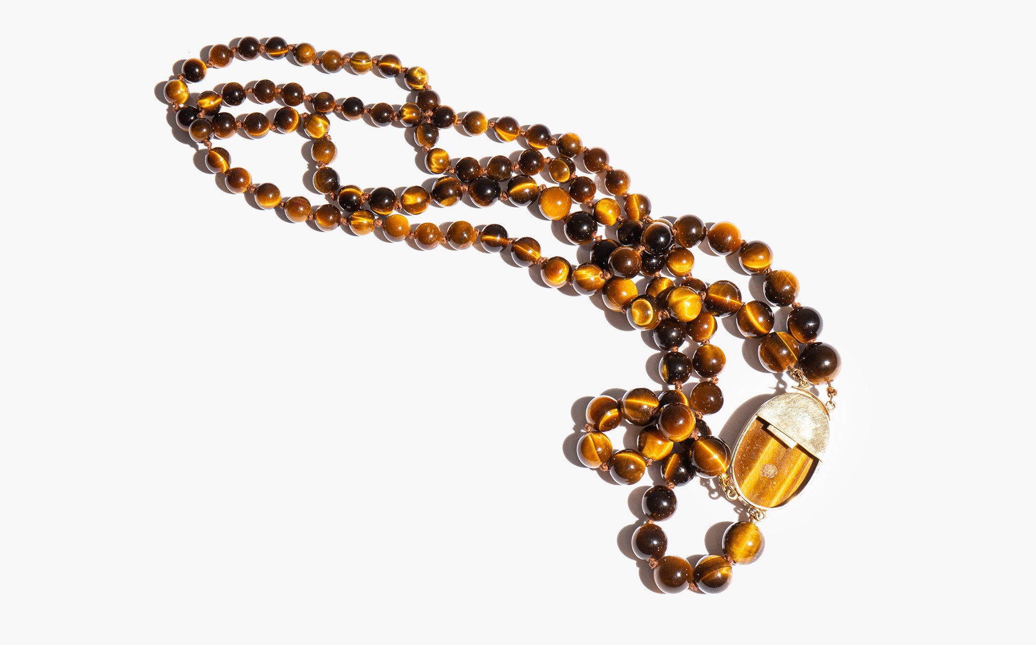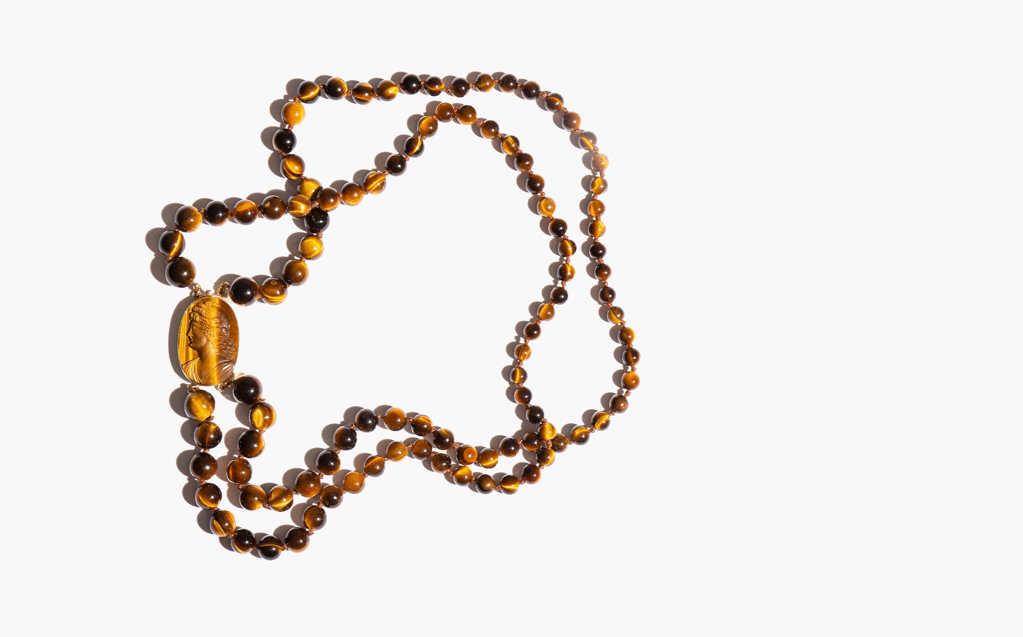 A 1970's stunner - 14k gold and carved tiger's eye cameo with a double strand of swirling, earth toned tiger's eye beads. Thought for centuries to possess supernatural qualities, tiger's eye is said to protect its wearer from the evil eye, bolster courage, and to ward off harmful spirit intrusions.