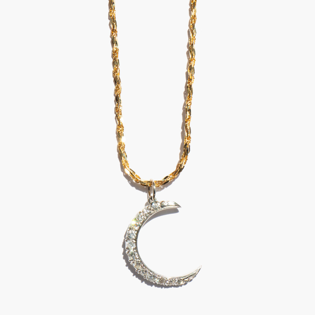 Sparkling white gold and diamond crescent moon pendant on a 14k gold chain with an unusual link. A particularly mystical motif, the crescent moon is the oldest known symbol, dating back to the second millennium BC. A feminine symbol associated with the moon goddess, the crescent is used to denote female empowerment, enlightenment, and new beginnings.