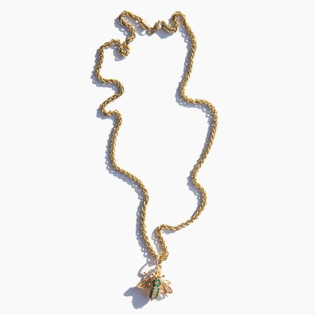 Thick 14k gold wheat link choker with a fantastically detailed 14k gold bee charm with diamond and emerald accents. The bee is a powerful symbol of inner strength, sexuality, and love. **This item takes 1-2 weeks to ship, email info@kindredblack.com for more details**
