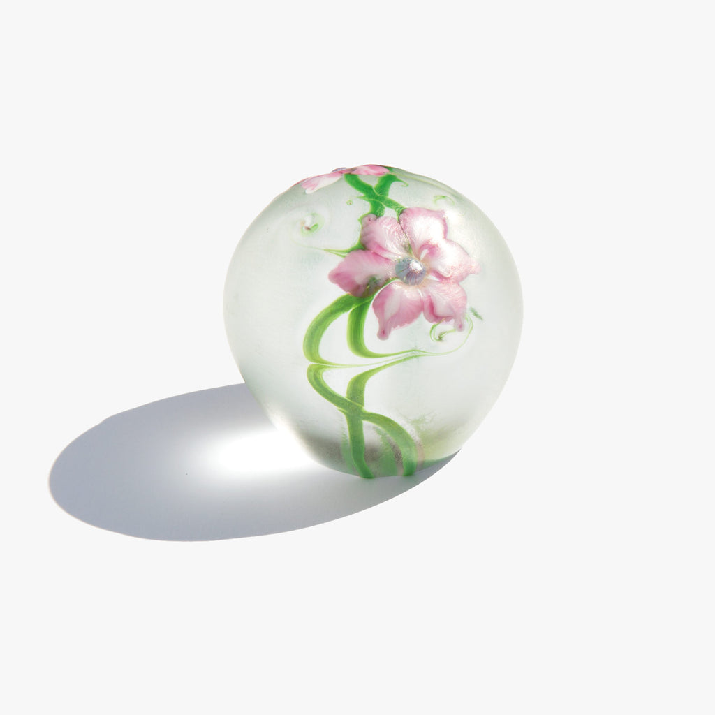 Handmade and signed art piece of frosted glass with delicate pink flowers and stems.