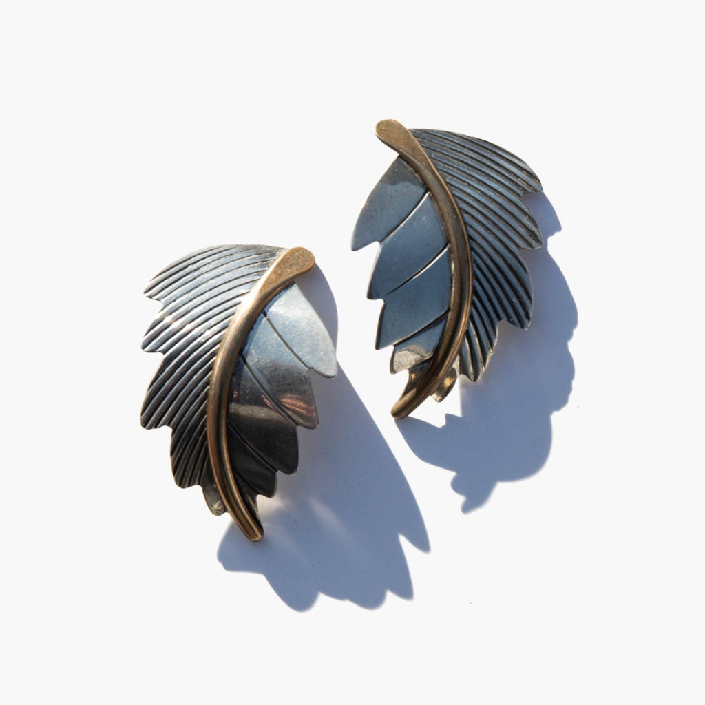 Graceful brass and sterling silver clip-on leaf earrings.
