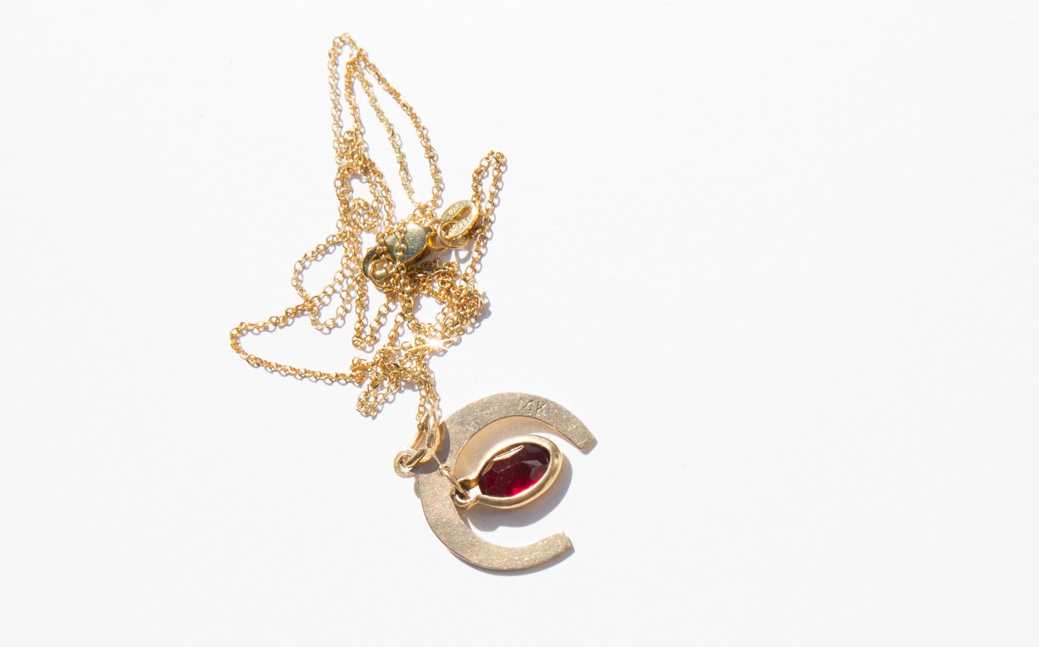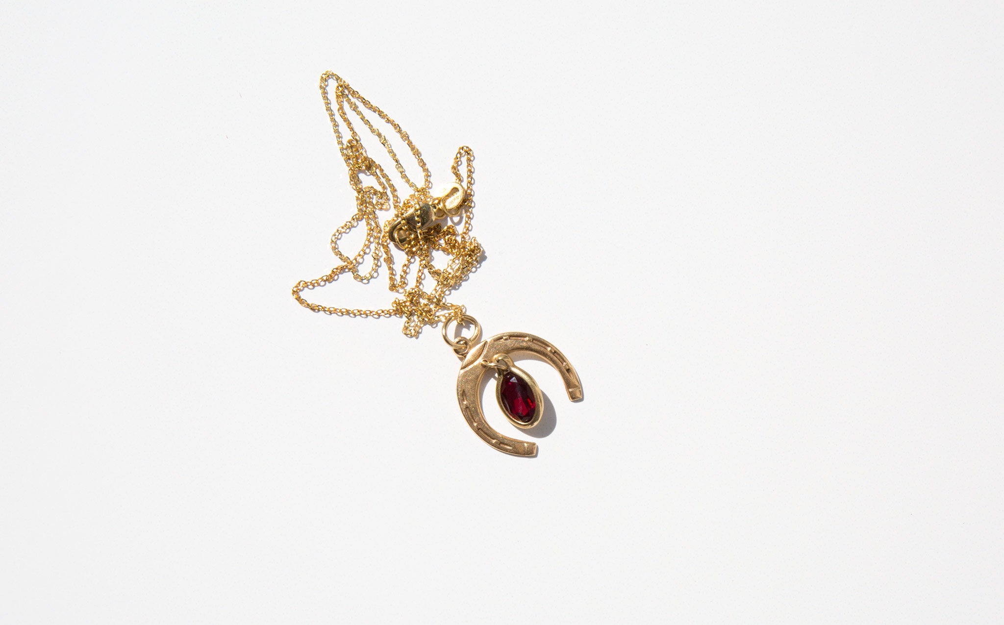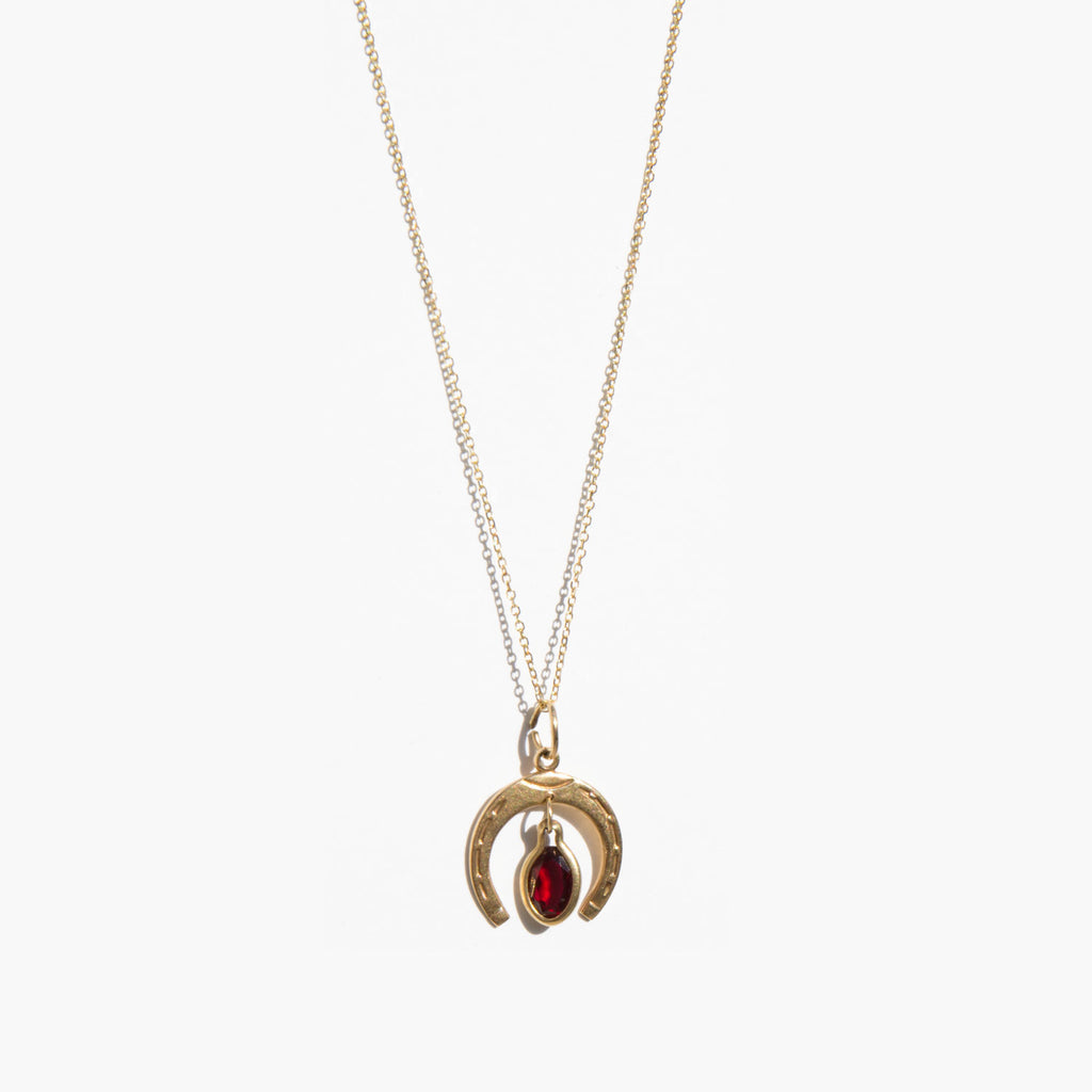 Delicate 14k gold chain with a 14k gold and garnet horseshoe charm. The horseshoe has been a symbol of good luck for centuries and garnet is often gifted between friends and loved ones for protection before a period of extended separation.