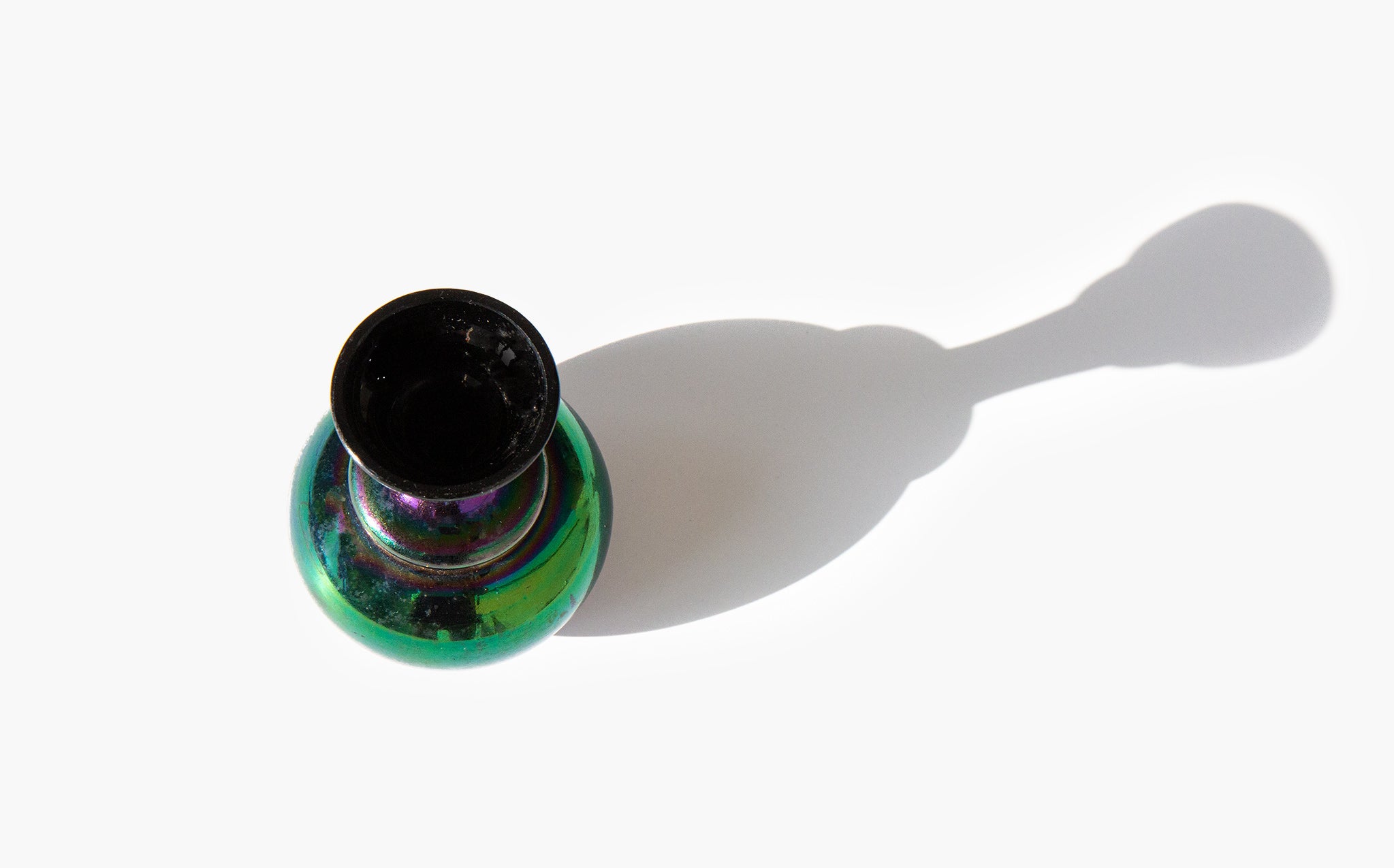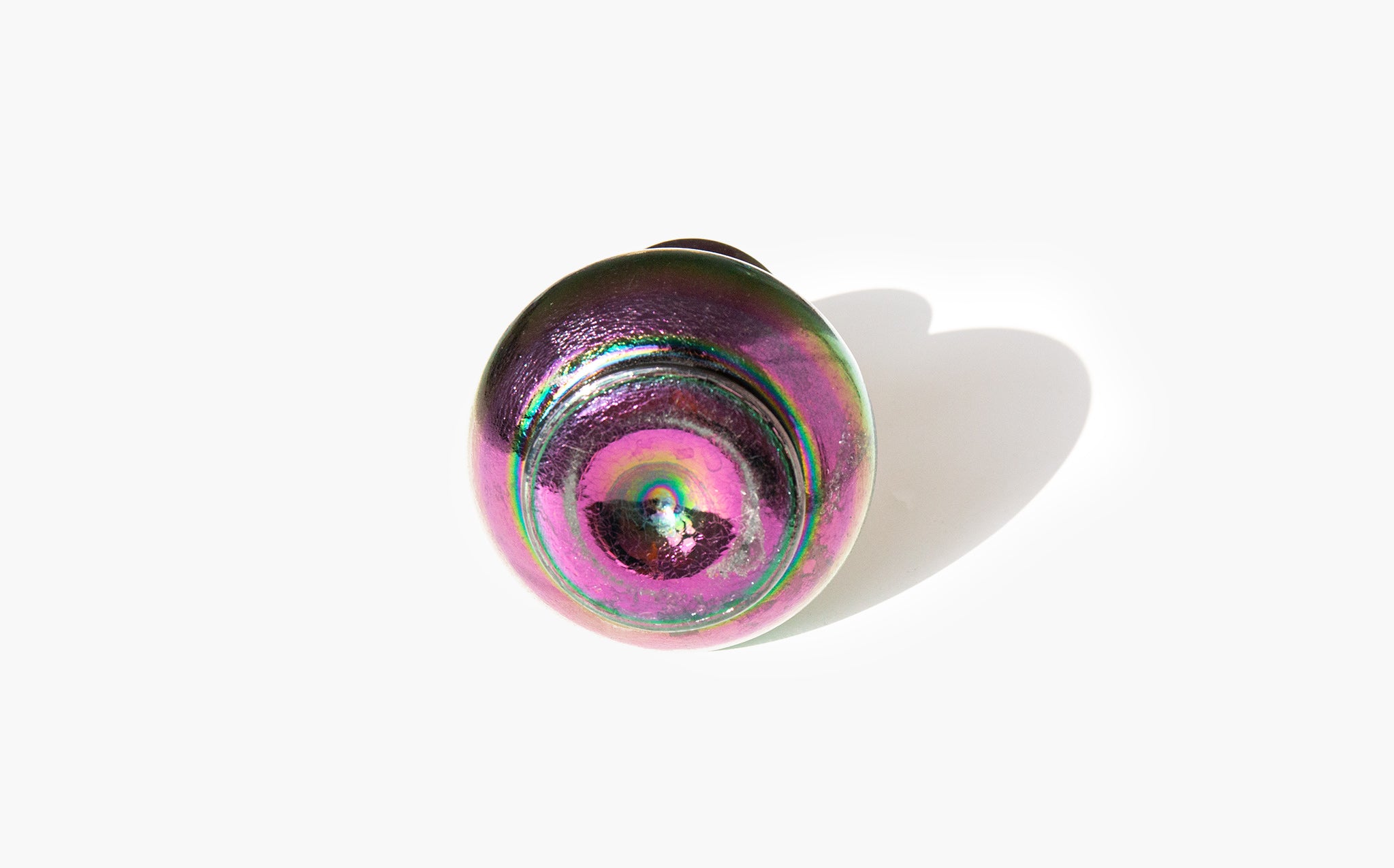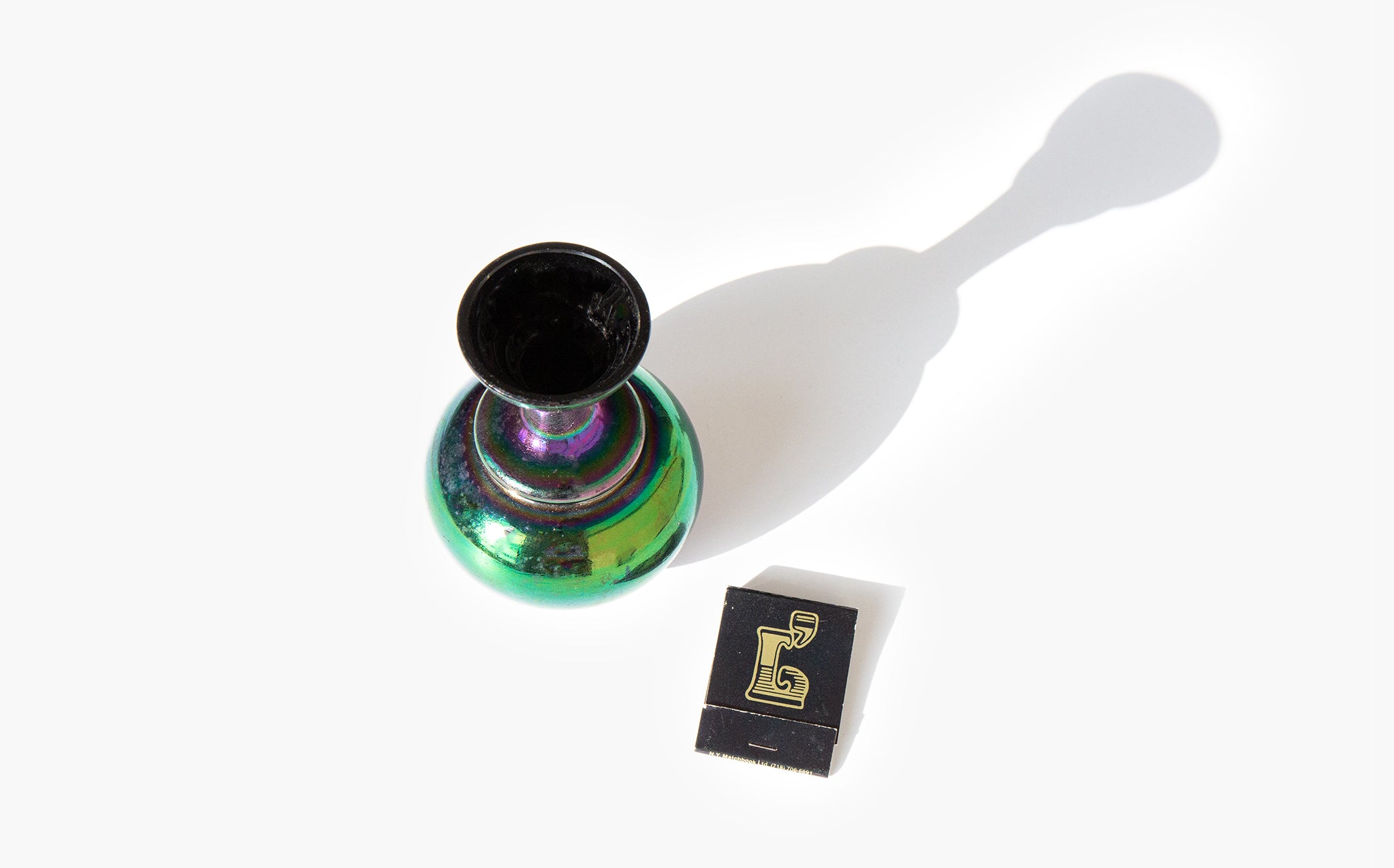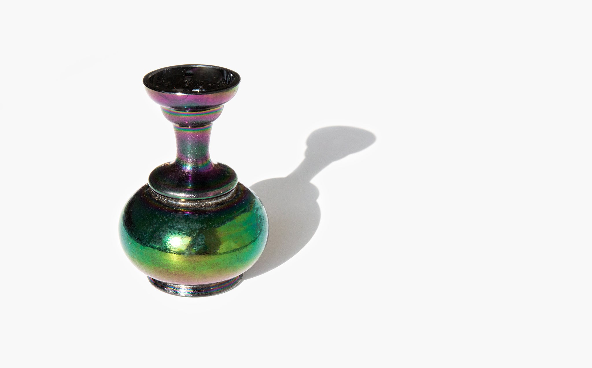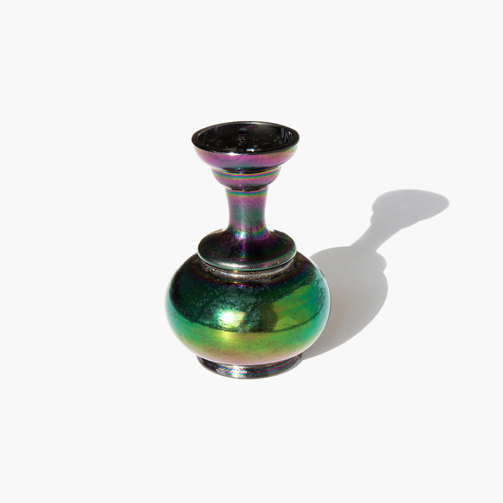 Sculptural bud vase in deep black glass with an iridescent oil slick finish.