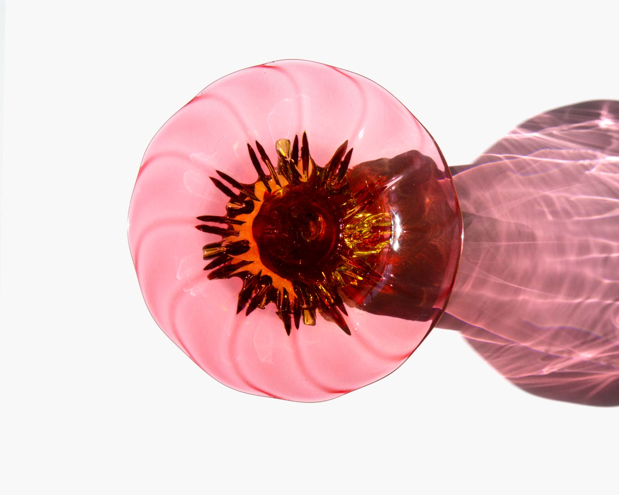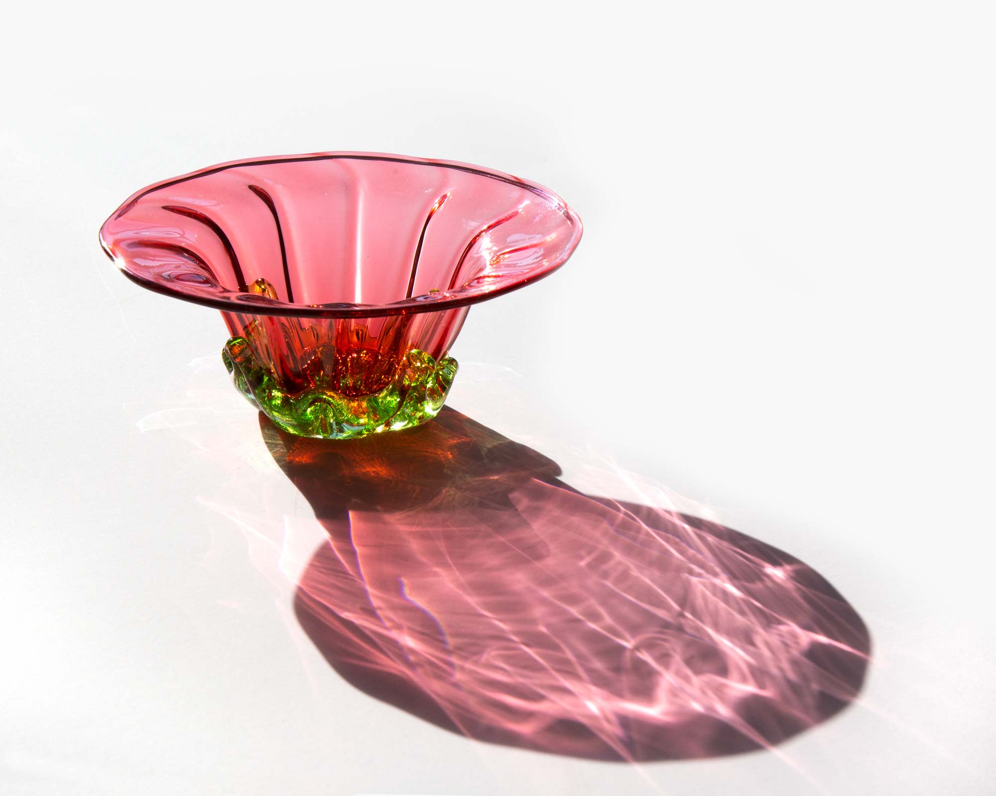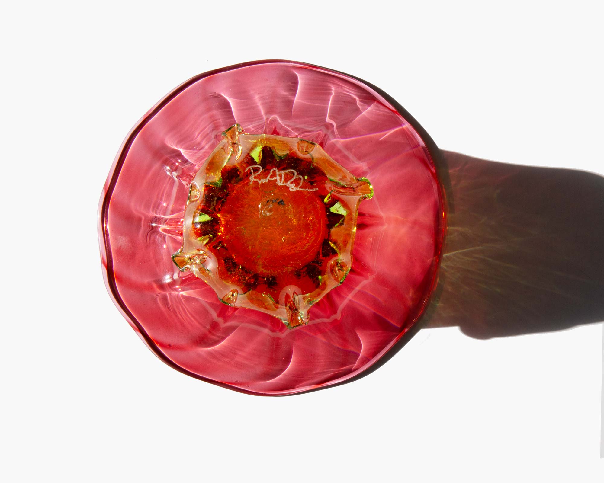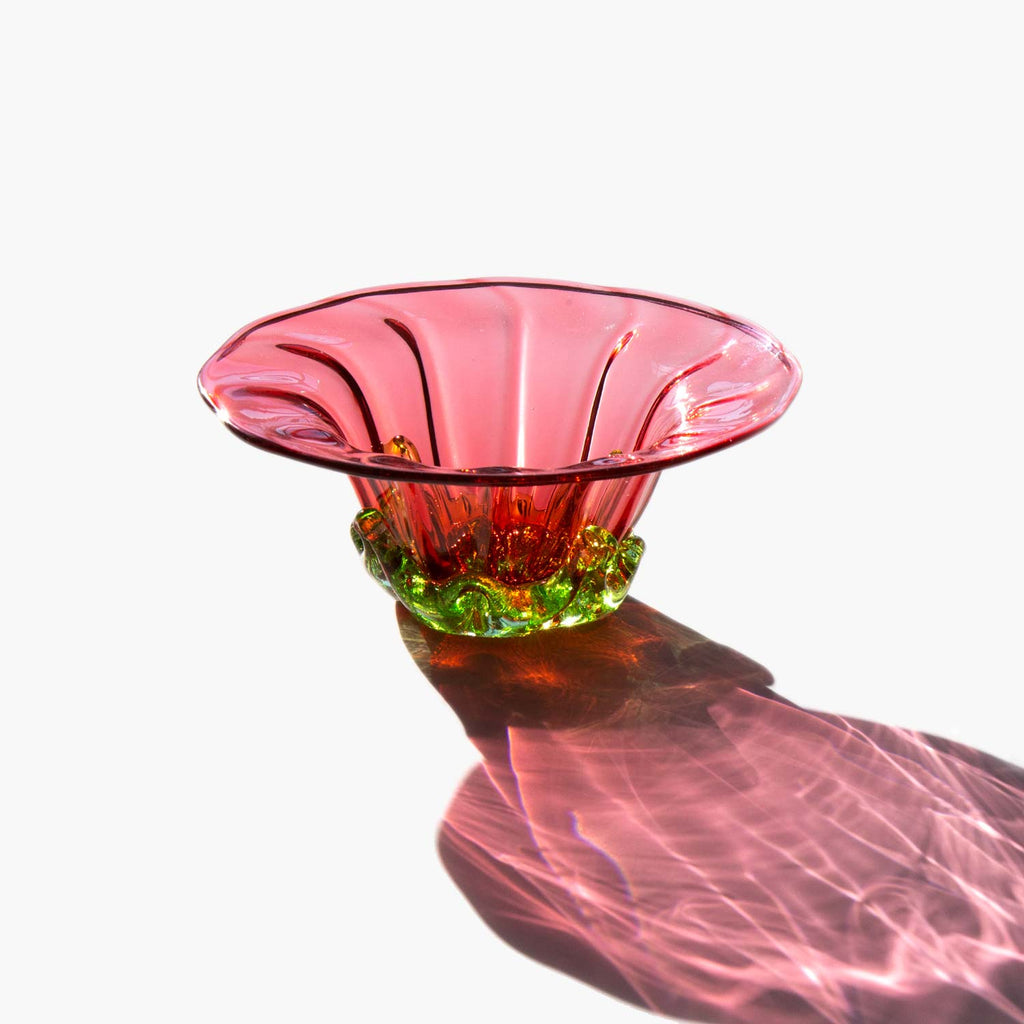Sculptural hand blown glass flower bowl, signed by the artist. A pretty size for serving or on the vanity top as a jewelry and trinket dish.