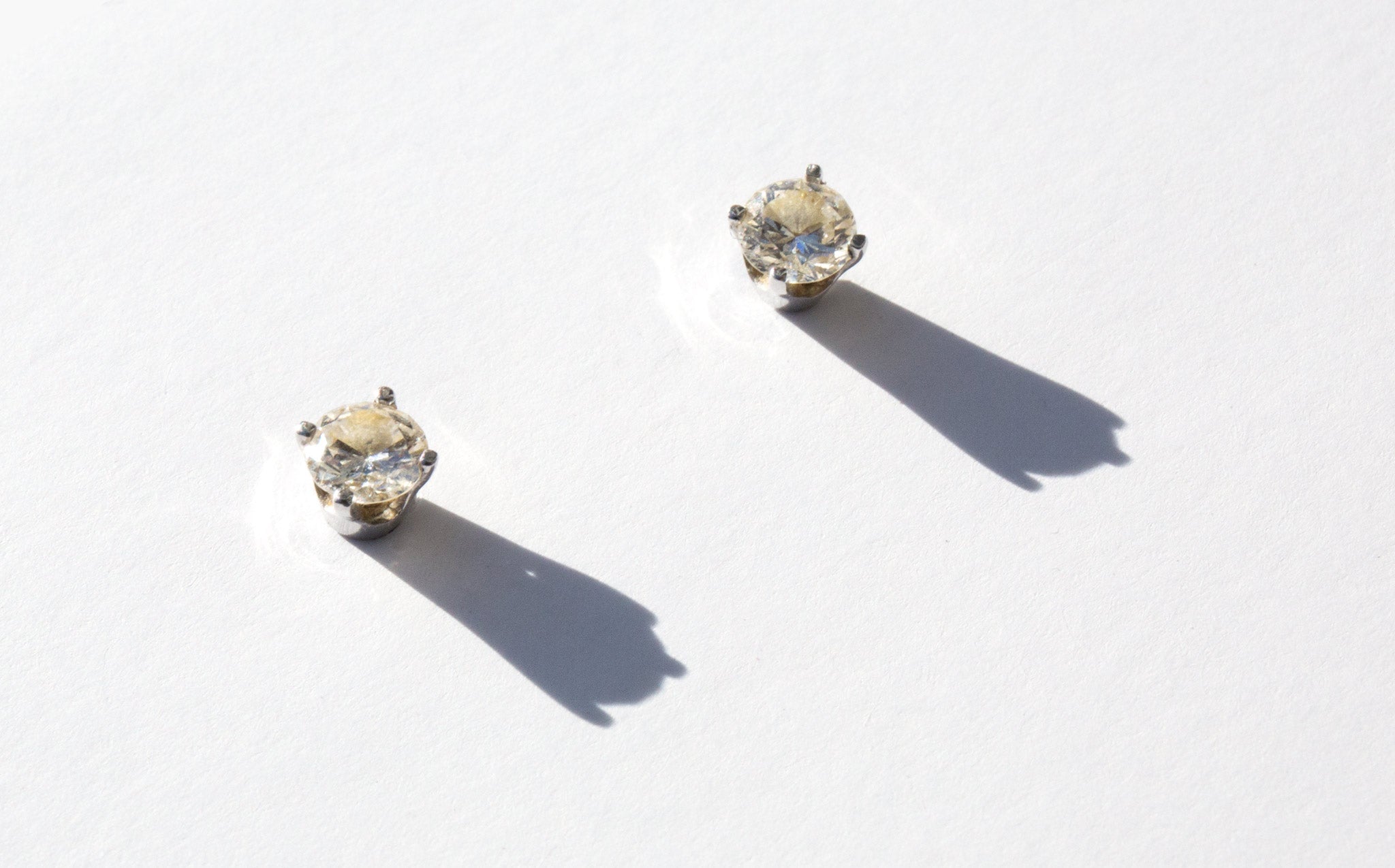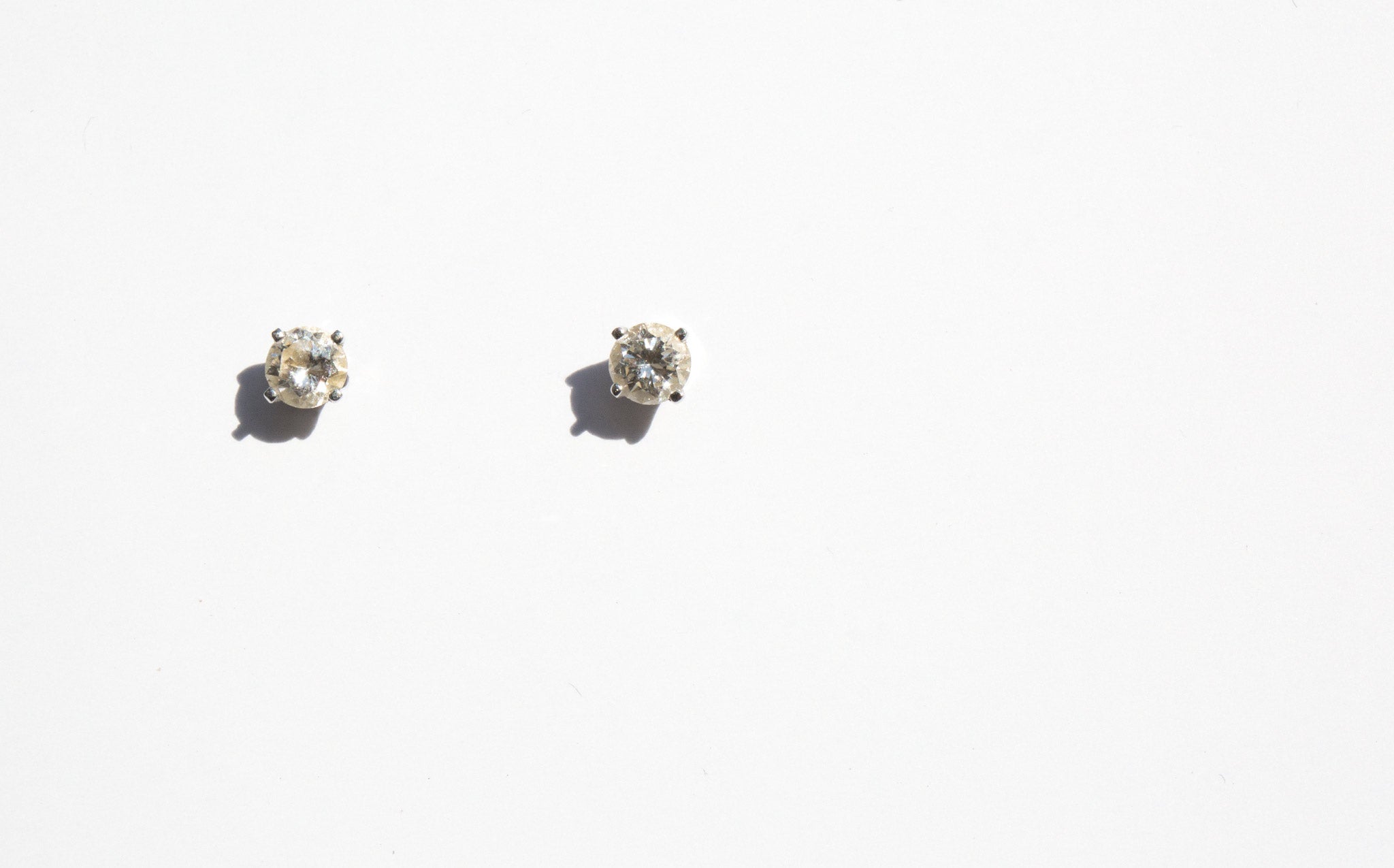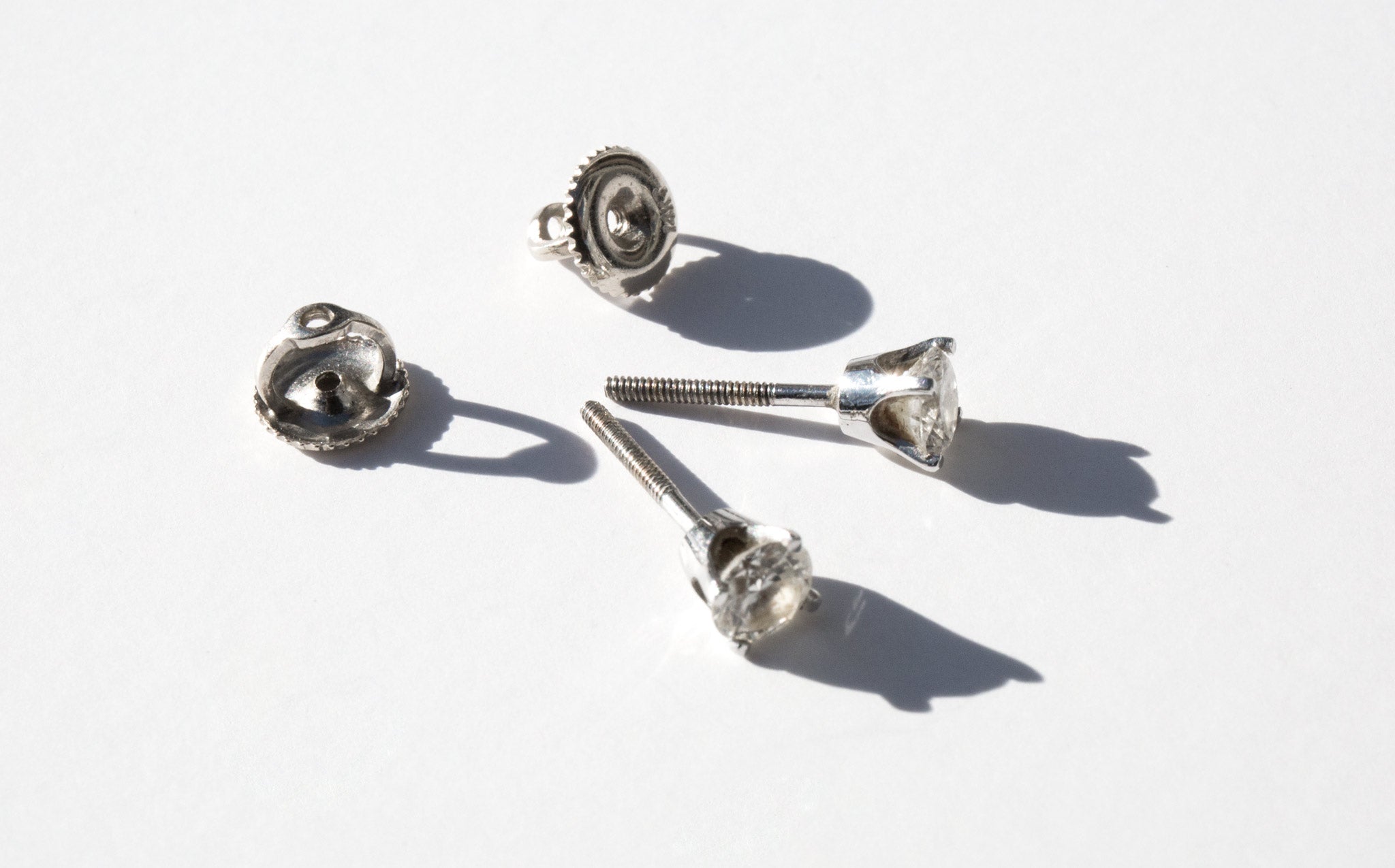 Diamond stud earrings set in 14k white gold with secure screwback stud earrings.