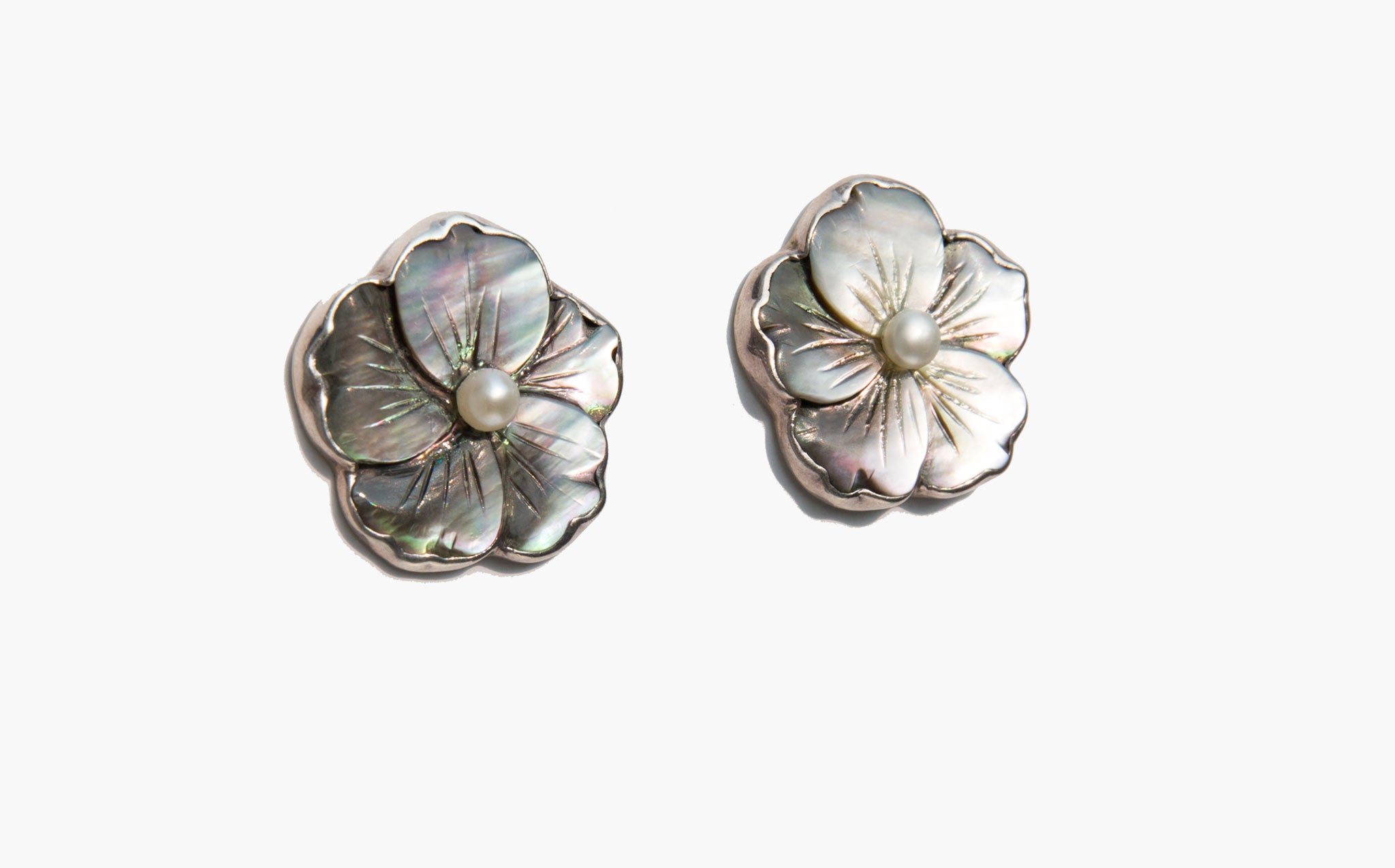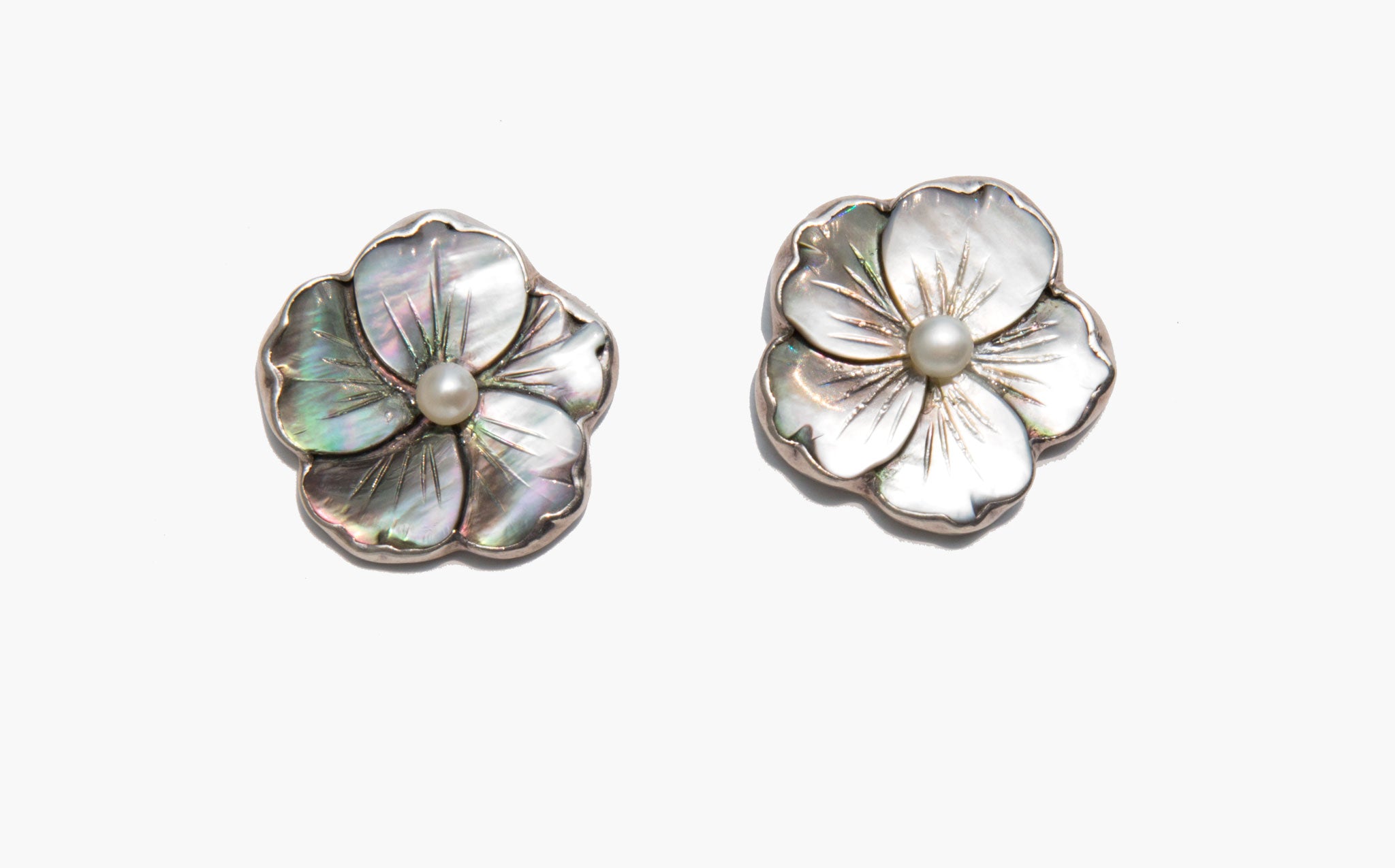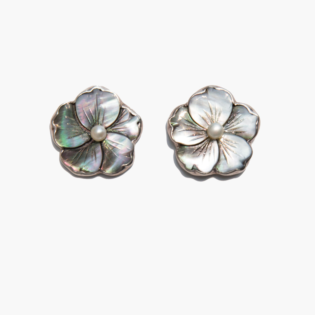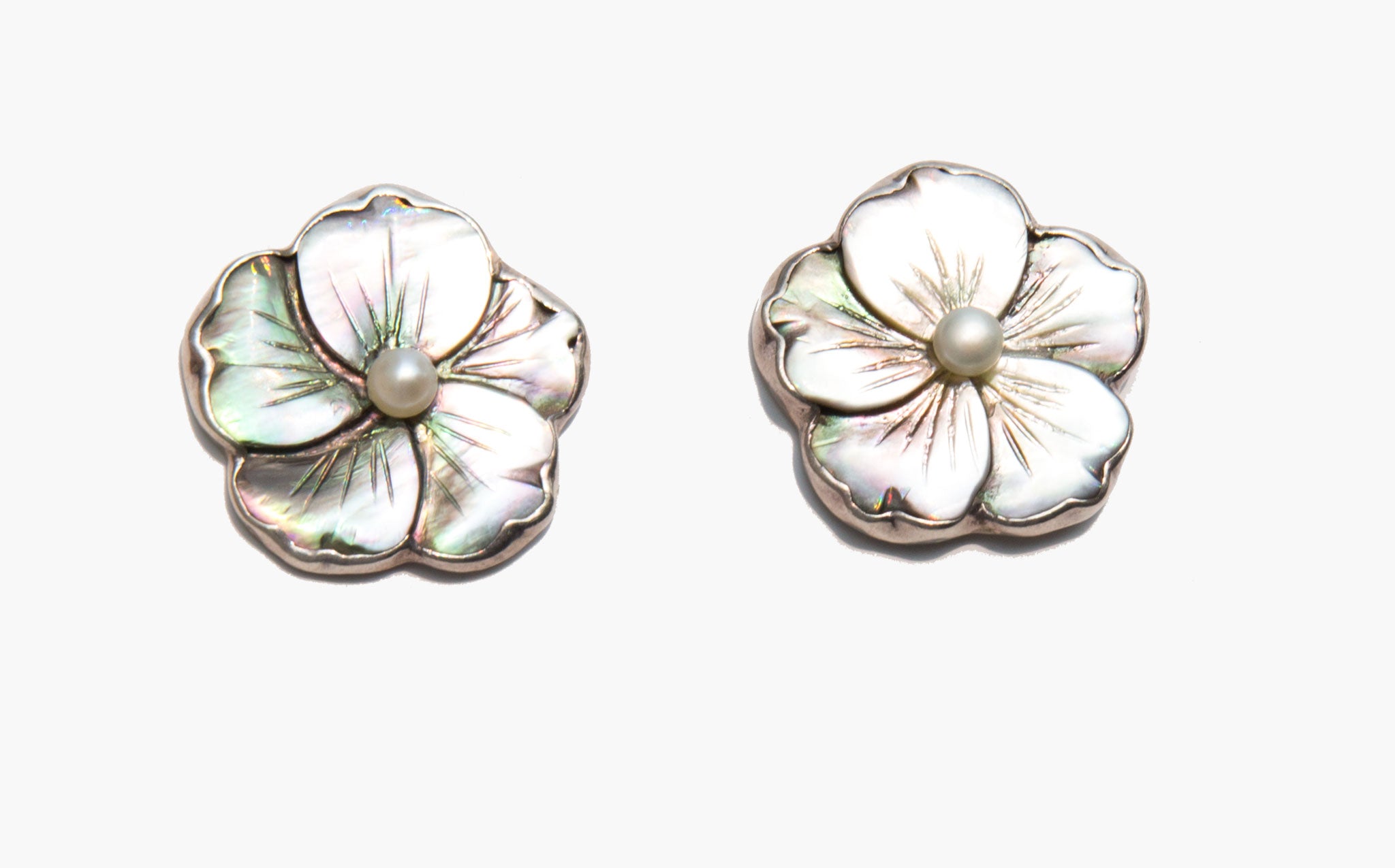 Sterling silver and mother of pearl flower earrings with a delicate center pearl.
