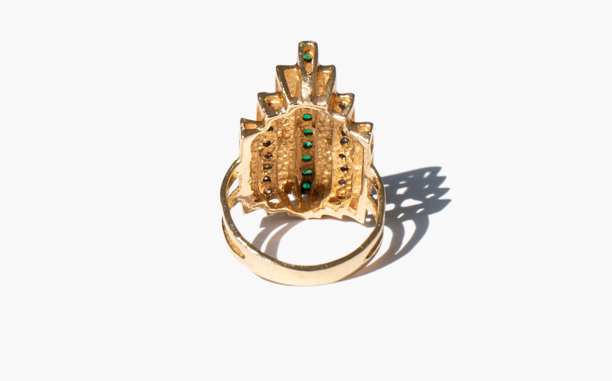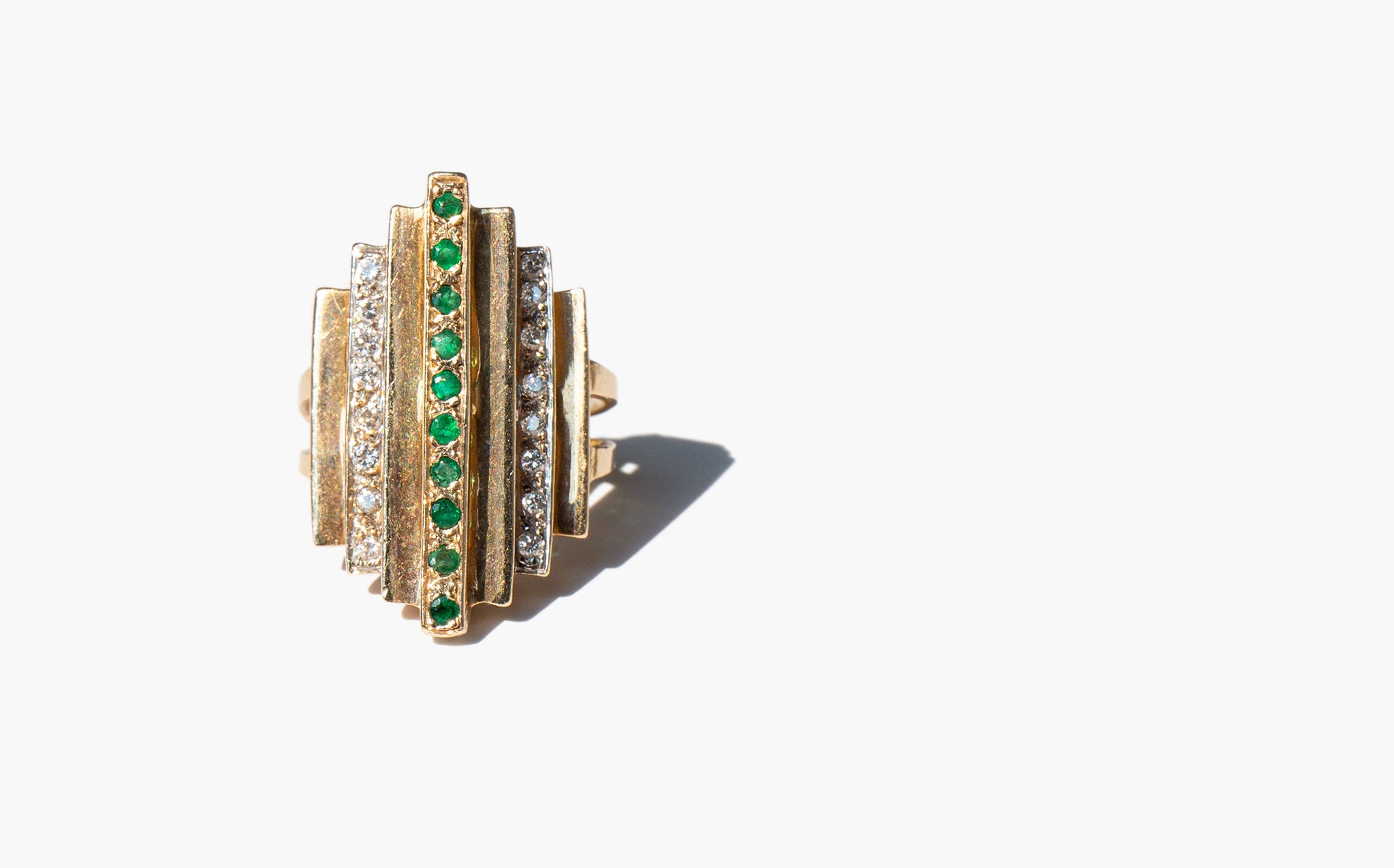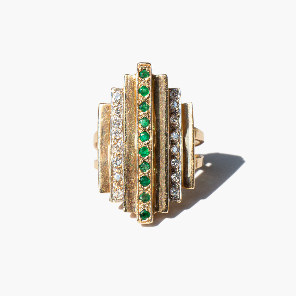 Art deco, graduated 14k gold ring with emerald and diamond accents.
