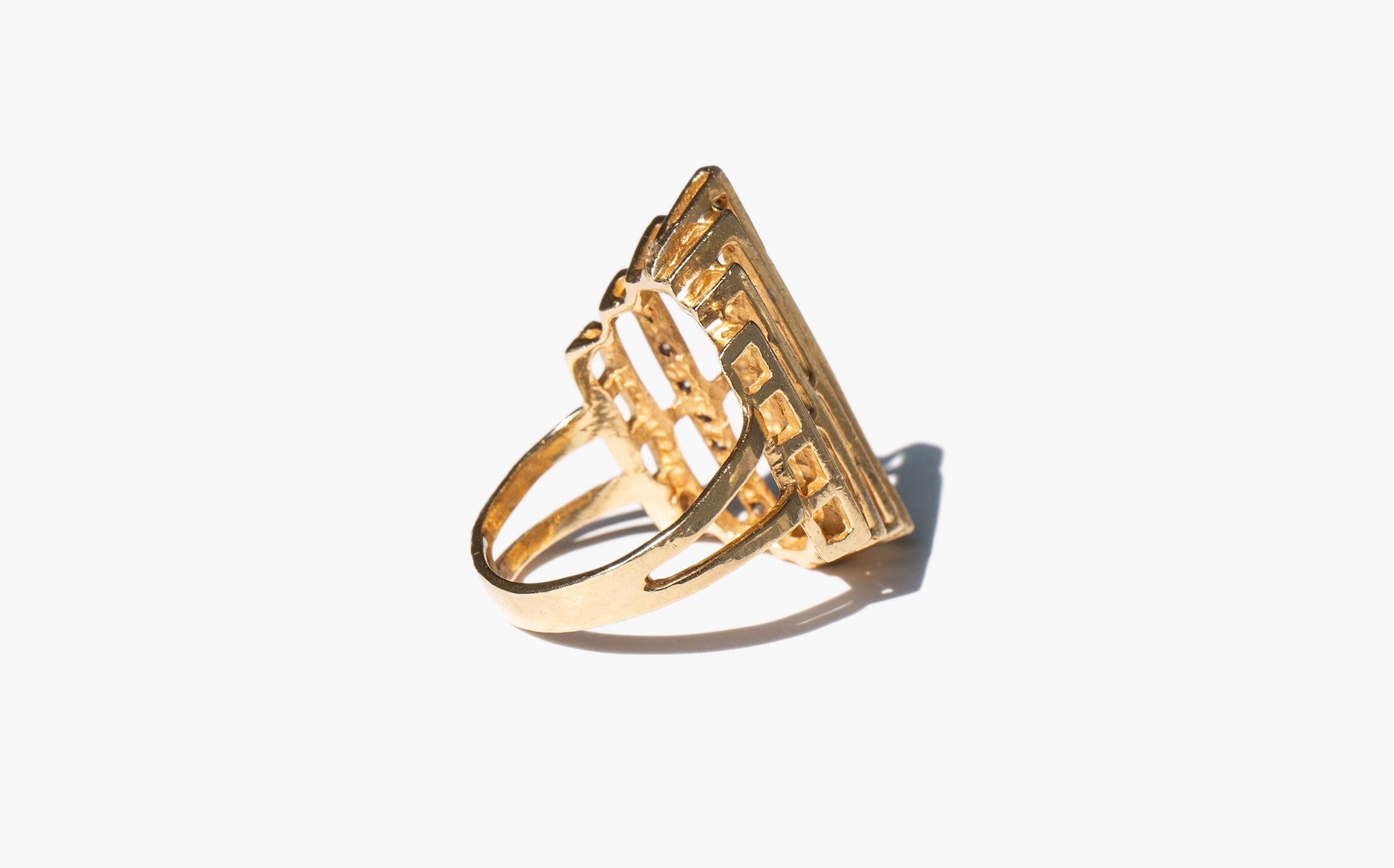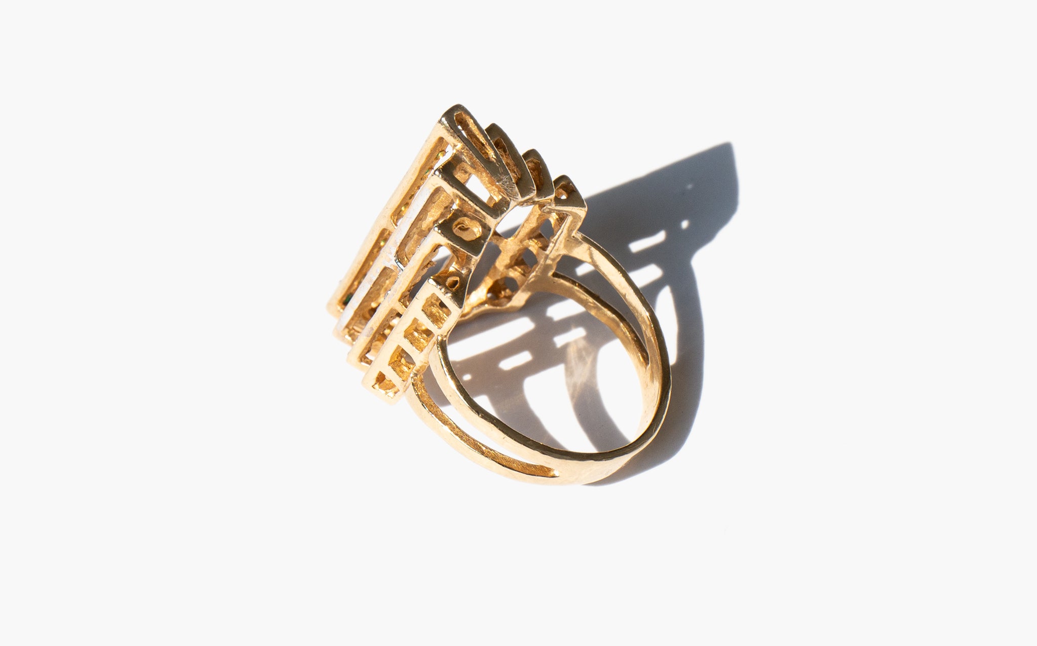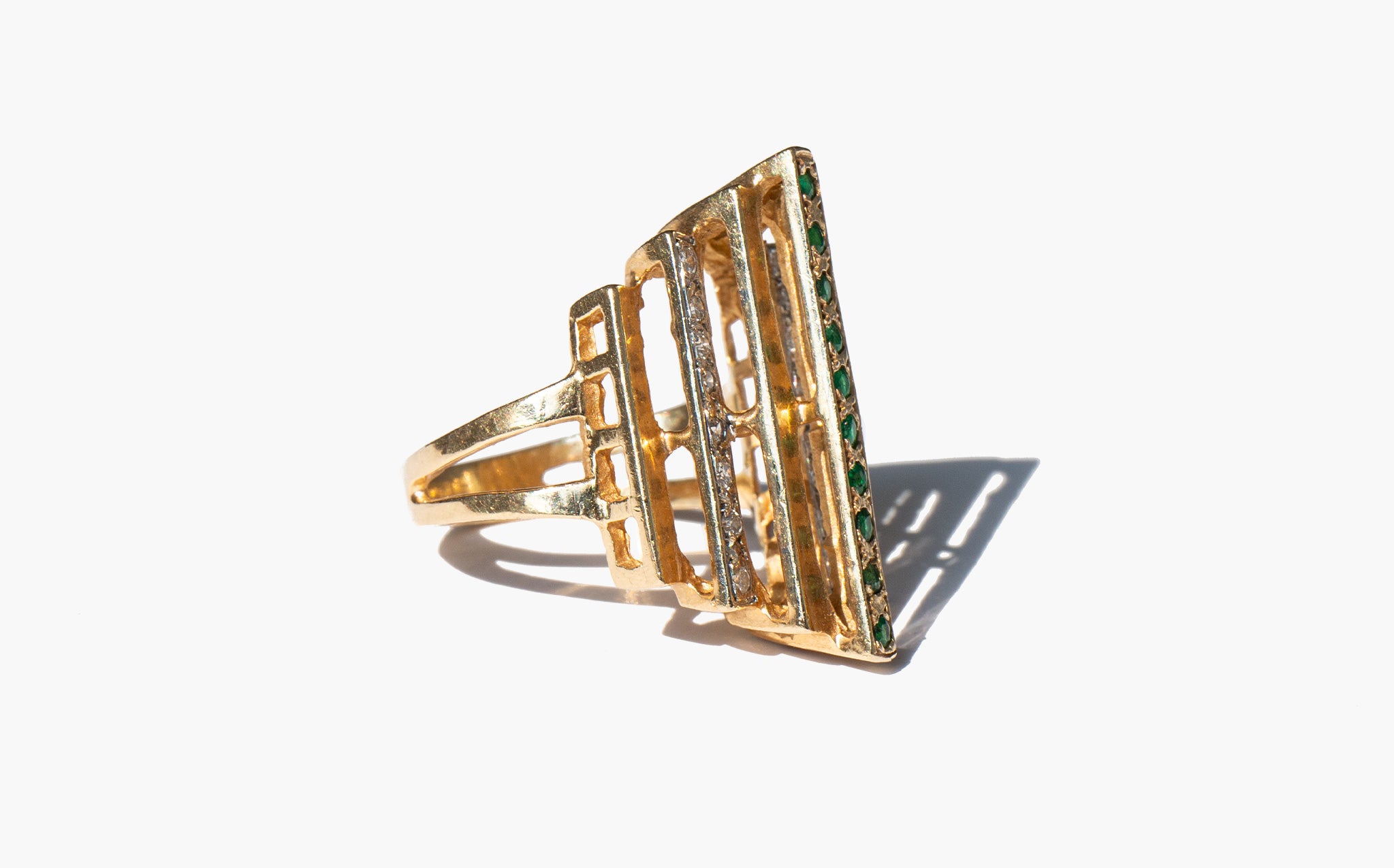 Art deco, graduated 14k gold ring with emerald and diamond accents.
