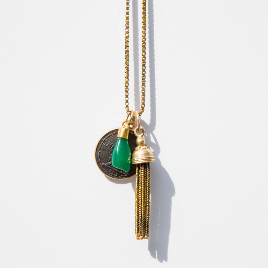 We've been thinking a lot lately about the ways in which humans can turn negative and vulgar impulses like hate, greed or selfishness into the more noble qualities of love, compassion and empathy. Particularly timely for the upcoming election, this charm necklace is a combination of gold, the color black and the mano figa, an Italian charm of protection against the external influences of evil.