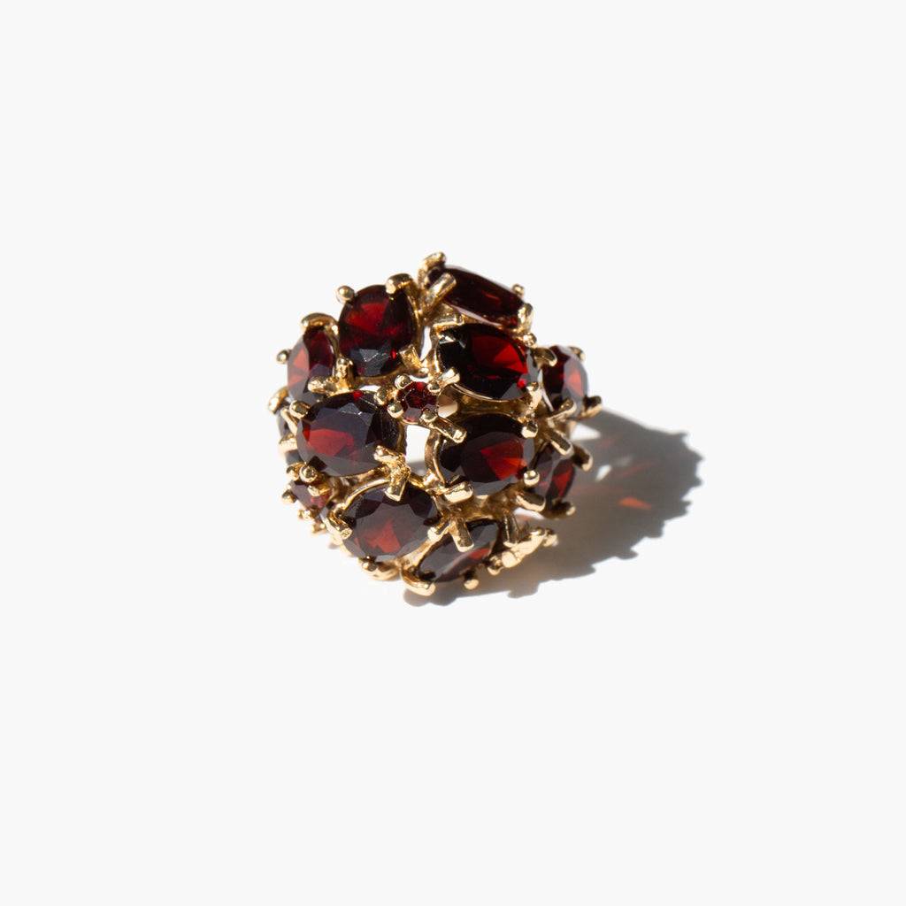 Luxurious 14k gold setting with a nest of shimmering garnets. A popular amulet of the middle ages, the garnet was thought to guard against evil spirits in the night, and was used for general protection against malevolent spiritual forces and negative energy.