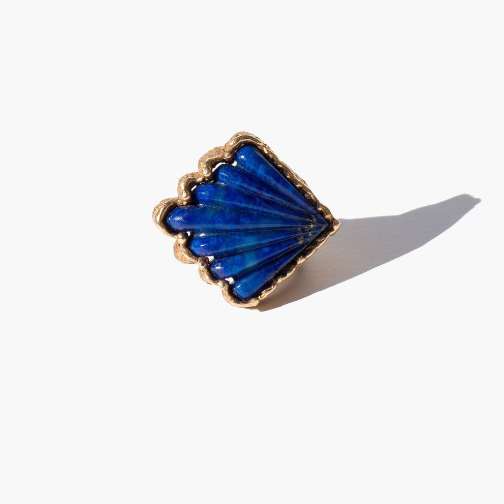 Unusual 14k gold shell shaped setting with a large, brightly colored lapis center stone. Lapis is a stone thought to help release self-expression and inner truth.