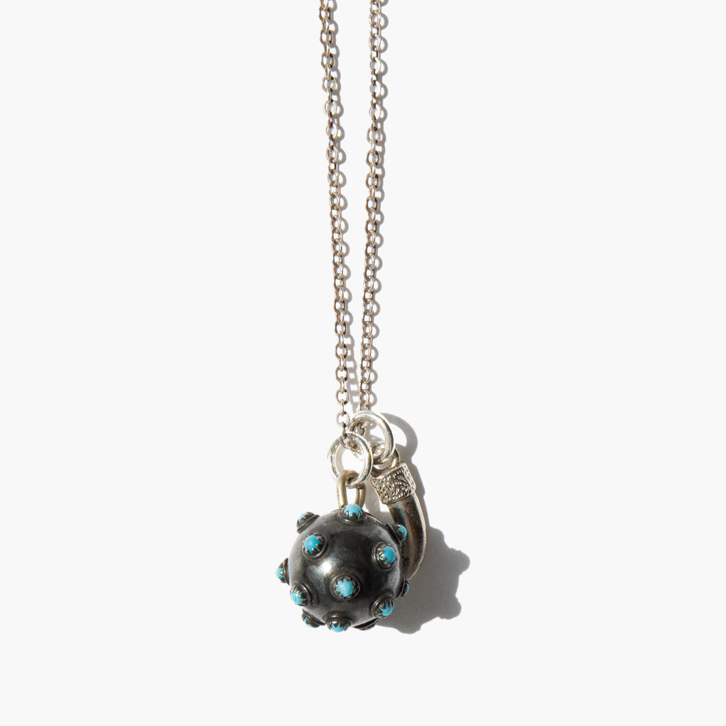 Sterling silver link chain with an antique Victorian oxidized sterling silver charm with turquoise accents. One of the oldest amulets known to humankind, turquoise is said to release negativity to free the mind for other, more productive pursuits. The sterling silver Italian horn amulet or corno is a portafortuna, meaning lucky charm and is protection against the evil eye, among other nefarious forces.