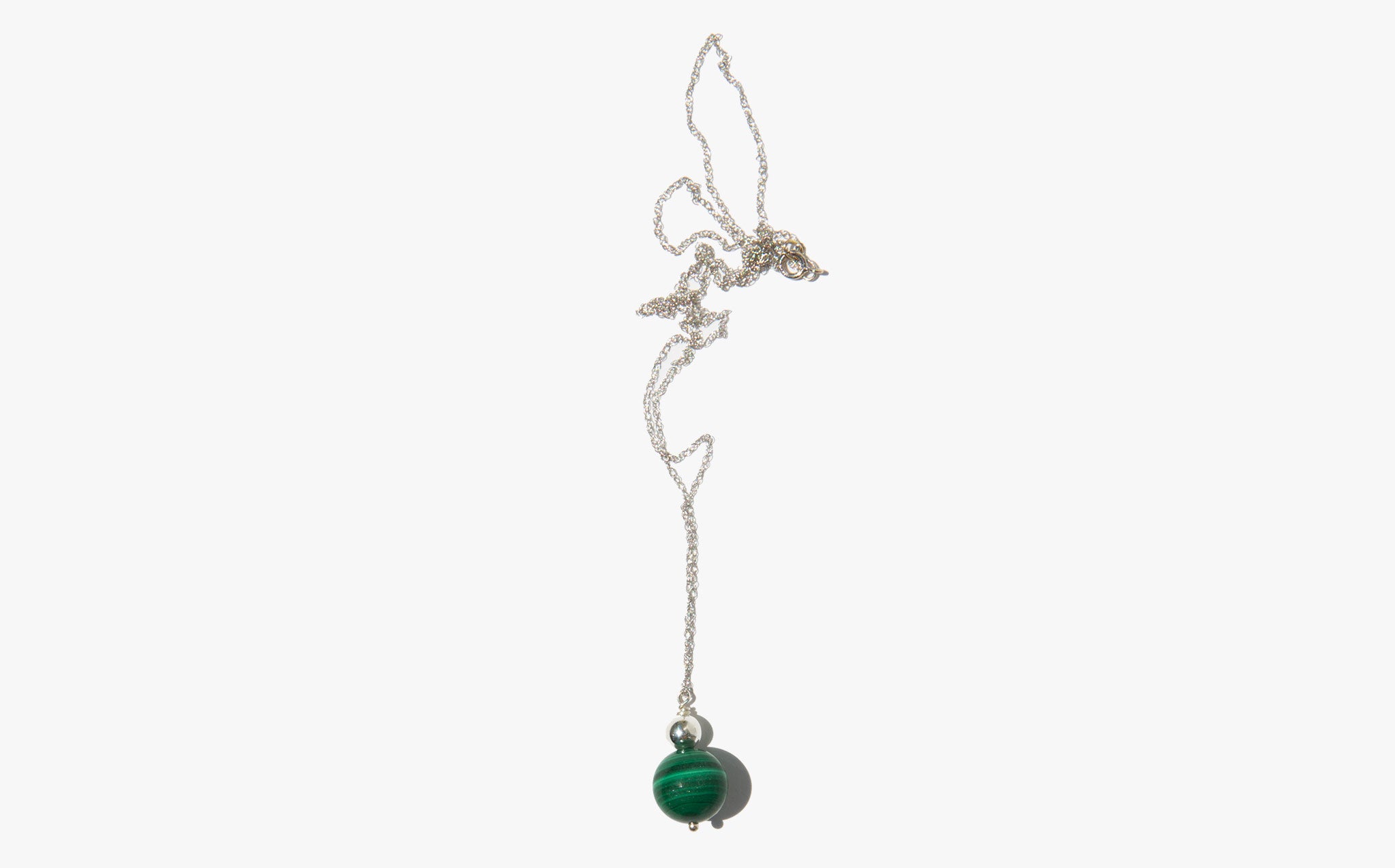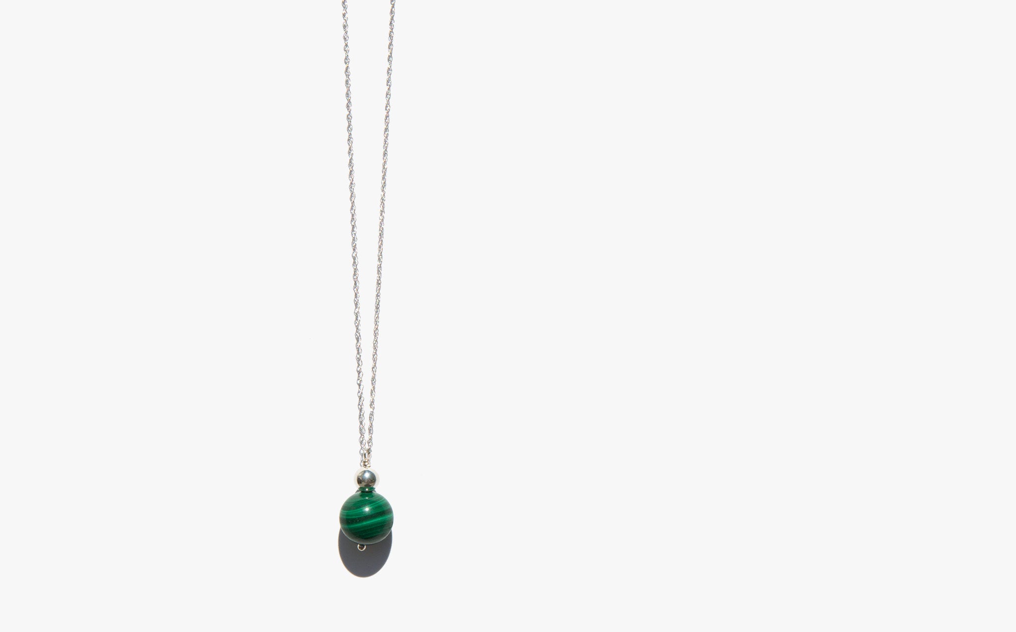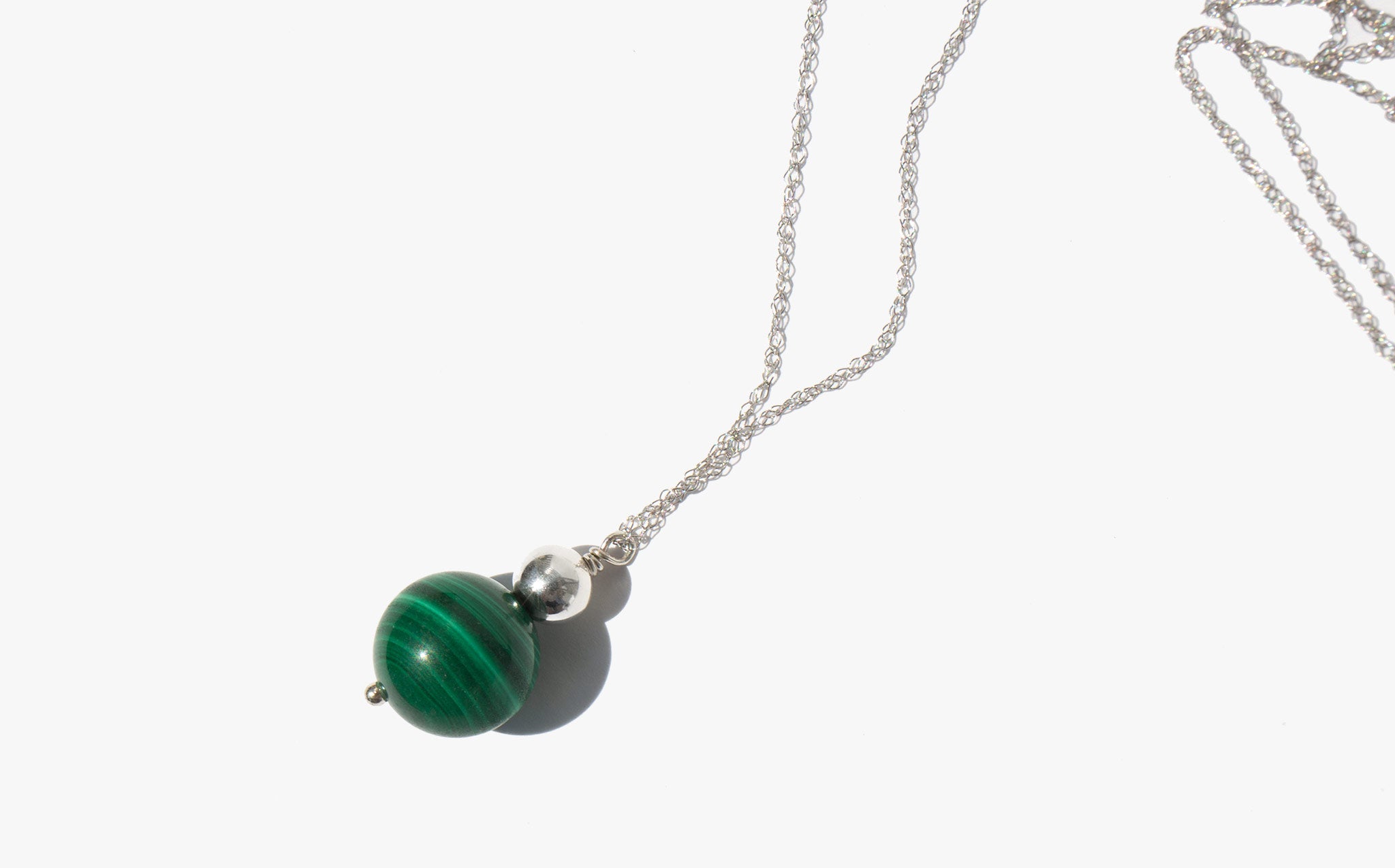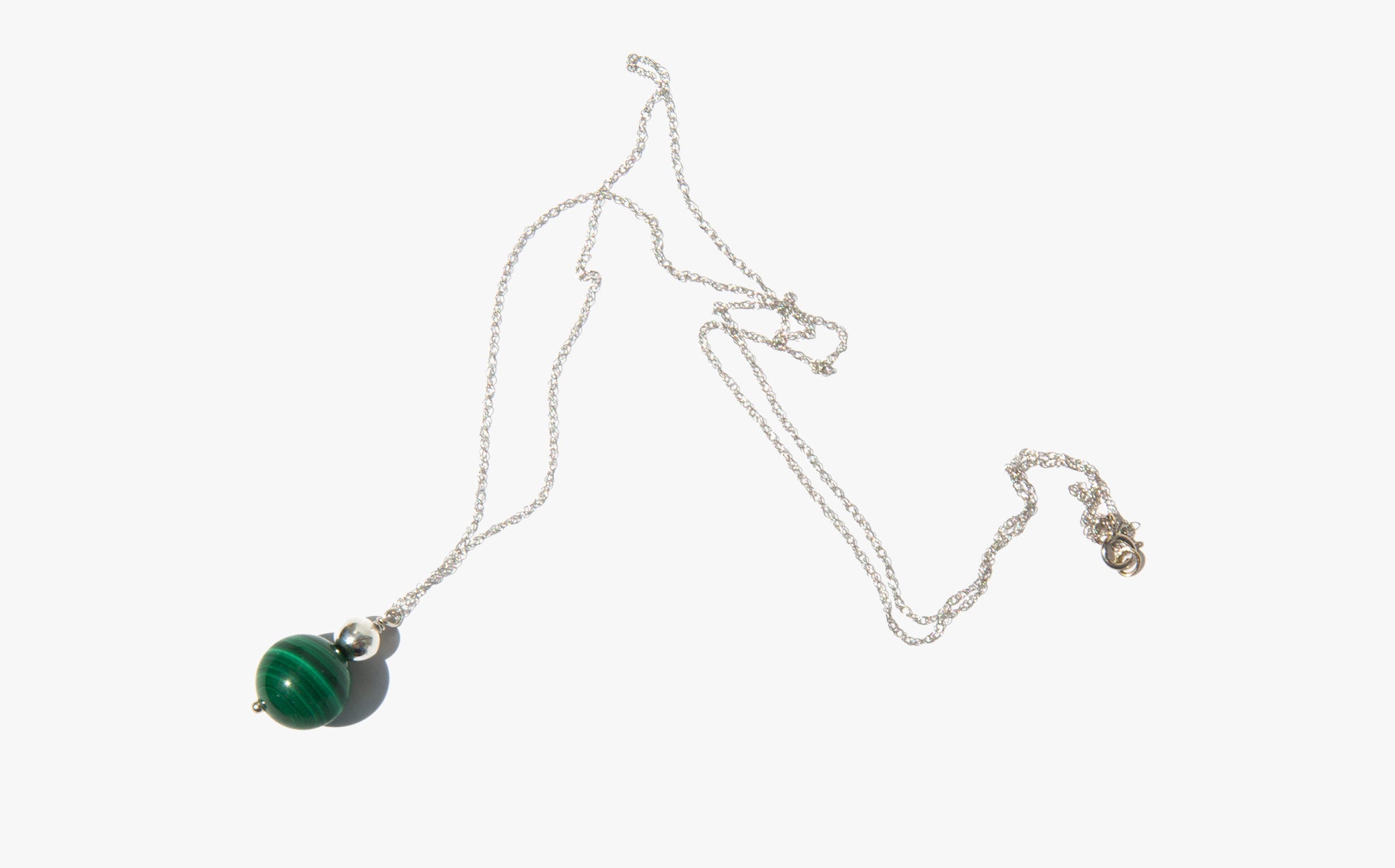 A lustrous deep green malachite sphere pendant on a delicate sterling silver cable link chain.