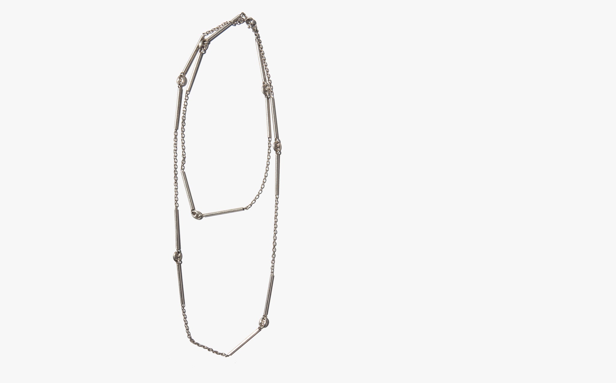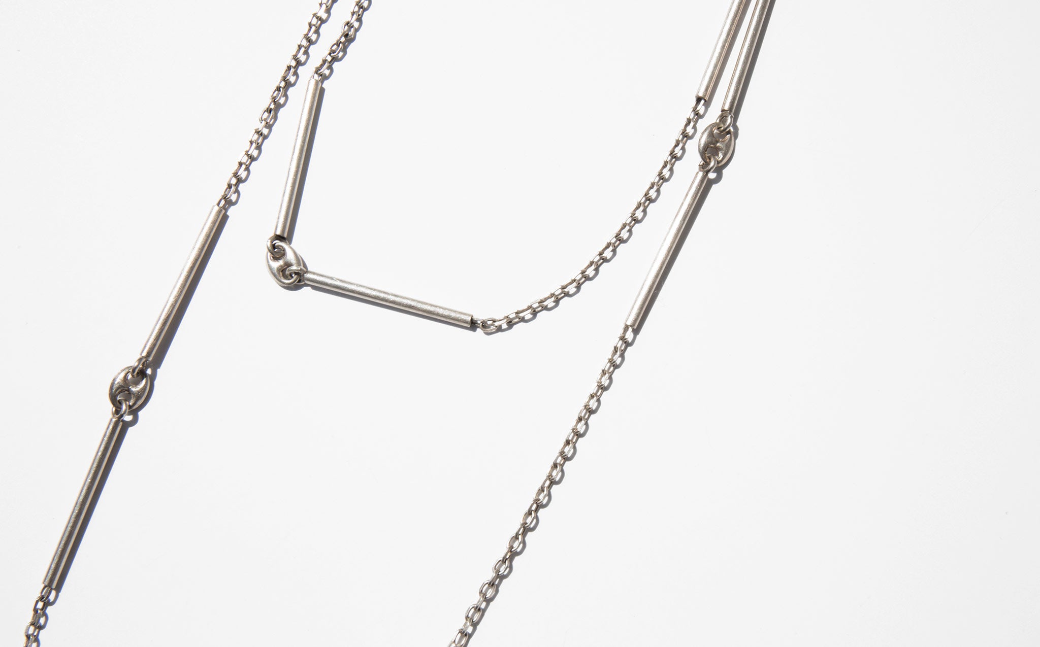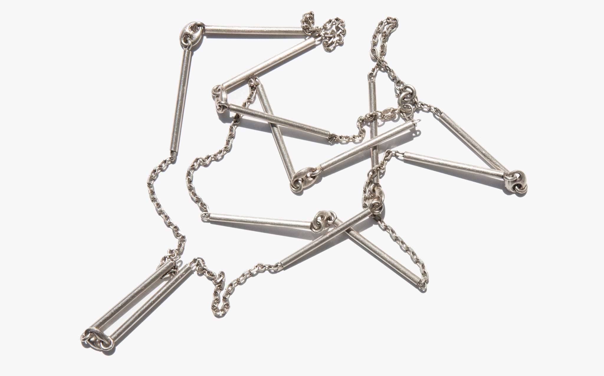 Interesting sterling silver link and bar chain that can be worn three ways – long and loose, shorter and doubled, or clipped to be tiered.