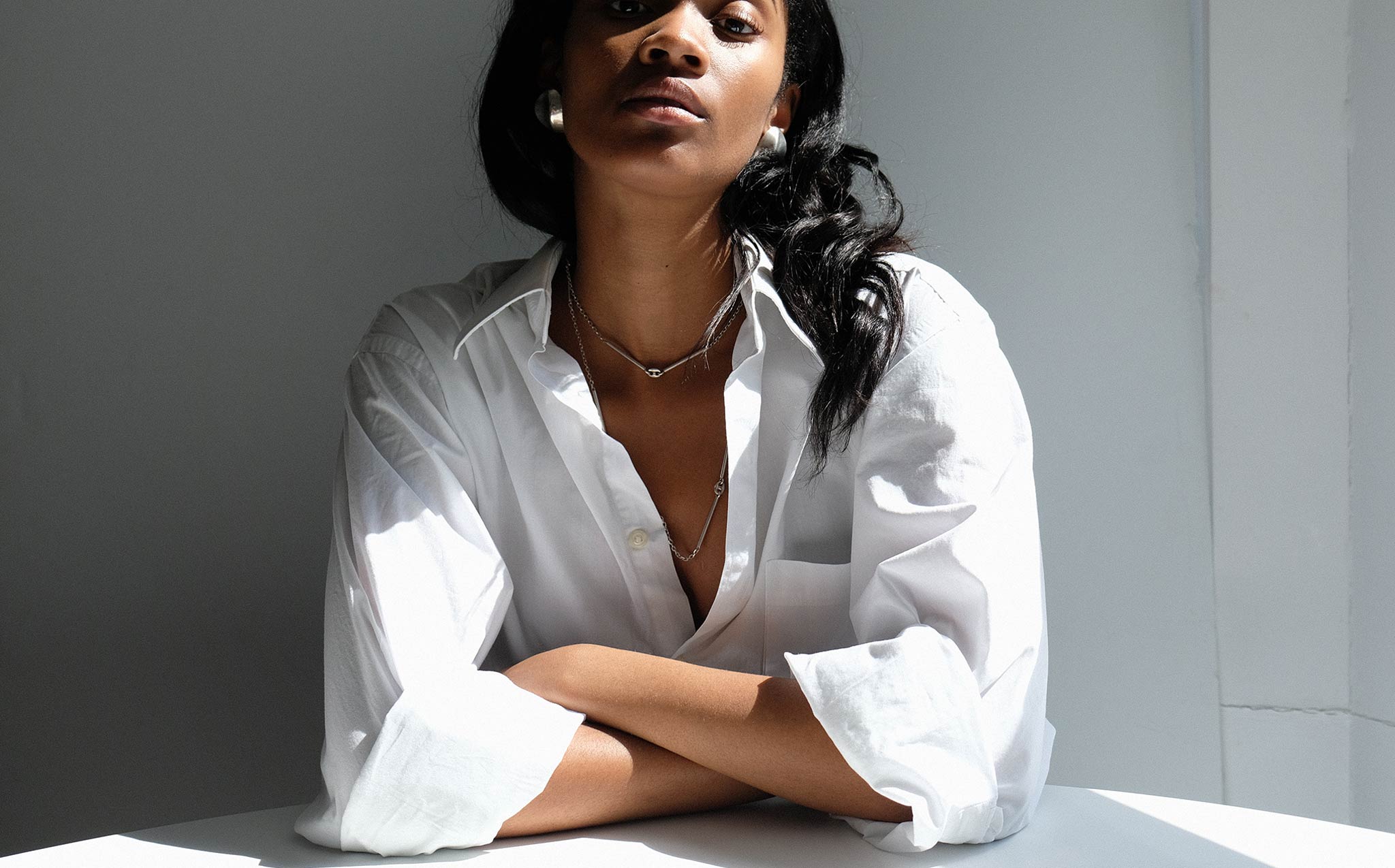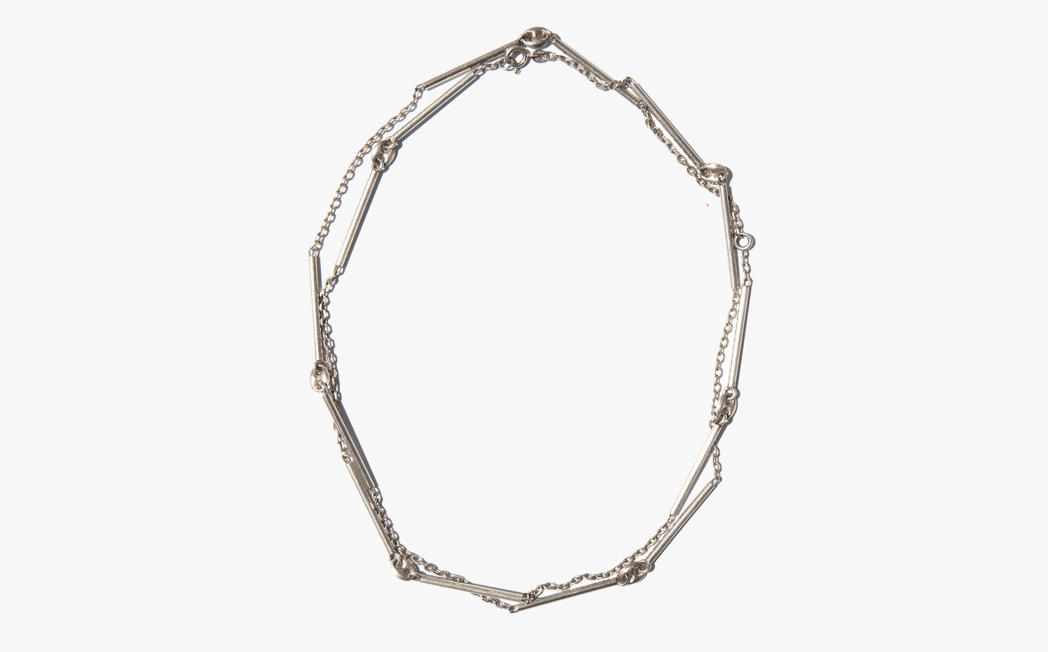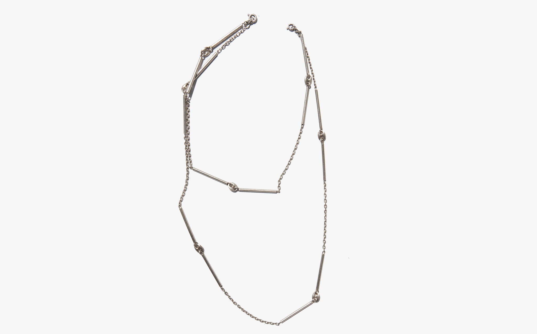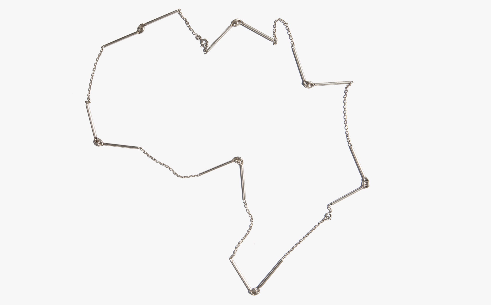 Interesting sterling silver link and bar chain that can be worn three ways – long and loose, shorter and doubled, or clipped to be tiered.