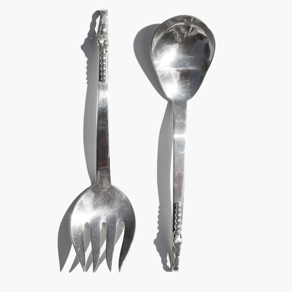 Weighty solid sterling silver serving utensils with intricate blossom detail on the handles. Marked with the eagle hallmark that started being applied to Mexican sterling silver in 1948 and signed F. Ramirez.
