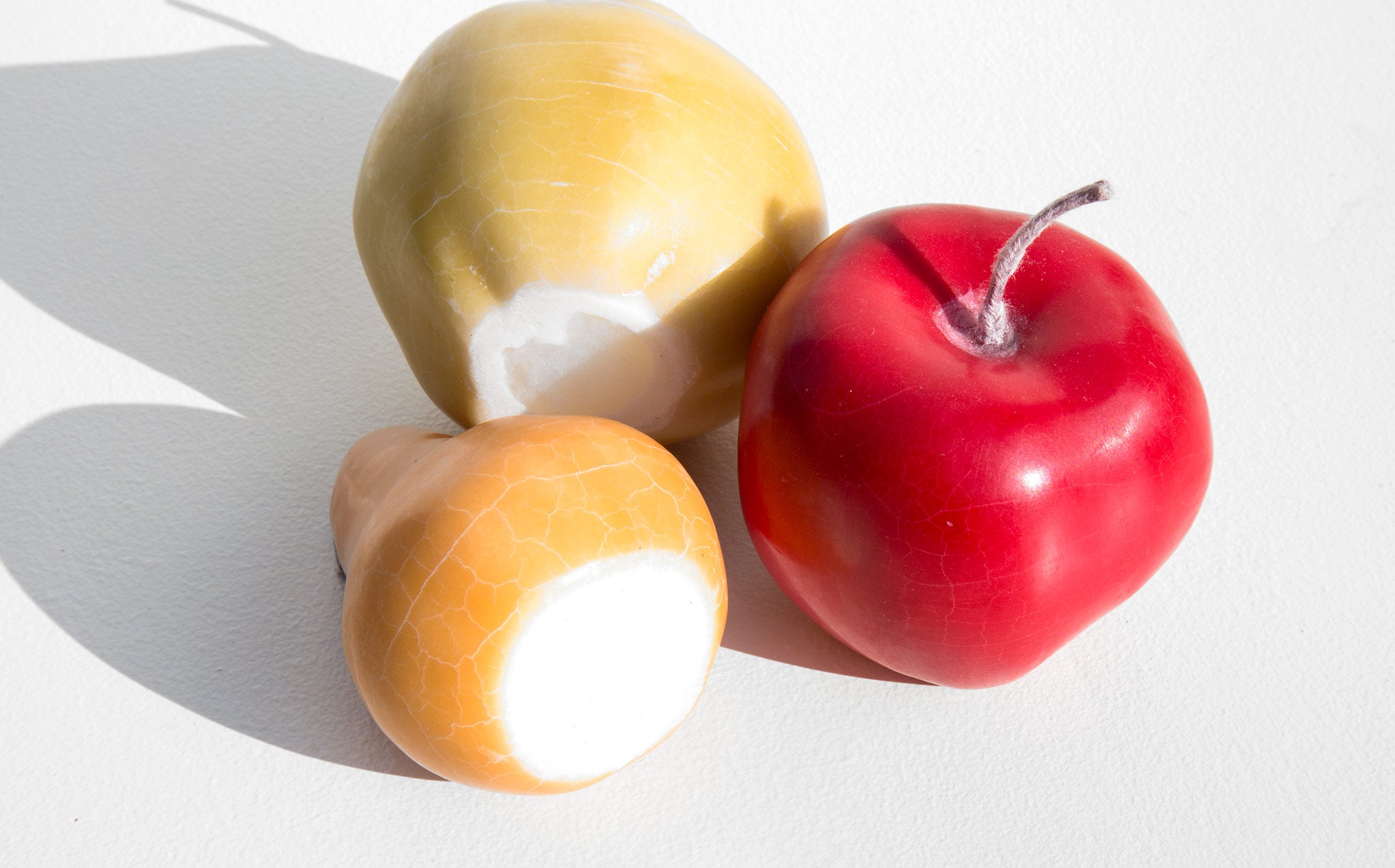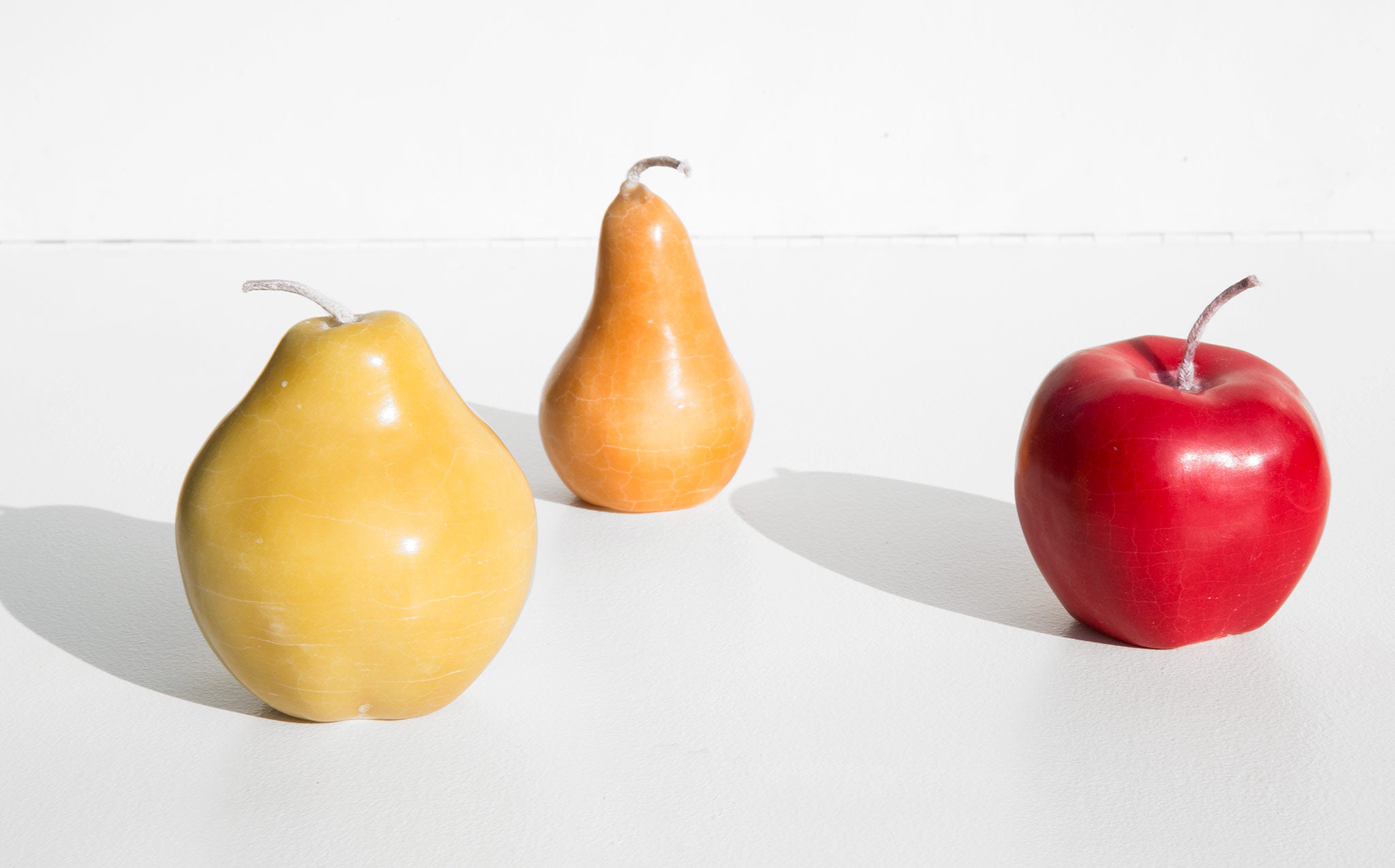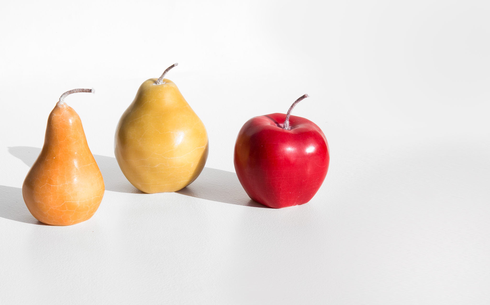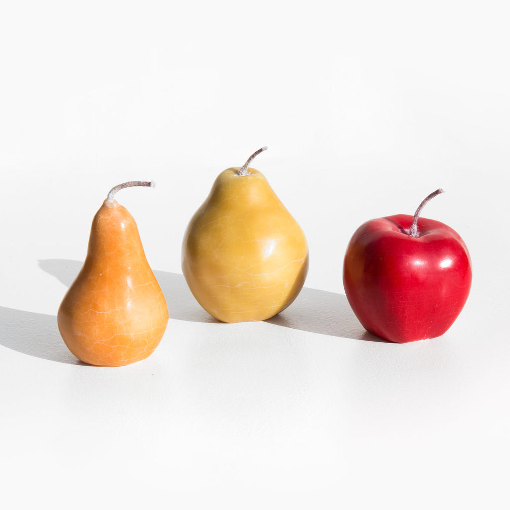 Set of 3 solid wax candles shaped as painterly fruit - a crisp red apple, delicate pale green anjou pear, and a bosc pear with hints of yellow and butterscotch.