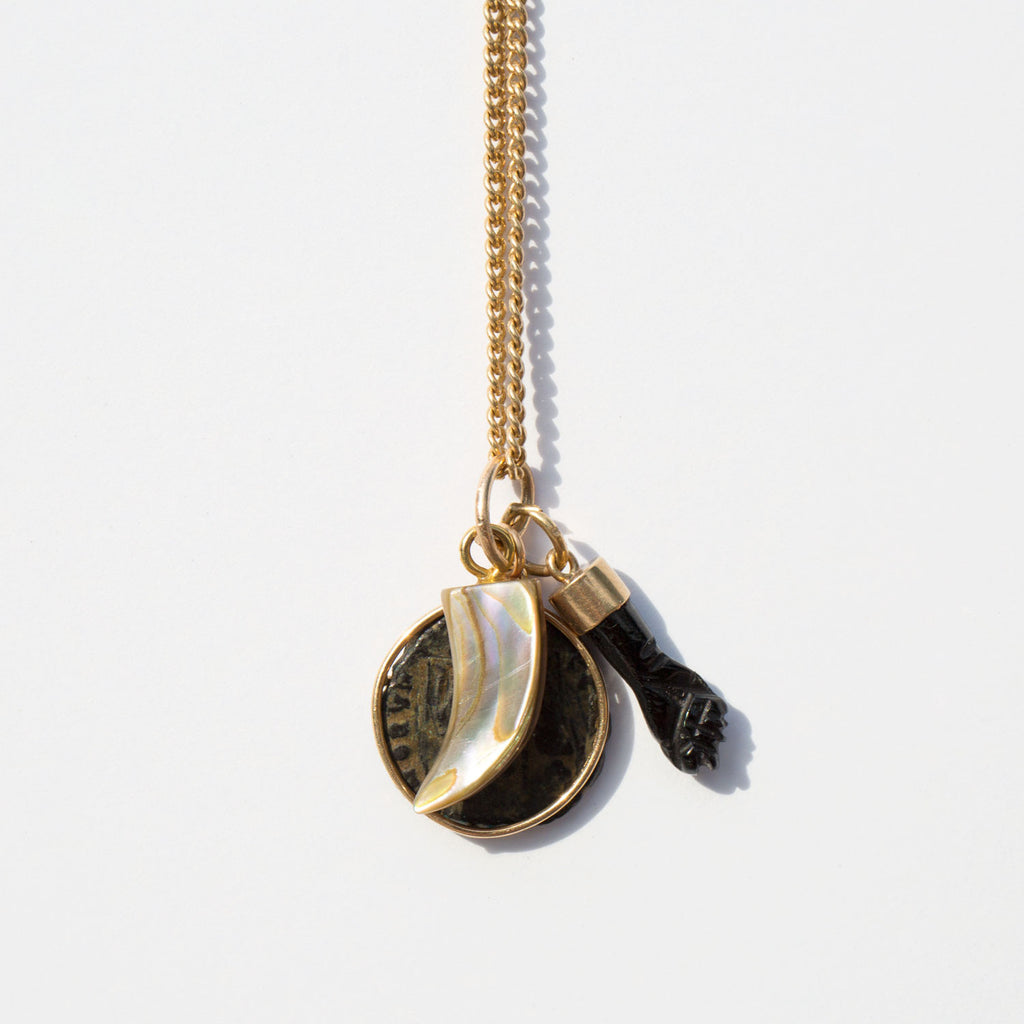 A simple and delicate 14k gold chain with a small cluster of charms used for protection from evil and to inspire strength in the wearer. Black coral and 14k mano figa charm, a coral and mother of pearl corno, and a small roman coin edged in 14k gold.