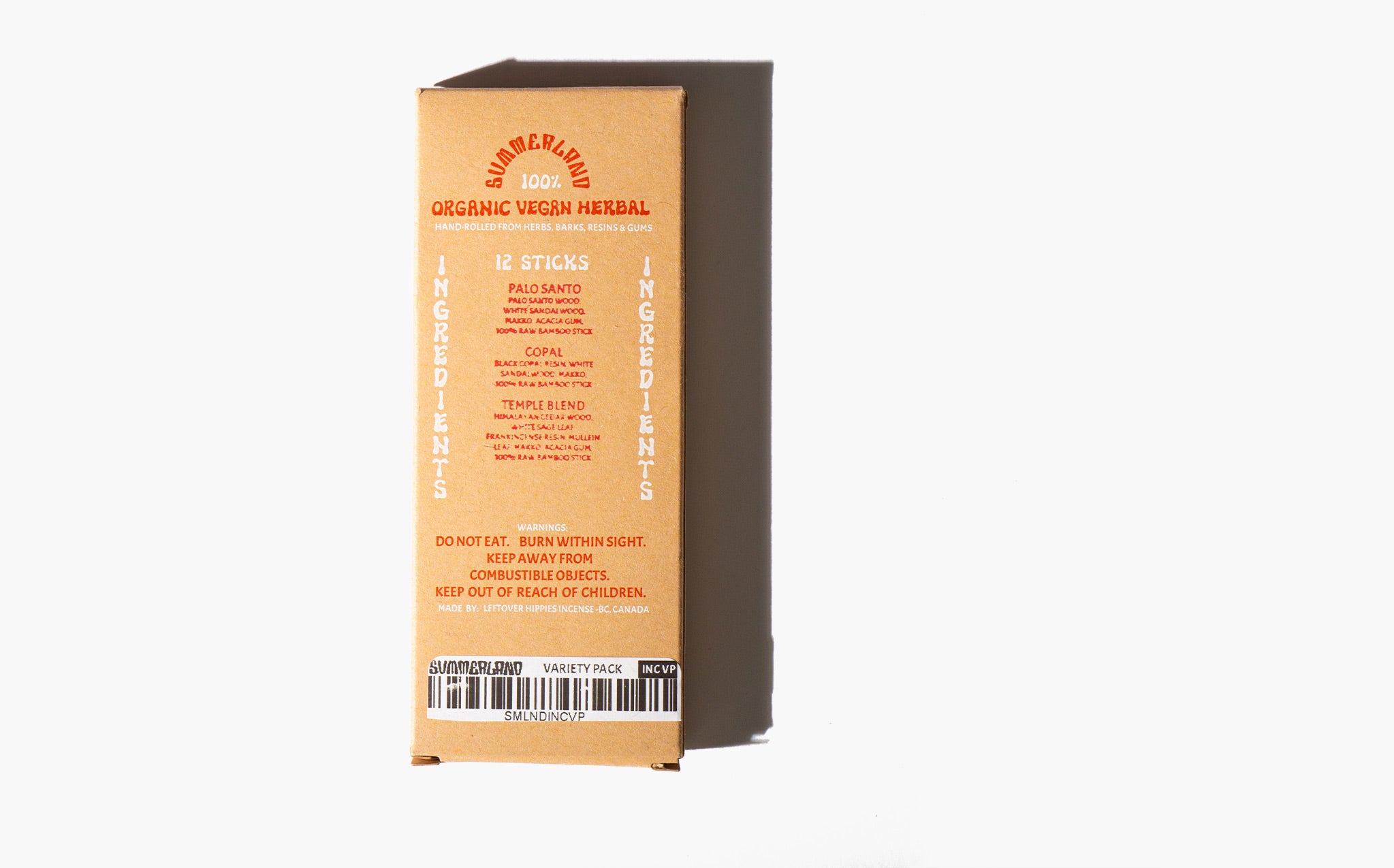 With deeply fragrant and almost mystical aroma profiles, each 4" incense stick in this 12-stick variety pack will burn for approximately 30 minutes. Hand-rolled in Canada from all natural ingredients, the pack contains three varieties of incense: Palo Santo, with palo santo wood, white sandalwood, makko, and acacia gum; Copal, with copal negro resin, white sandalwood, and makko; and the Temple Blend, with Himalayan cedar wood, white sage leaf, frankincense resin, mullein leaf, makko, and acacia gum.