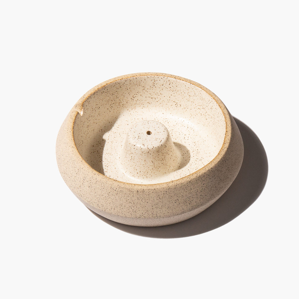 With a simple but multi-functional design, the Summerland Smoke Pot has a central incense prop to support an incense stick, and can also be used for burning wood, cone, or resin-based incense. The Smoke Pot also serves as an ashtray, with a notch on its rim and a glazed interior for easy cleaning. The exterior is raw clay for premium tactility and function.