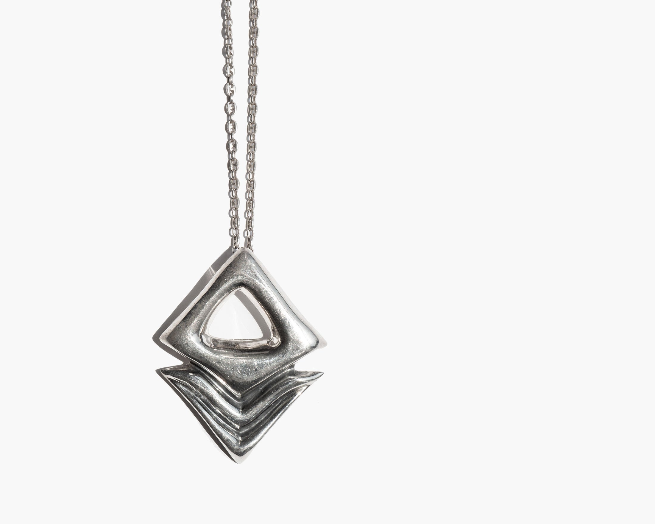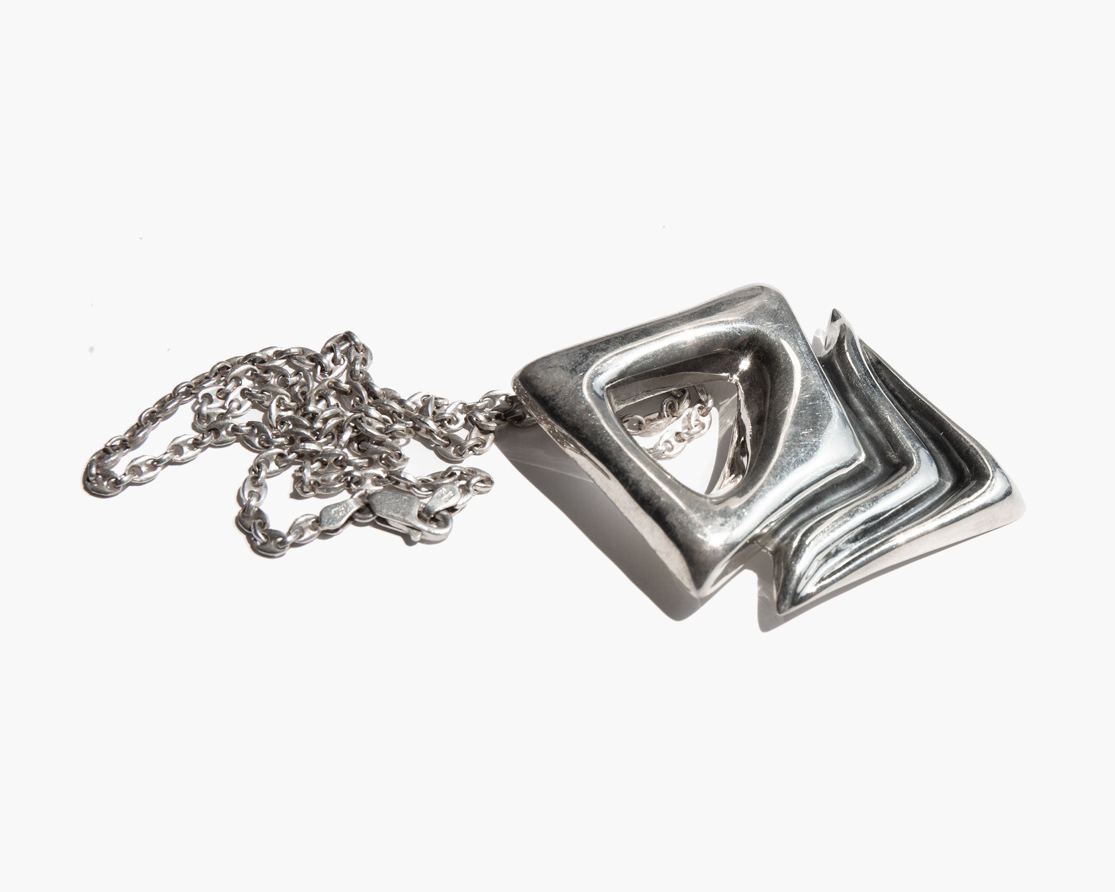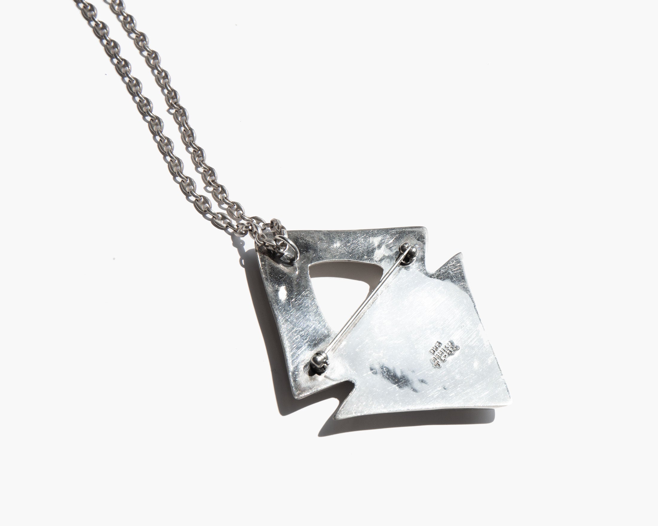 Sculptural Mexican sterling silver pendant on a sterling silver link chain. The pendant can be removed and worn as a pin or brooch.