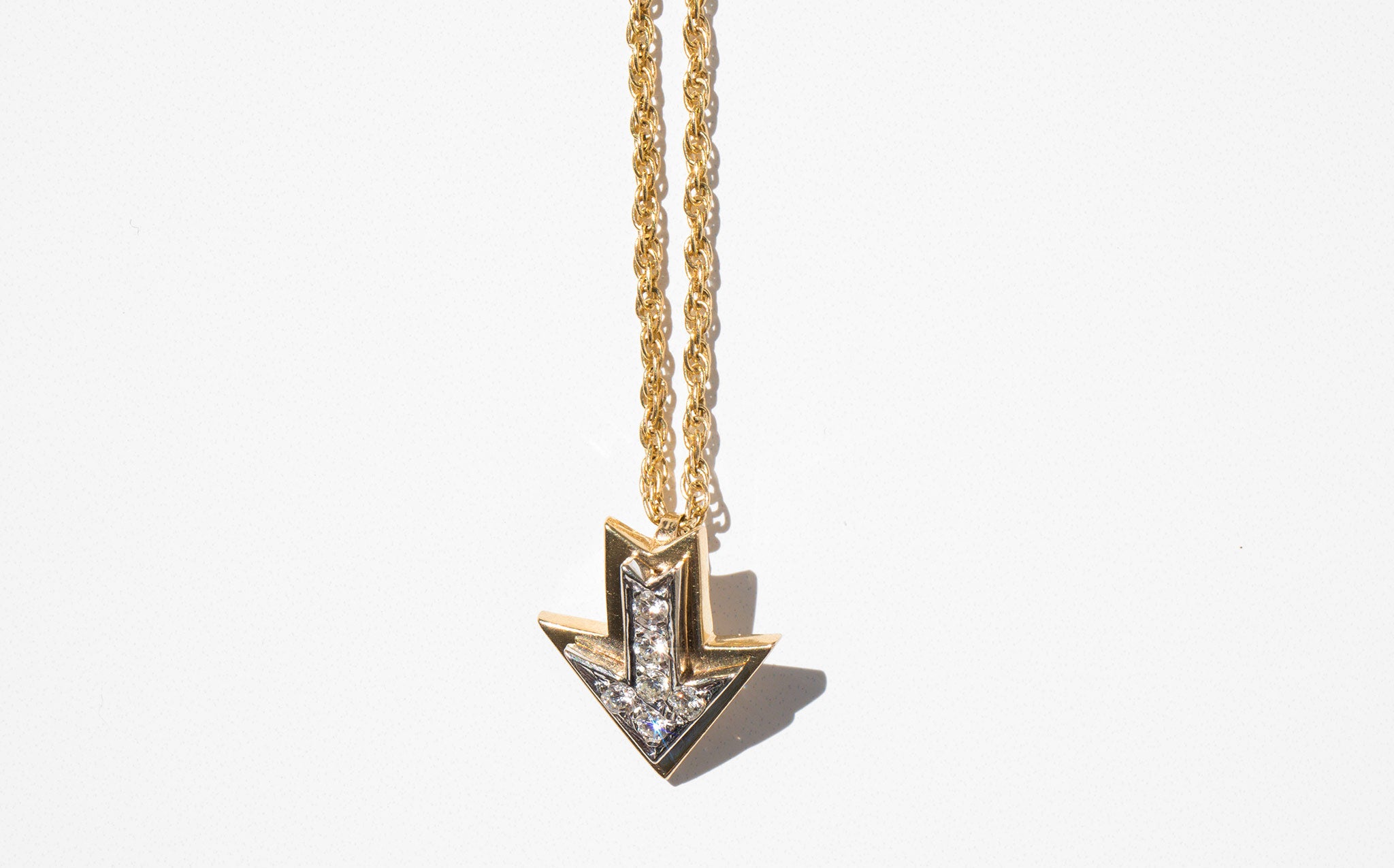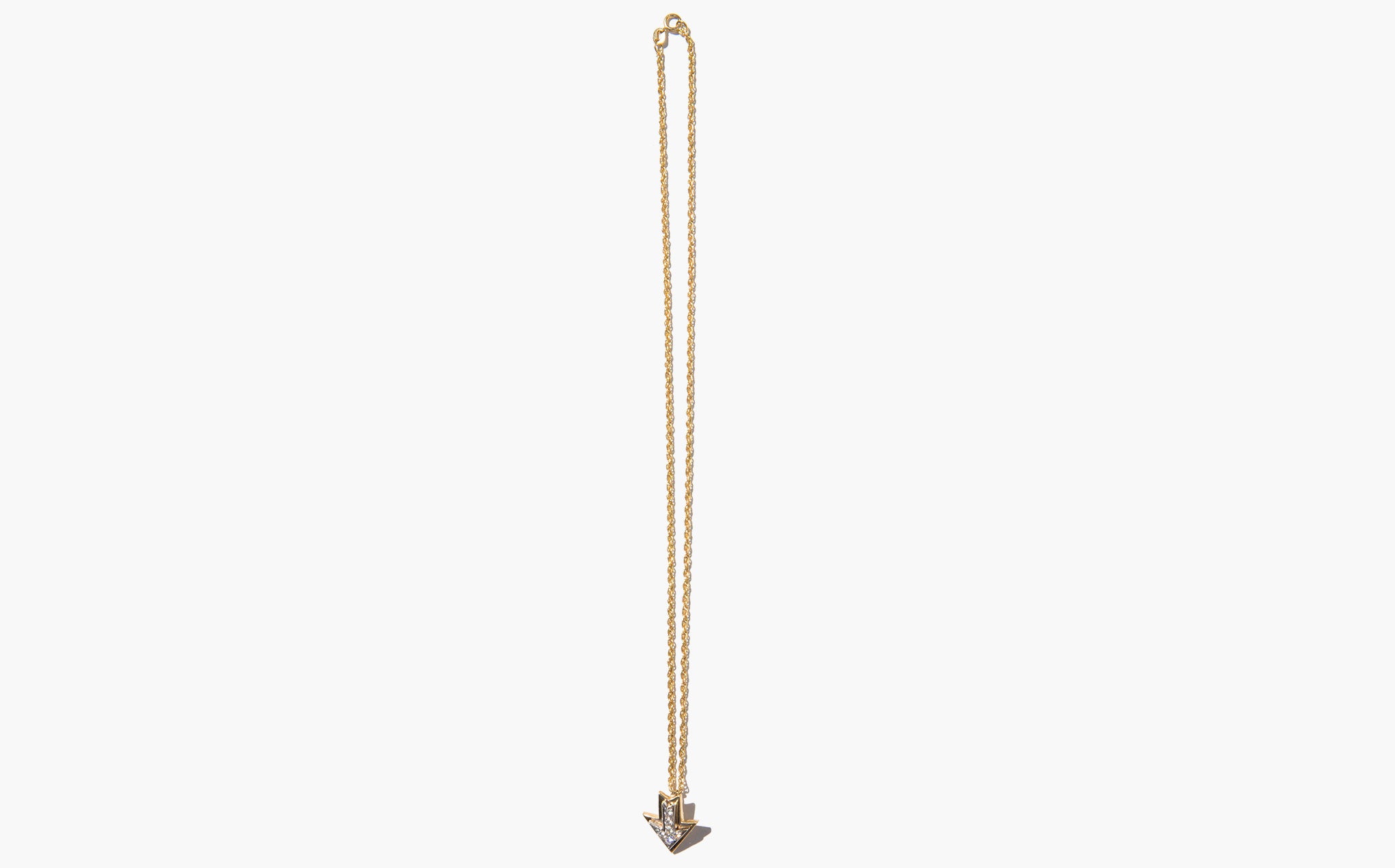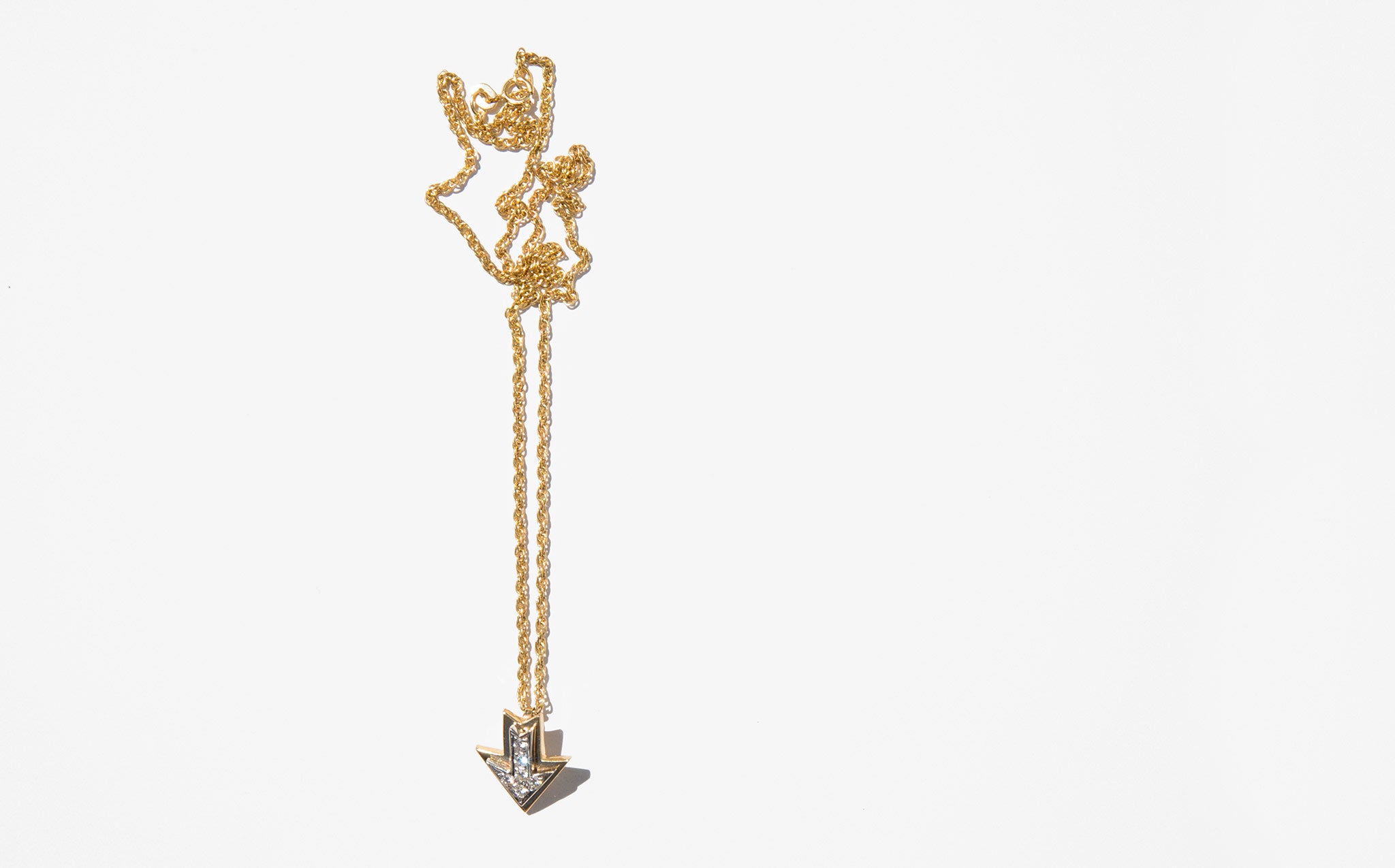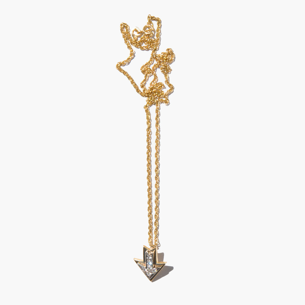 14k gold and diamond studded arrow charm on a 14k gold link chain. An arrow pointing down is known as a symbol of peace.