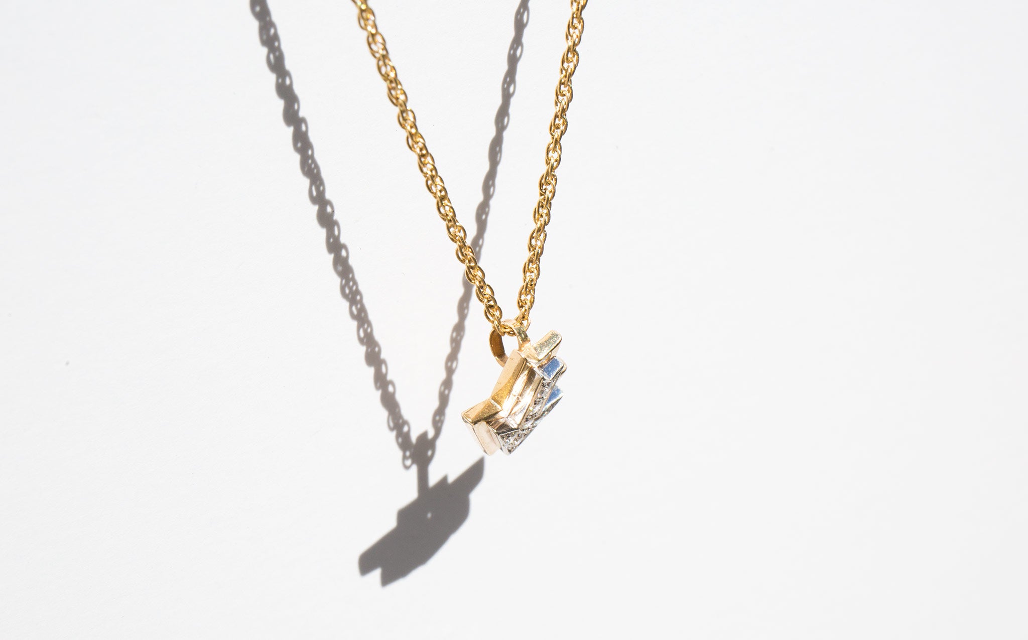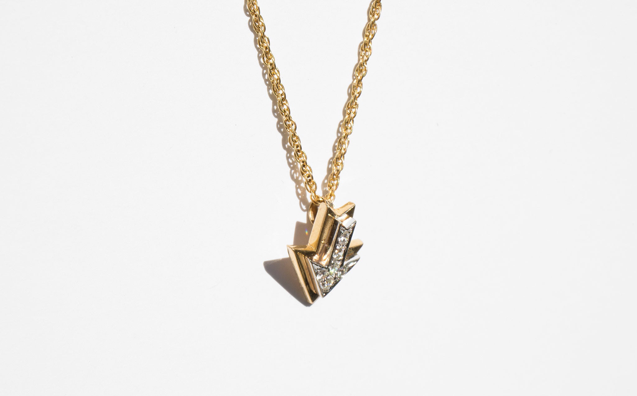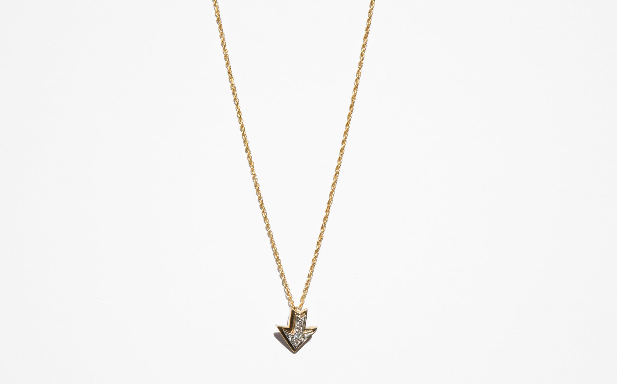 14k gold and diamond studded arrow charm on a 14k gold link chain. An arrow pointing down is known as a symbol of peace.
