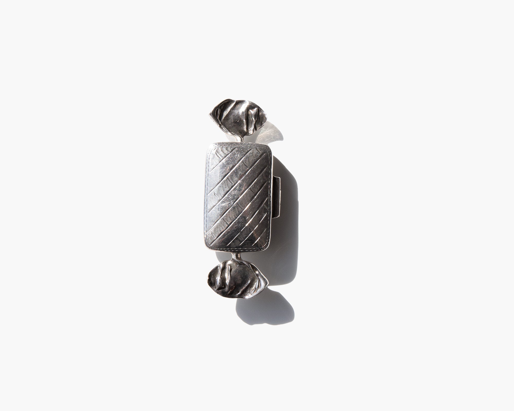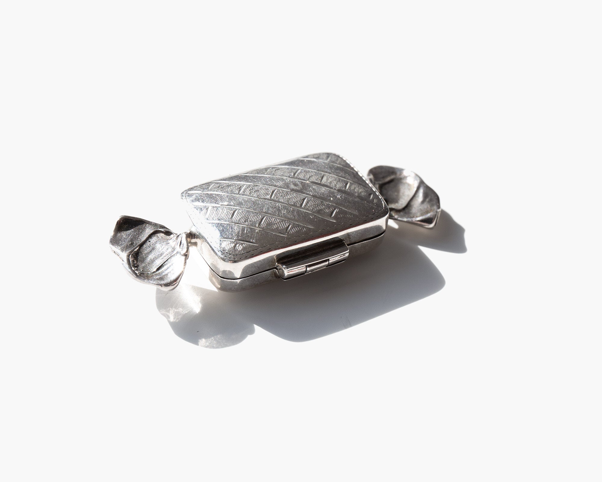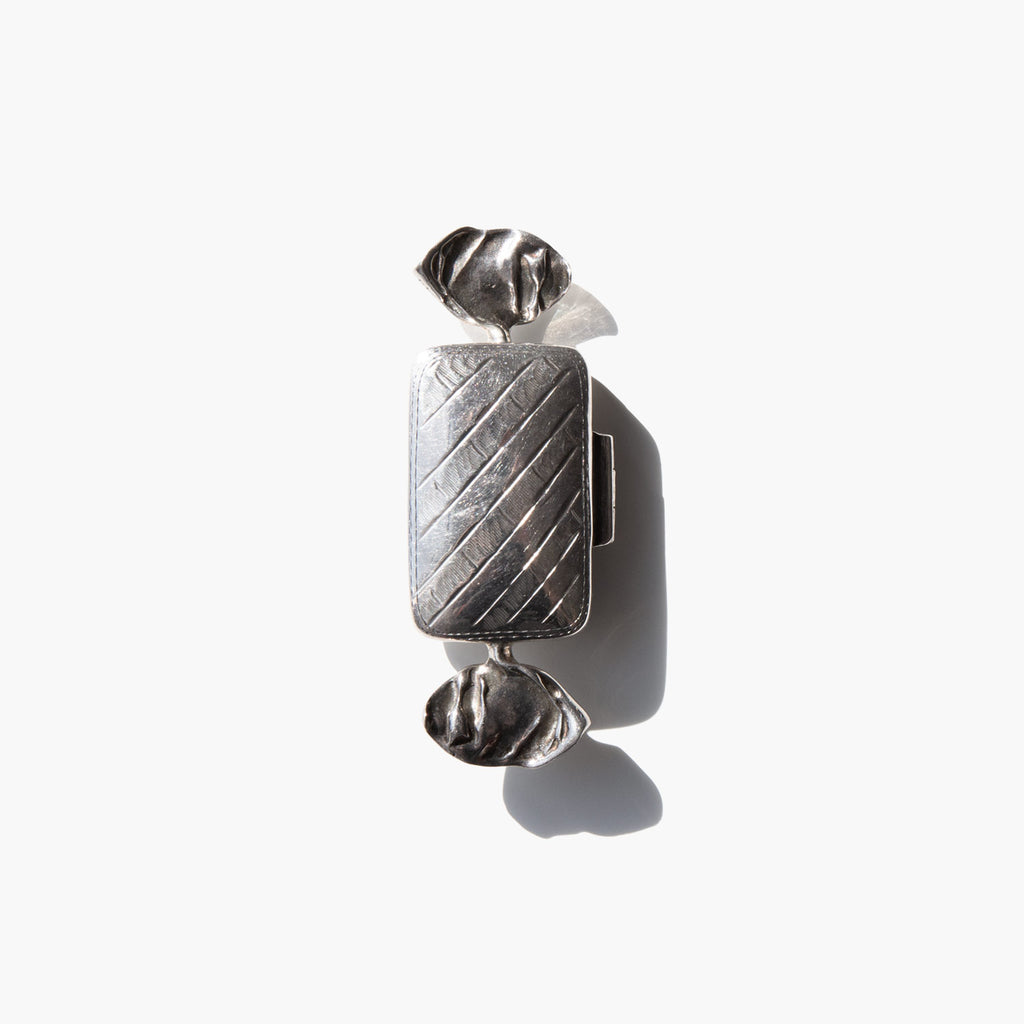 Small sterling silver box shaped like a wrapped candy.