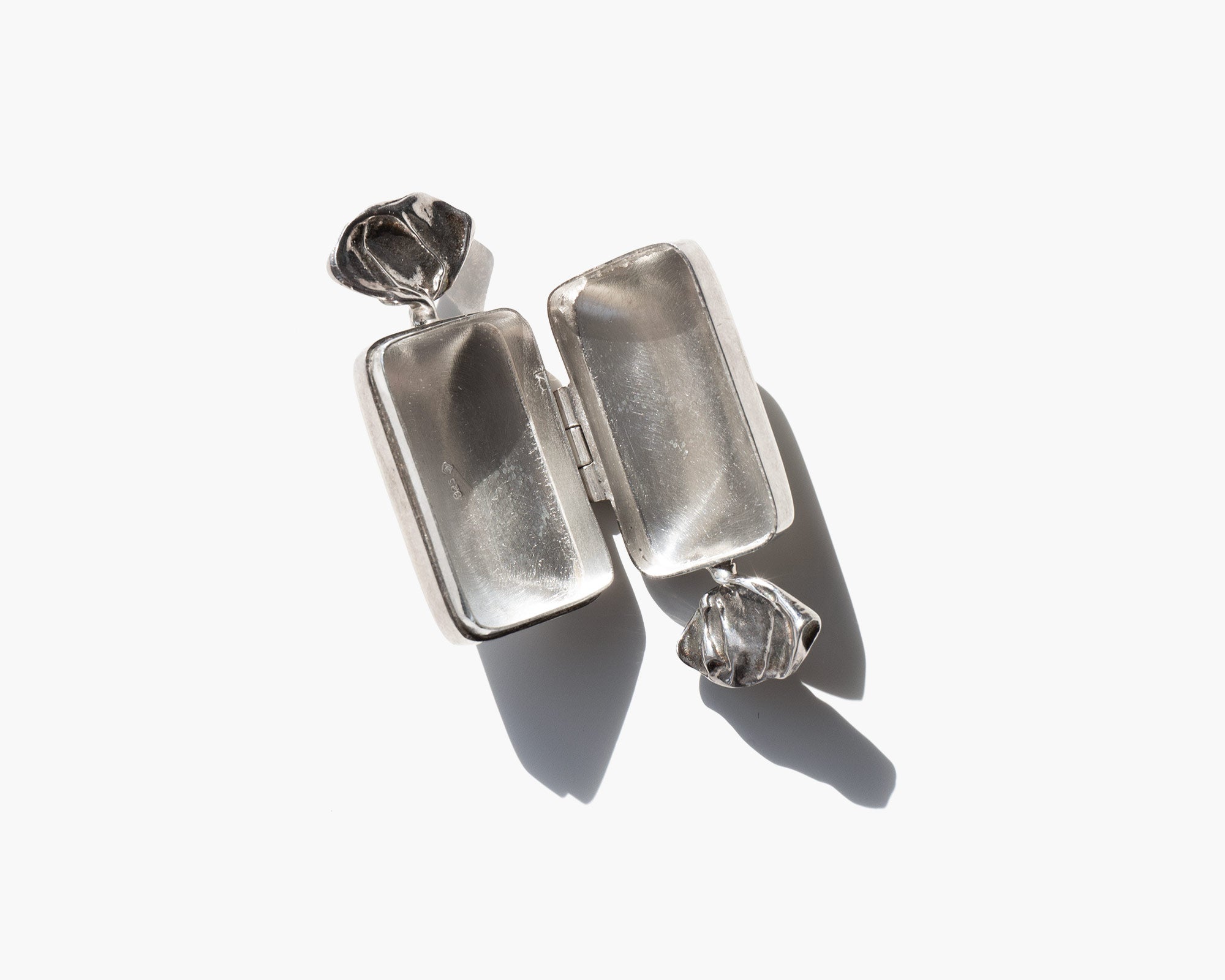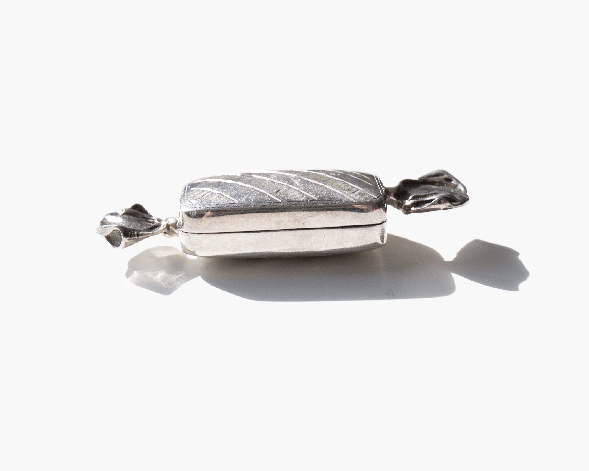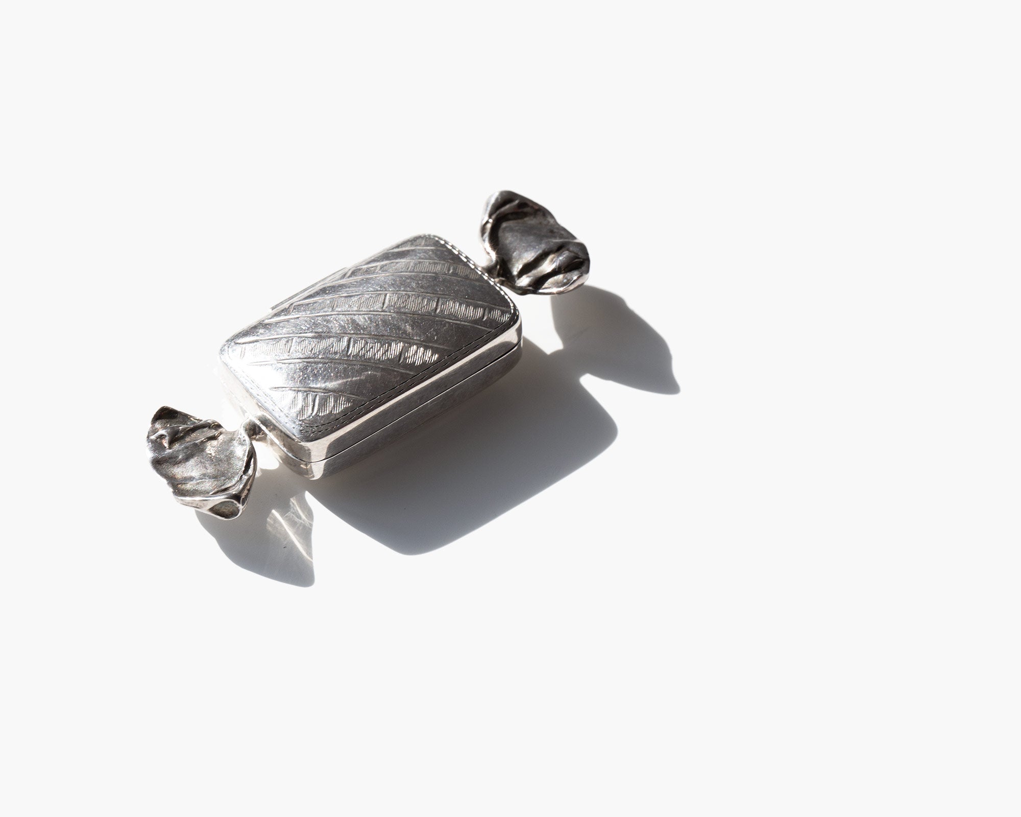 Small sterling silver box shaped like a wrapped candy.