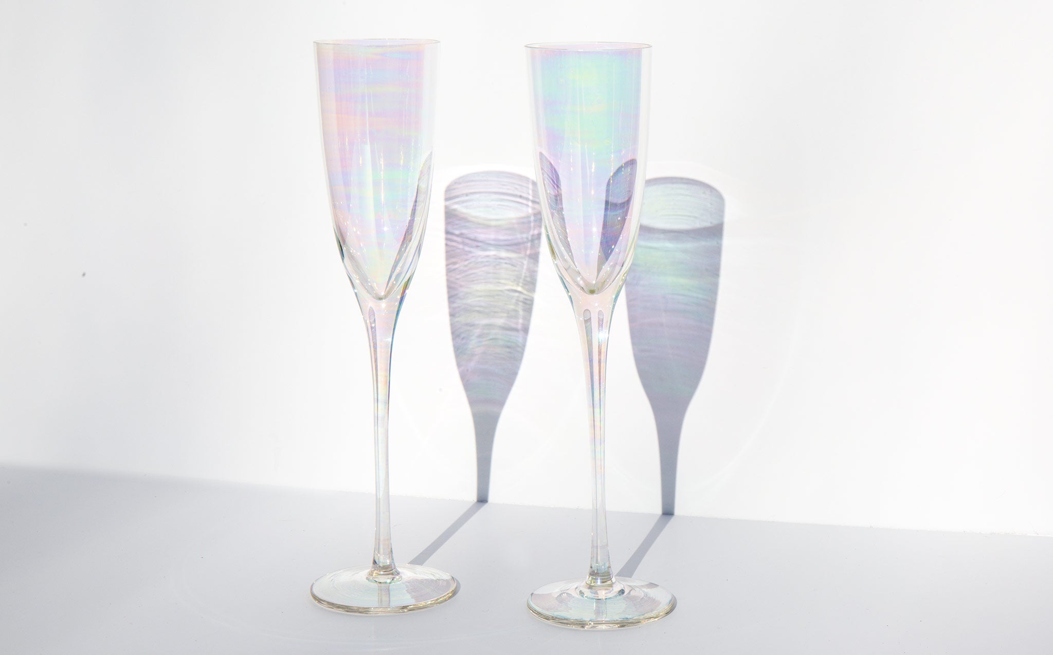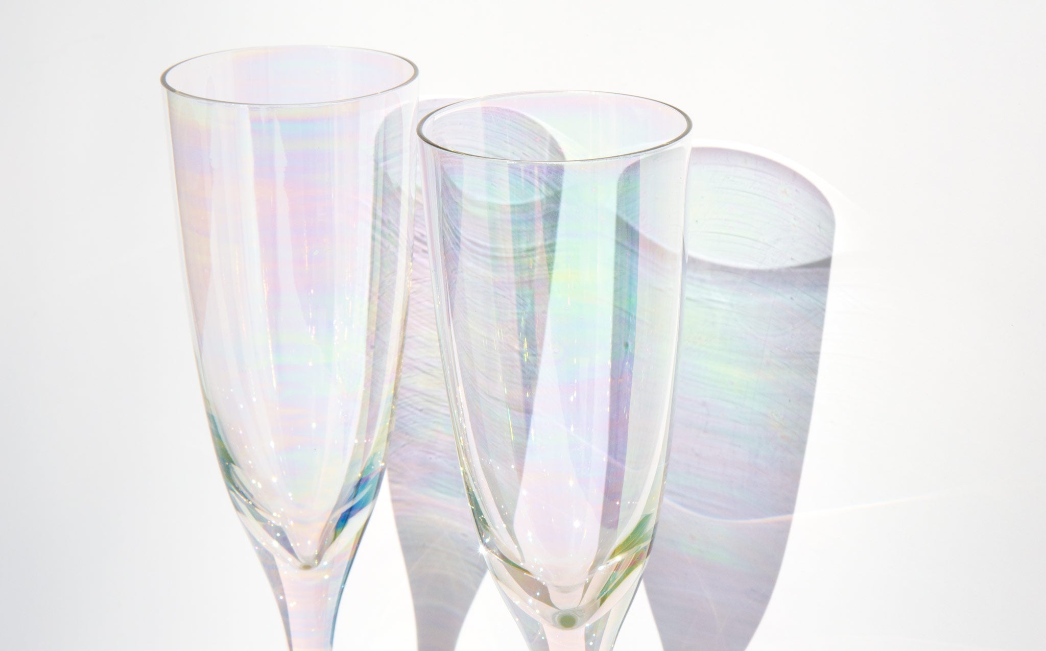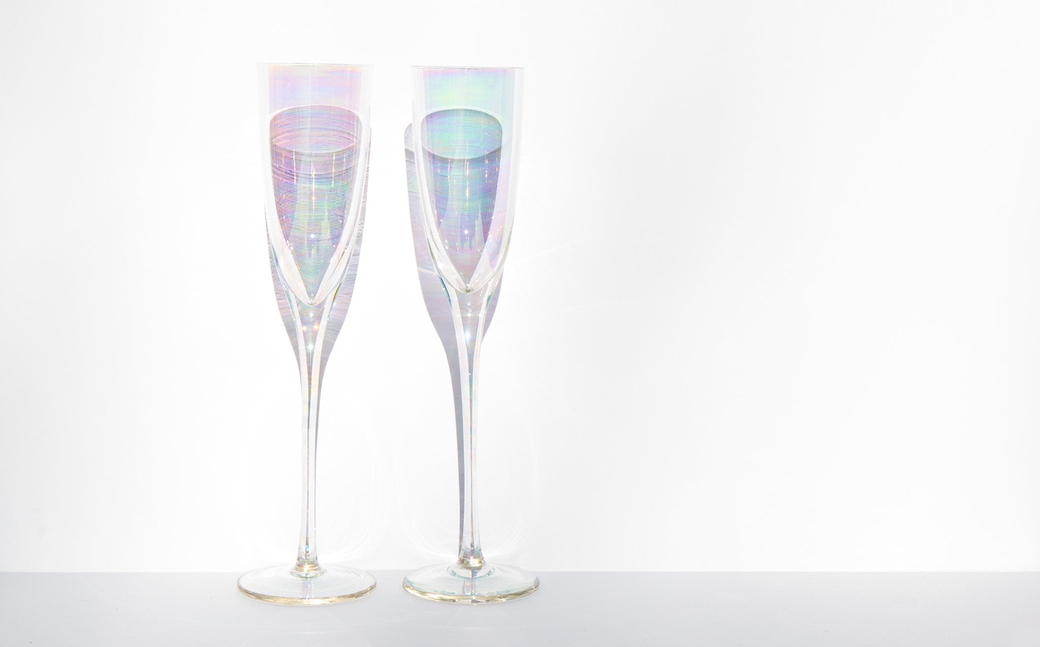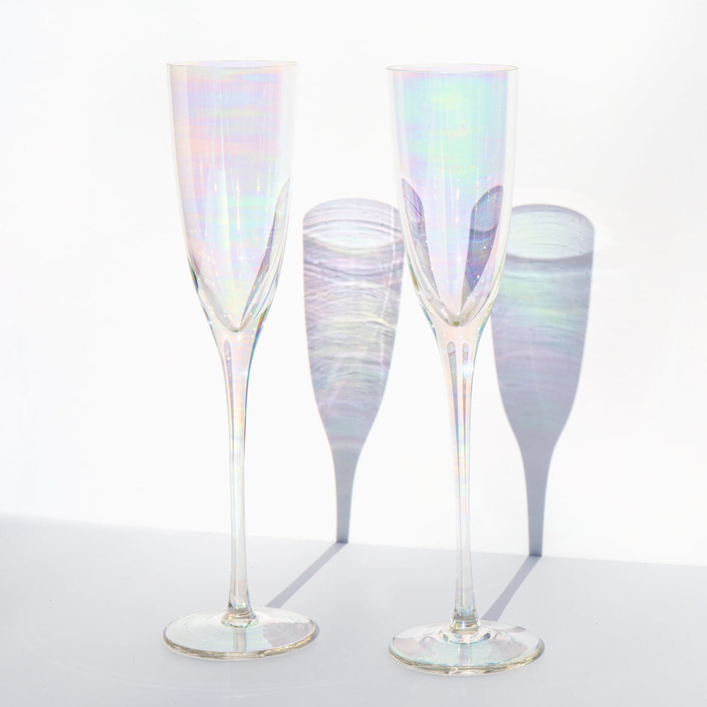 Set of 2 mother of pearl hued iridescent champagne glasses.