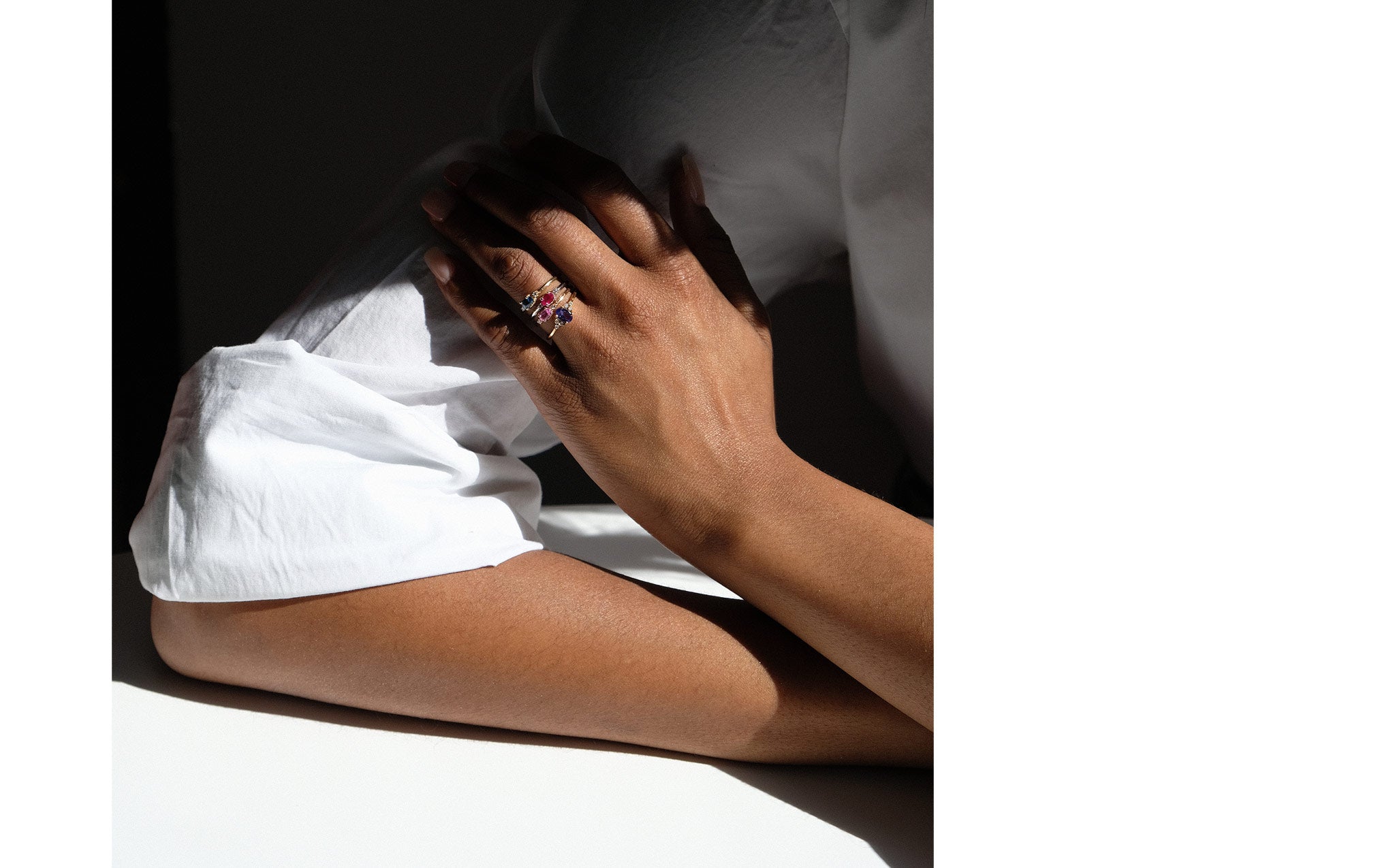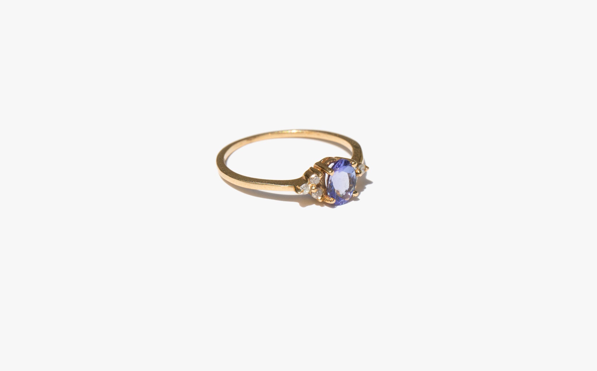Pale lavender faceted tanzanite flanked by small diamond clusters in a simple 14k gold band. A chic and pretty accent alone and stacks beautifully with other sweetheart rings. A stone of connection, tanzanite is calming and is associated with empathy, open-mindedness, and overcoming communication breakdowns.