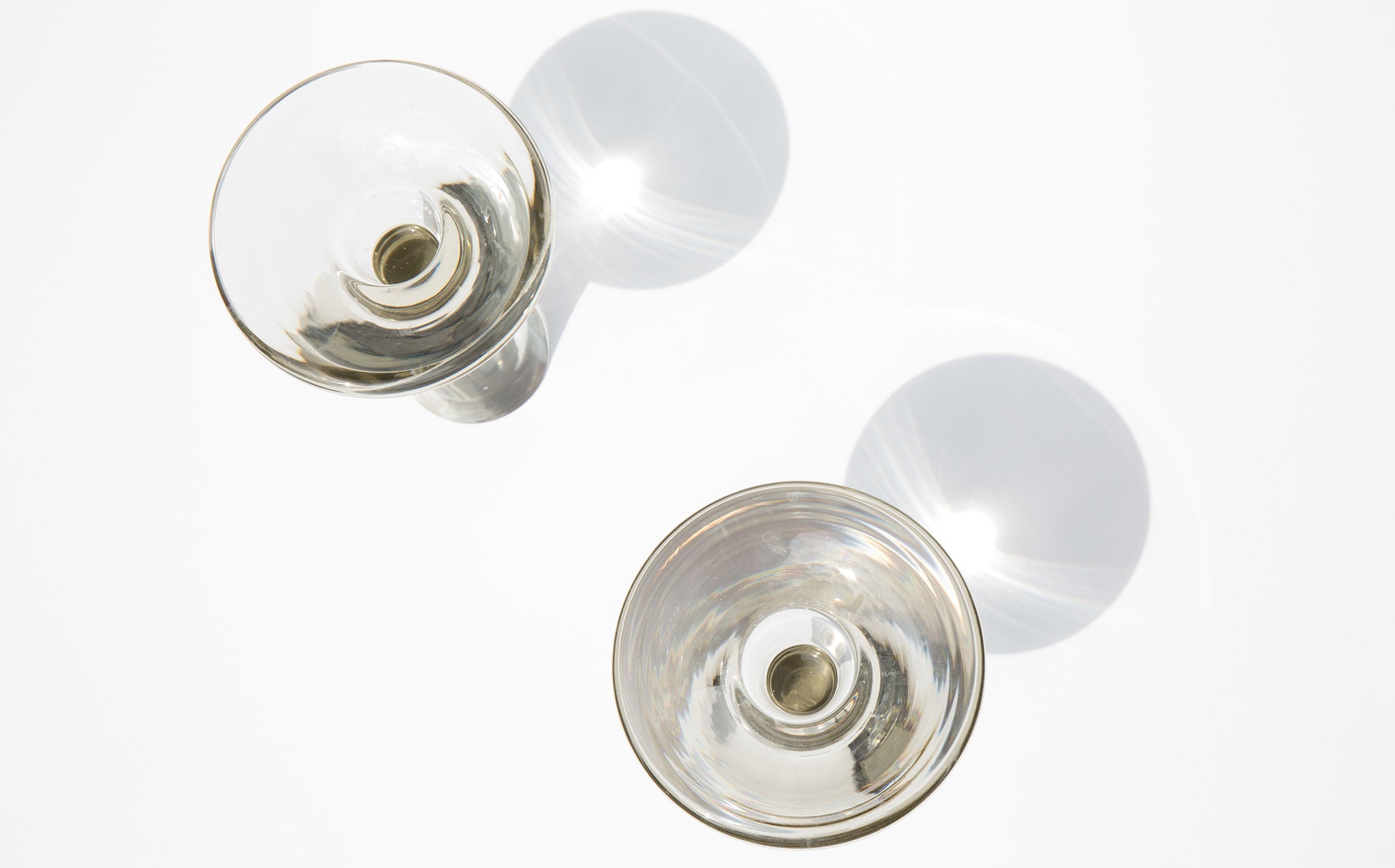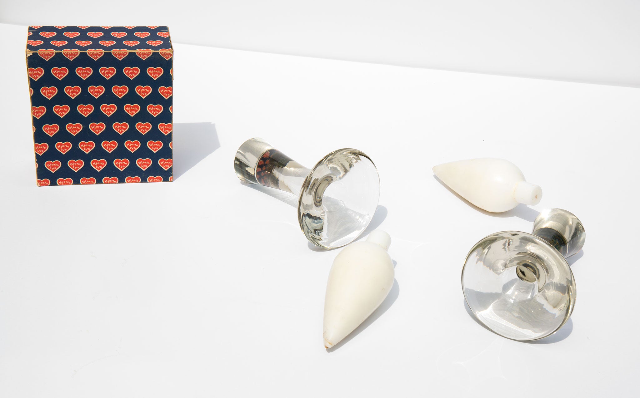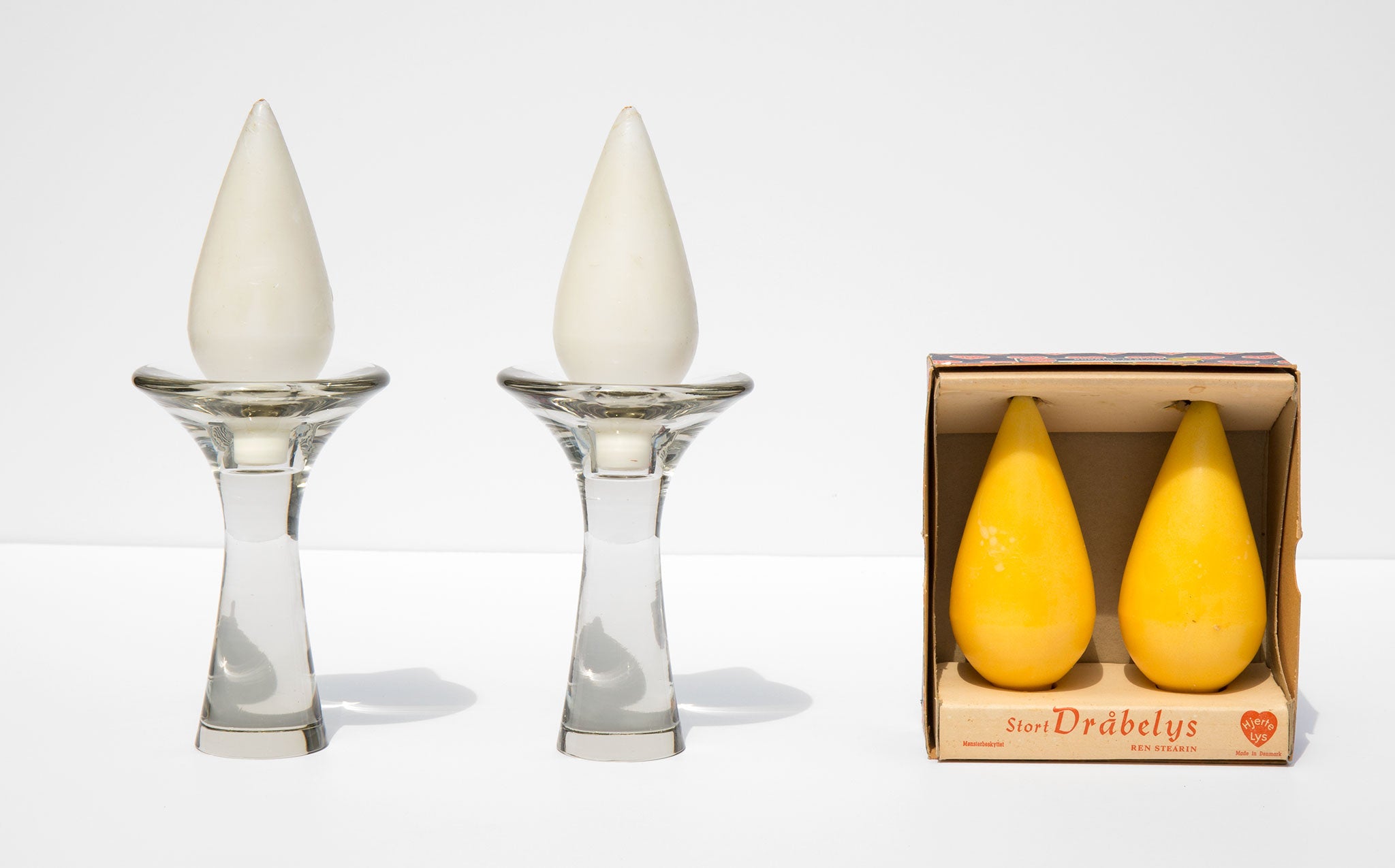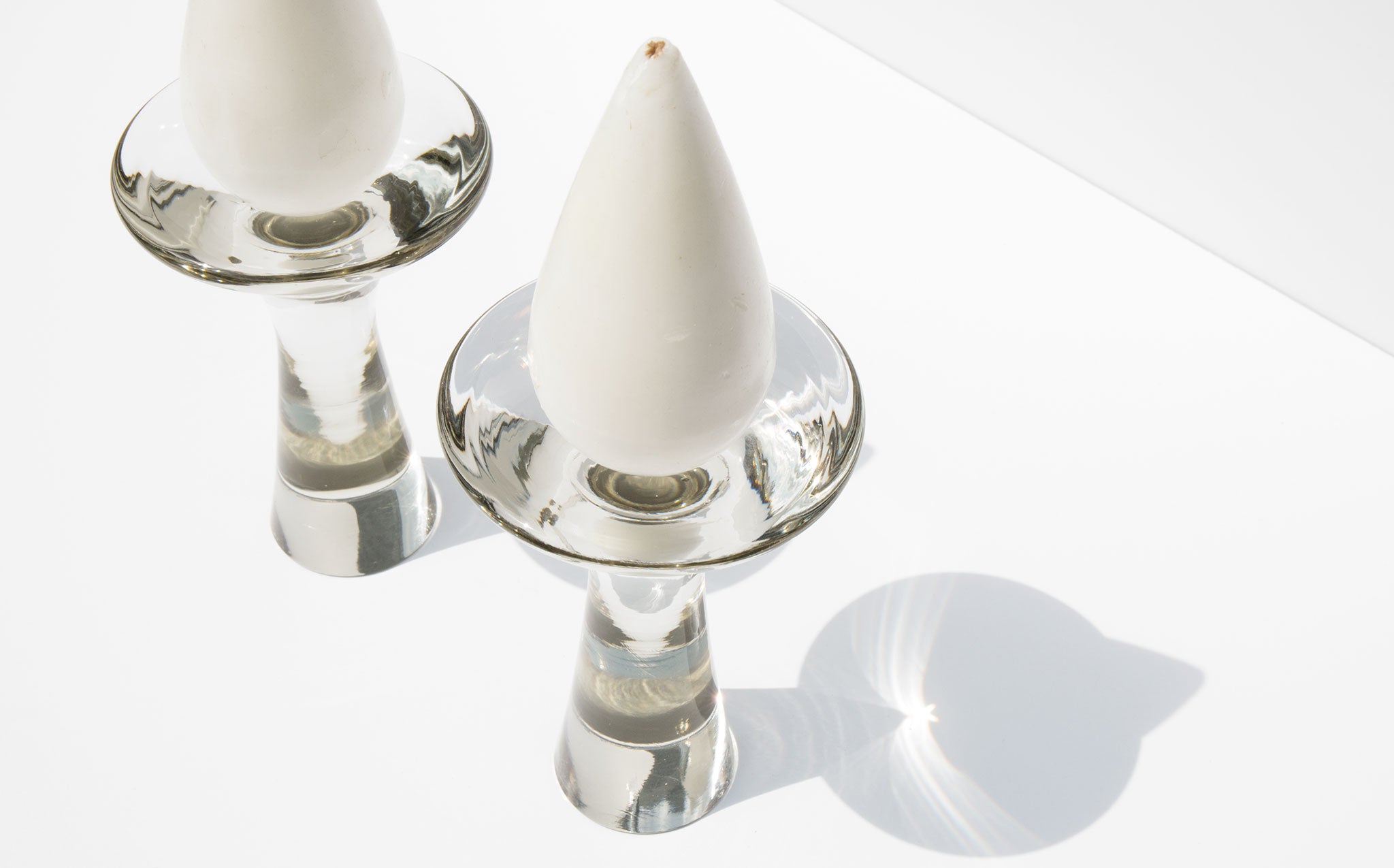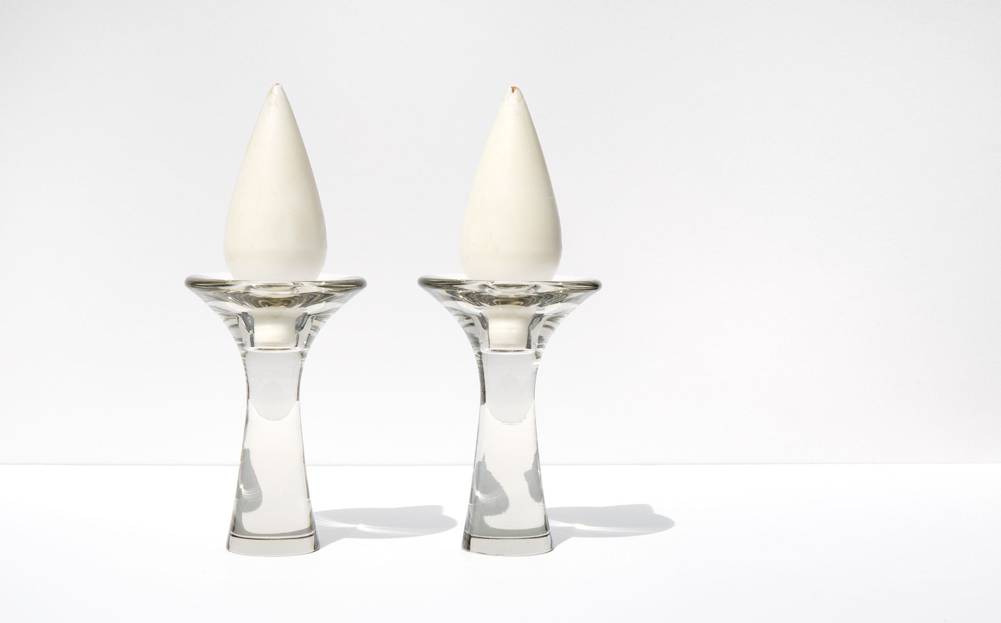 A leading figure of modern Finnish industrial art, Tapio Wirkkala designed these glass candlesticks for Littala in 1954. Candlesticks are signed and two sets of the original Stort Drabelys tear drop shaped candles are included.